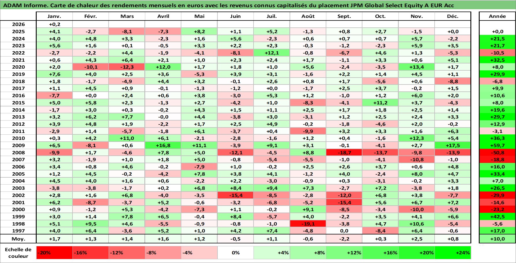 Site dédié aux investisseursPage dédiée sur site financeAnalyse des valorisations hebdomadaires du fonds JPM Global Select Equity A EUR Acc. Cet actif est cote en EUR. Les valorisations couvrent les semaines 1997W01 a 2026W05. Les revenus de cet actif financier sont pris en compte depuis la semaine 1997W01. La note ESG de cet actif n'est pas connue.