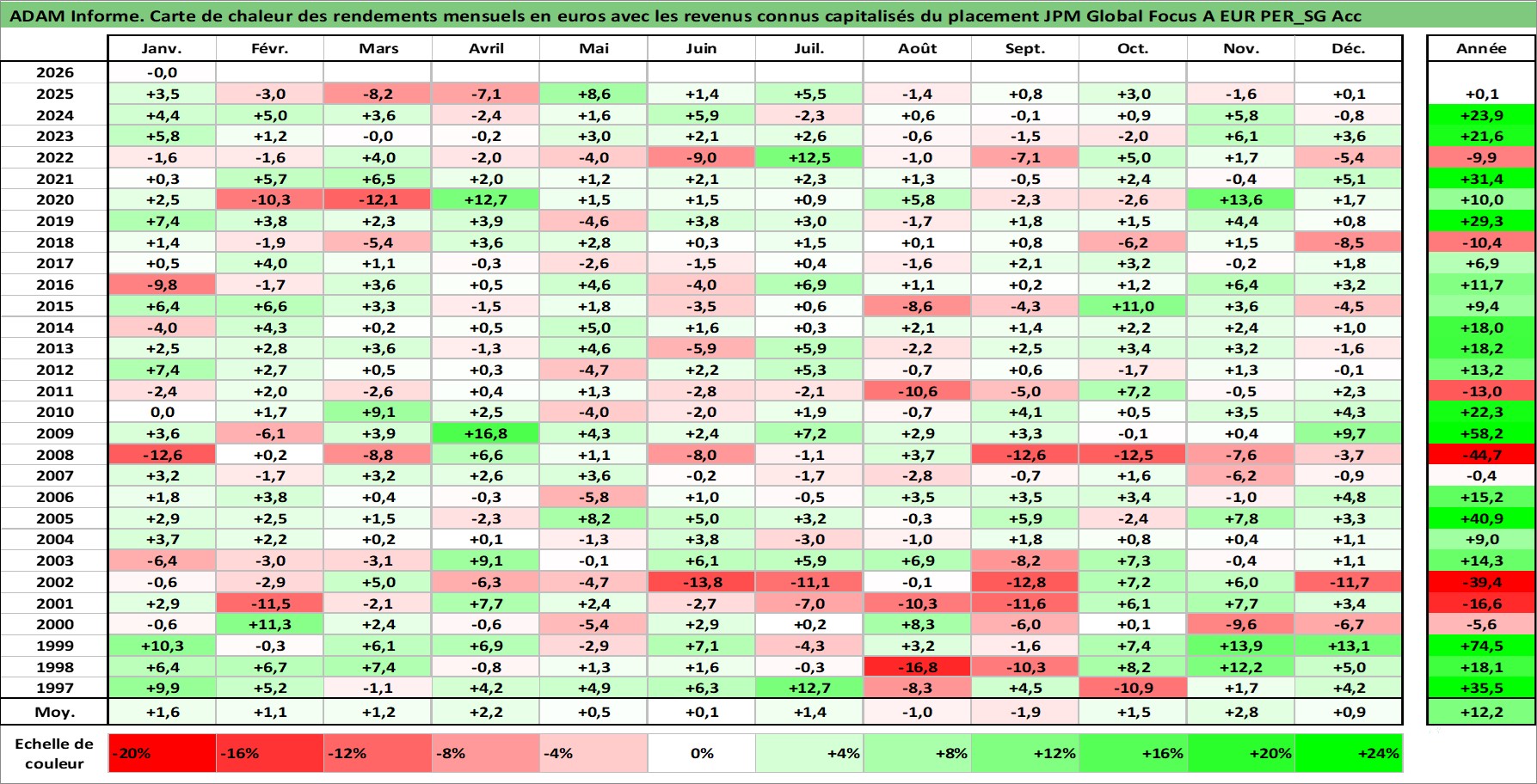 Site dédié aux investisseursPage dédiée sur site financeAnalyse des valorisations hebdomadaires du fonds JPM Global Focus A EUR PER_SG Acc. Cet actif est cote en EUR. Les valorisations couvrent les semaines 1997W01 a 2026W05. Les revenus de cet actif financier sont pris en compte depuis la semaine 1997W01. La note ESG de cet actif n'est pas connue.