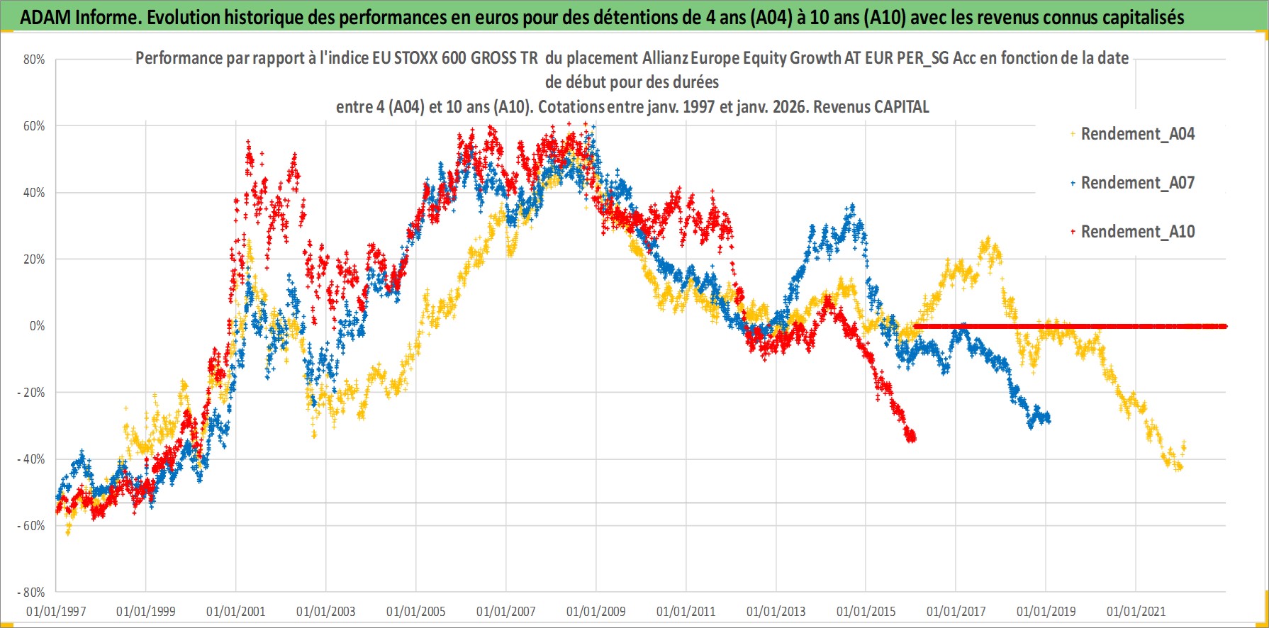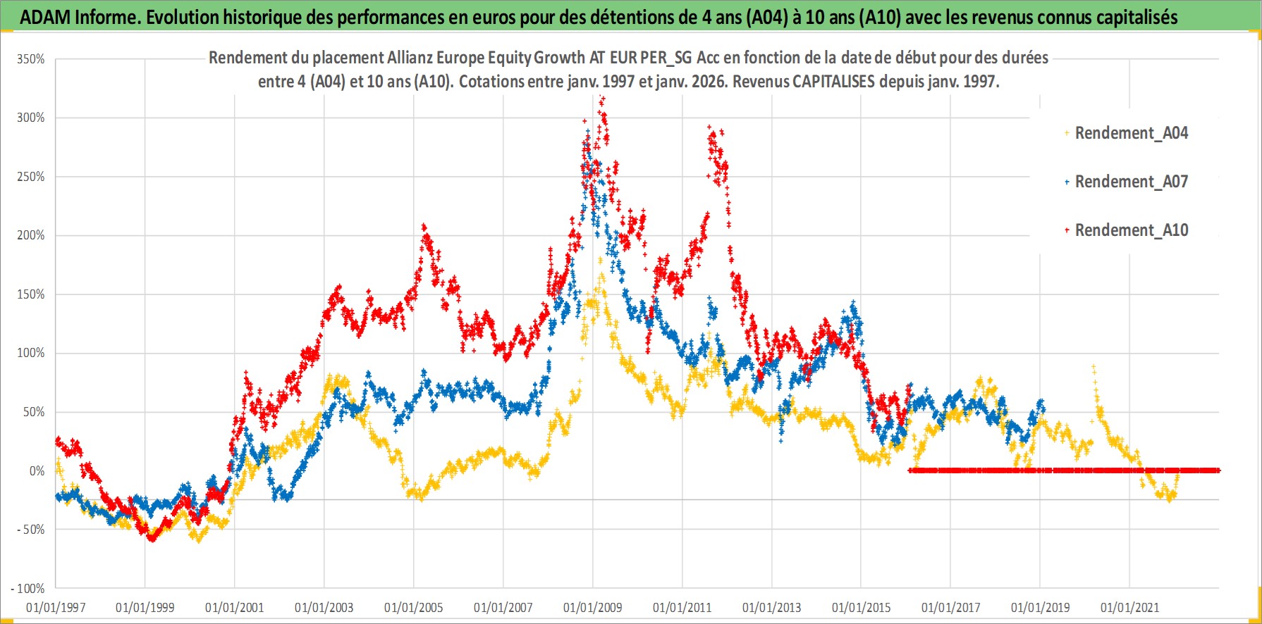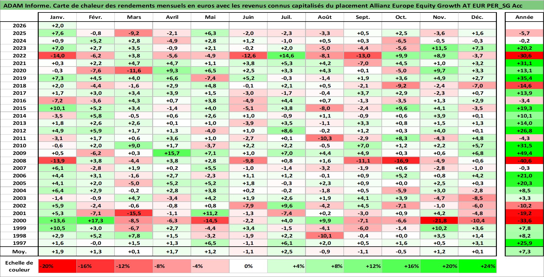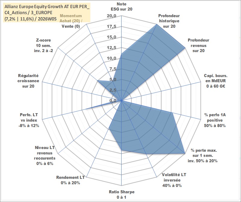 Site dédié aux investisseursPage dédiée sur site financeAnalyse des valorisations hebdomadaires du fonds Allianz Europe Equity Growth AT EUR PER_SG Acc. Cet actif est cote en EUR. Les valorisations couvrent les semaines 1997W01 a 2026W05. Les revenus de cet actif financier sont pris en compte depuis la semaine 1997W01. La note globale ESG de cet actif est estimee a 11.0 (apres rebasage entre 0 et 20).