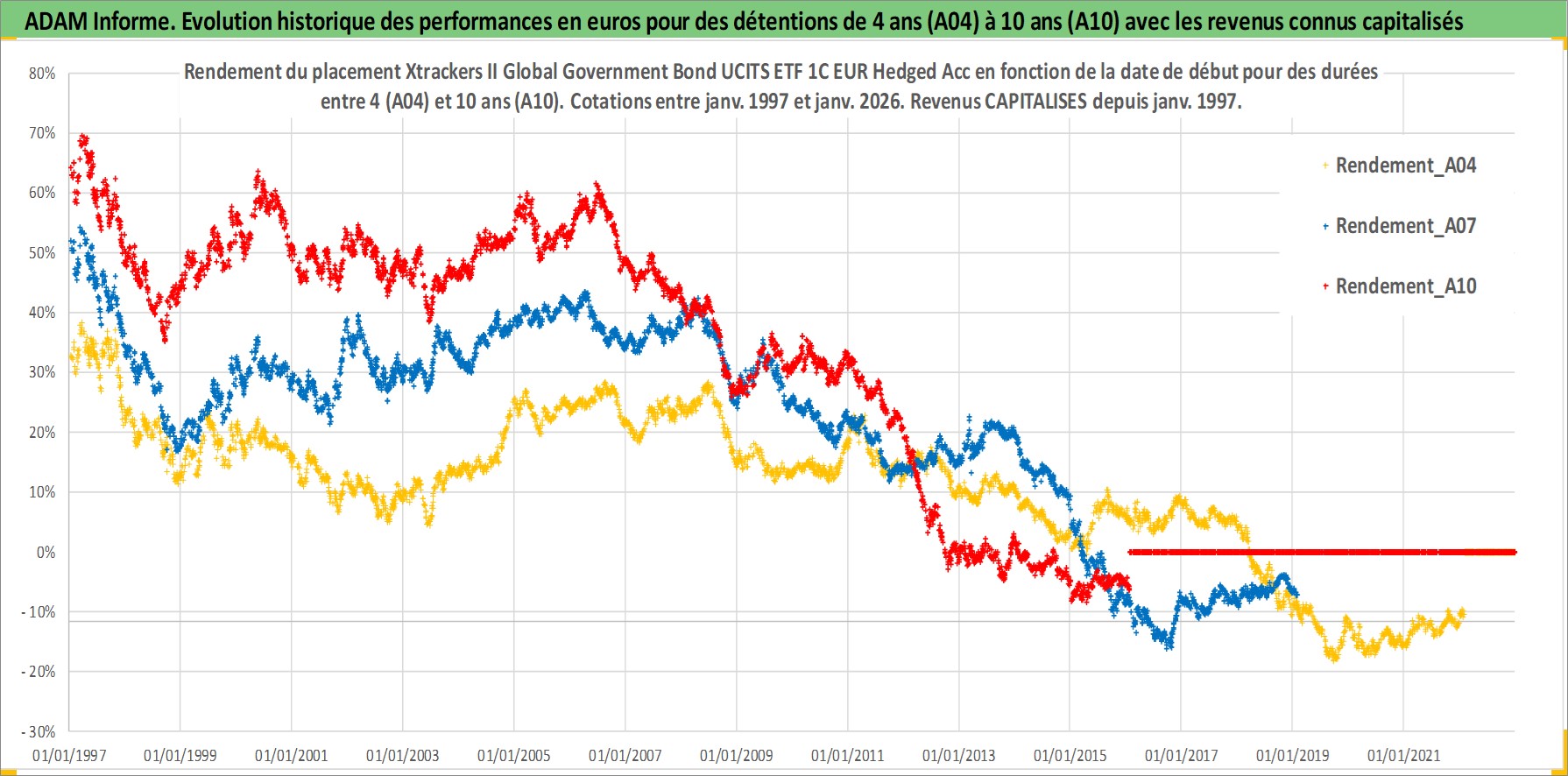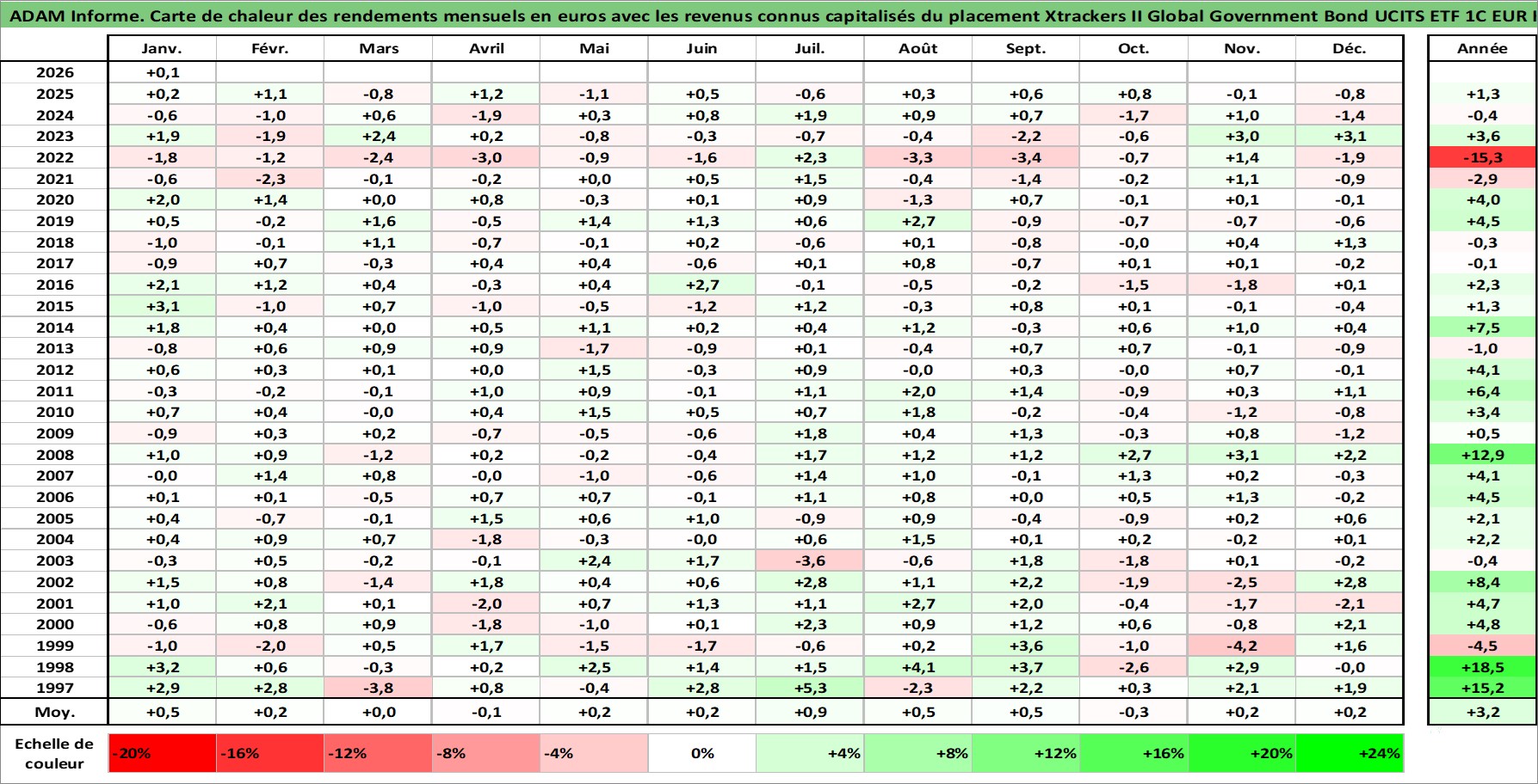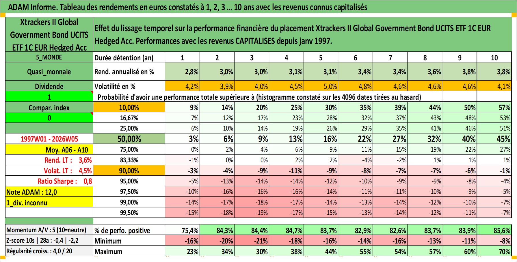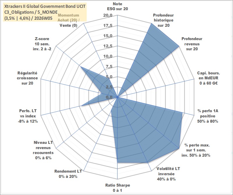Site dédié aux investisseursPage dédiée sur site financeAnalyse des valorisations hebdomadaires du fonds Xtrackers II Global Government Bond UCITS ETF 1C EUR Hedged Acc. Cet actif est cote en EUR. Les valorisations couvrent les semaines 1997W01 a 2026W05. Les revenus de cet actif financier sont pris en compte depuis la semaine 1997W01. La note ESG de cet actif n'est pas connue.