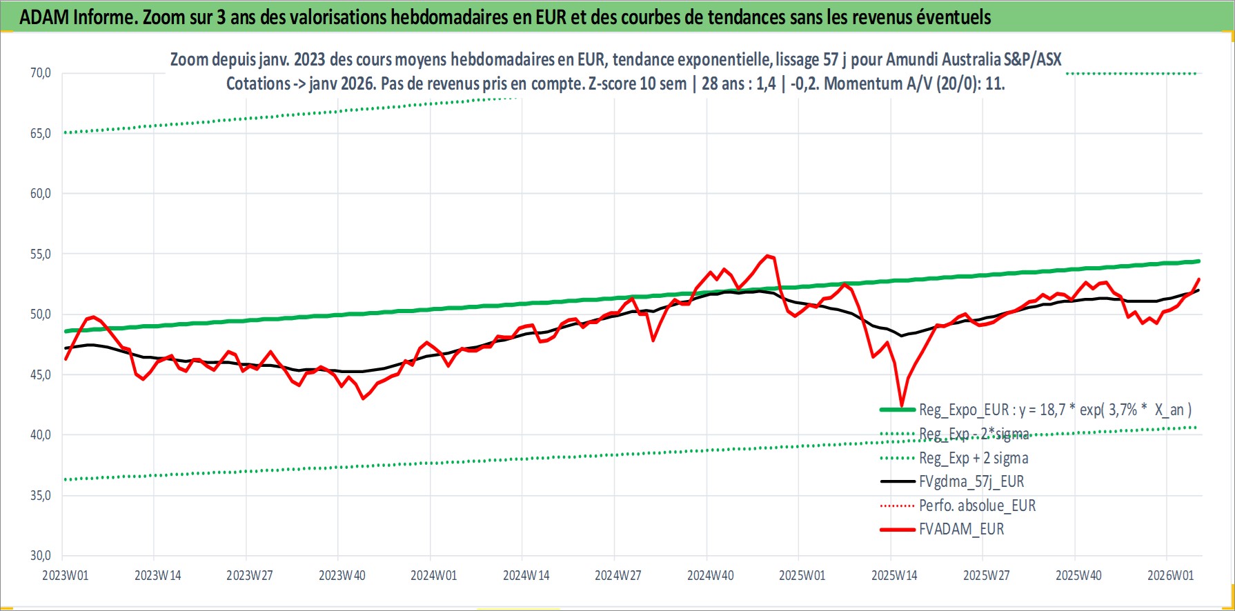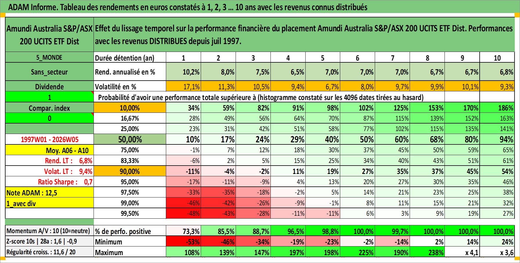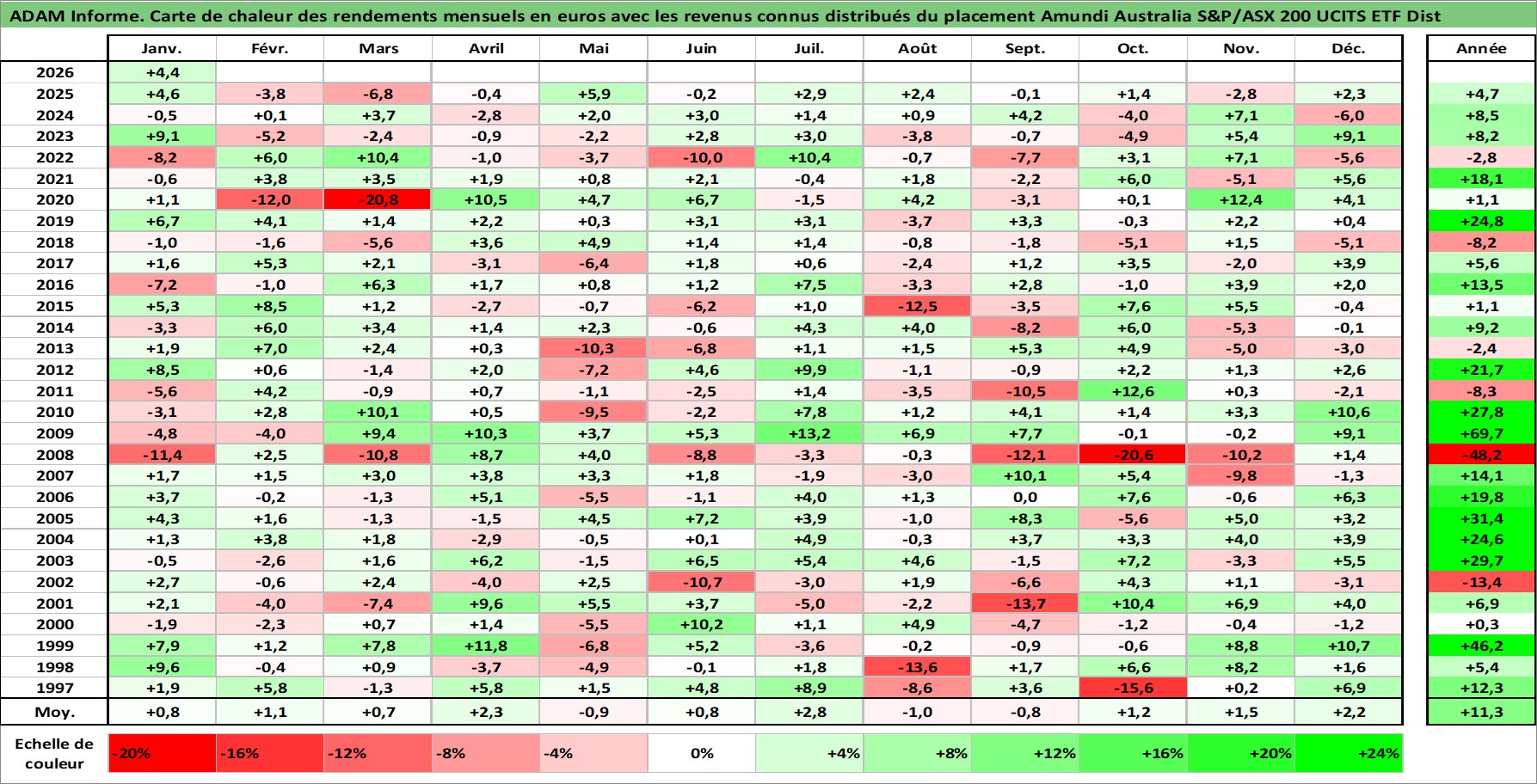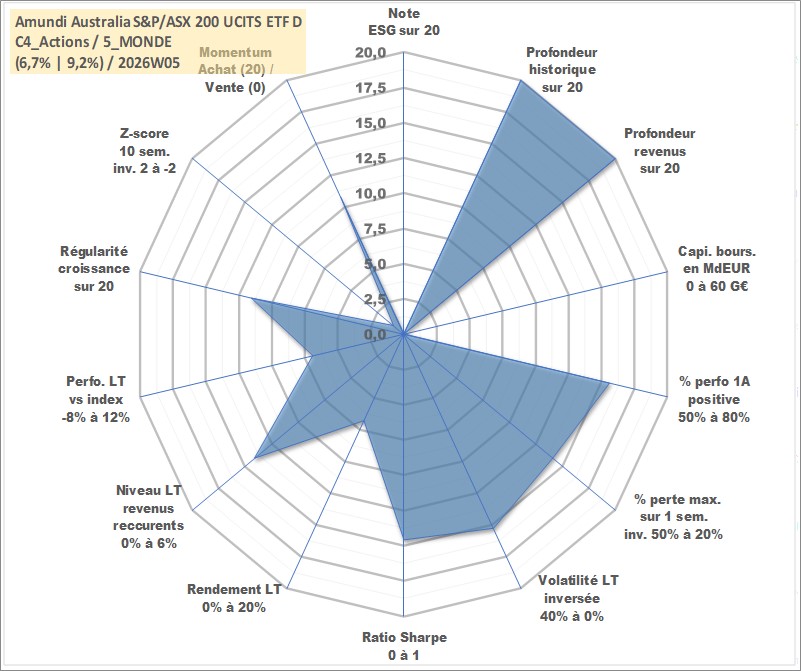 Site dédié aux investisseursPage dédiée sur site financeAnalyse des valorisations hebdomadaires du fonds Amundi Australia S&P/ASX 200 UCITS ETF Dist. Cet actif est cote en EUR. Les valorisations couvrent les semaines 1997W01 a 2026W05. Les revenus de cet actif financier sont pris en compte depuis la semaine 1997W28. La note ESG de cet actif n'est pas connue.