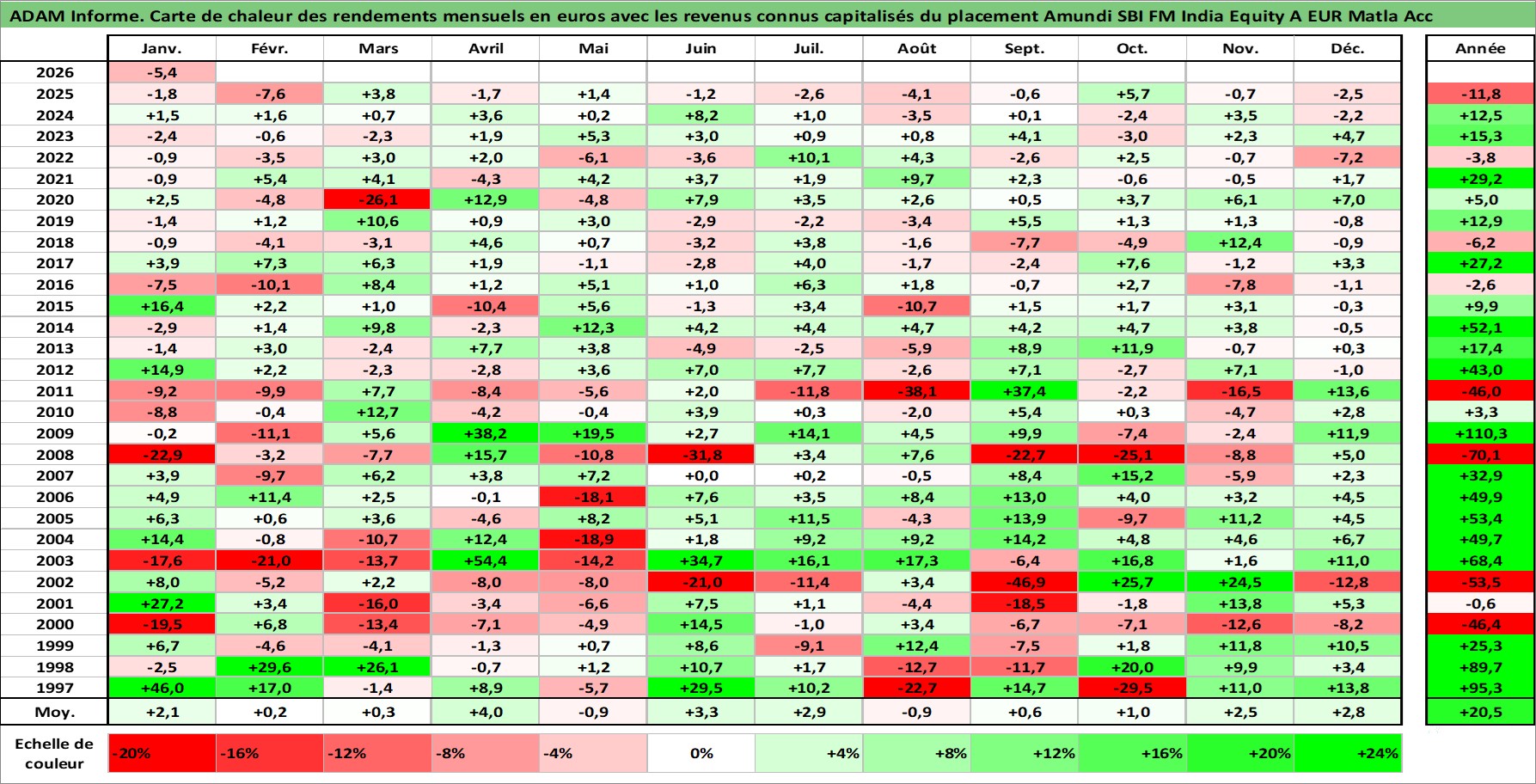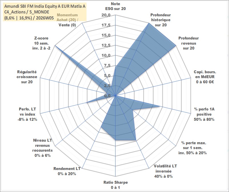 Site dédié aux investisseursPage dédiée sur site financeAnalyse des valorisations hebdomadaires du fonds Amundi SBI FM India Equity A EUR Matla Acc. Cet actif est cote en EUR. Les valorisations couvrent les semaines 1997W01 a 2026W05. Les revenus de cet actif financier sont pris en compte depuis la semaine 1997W01. La note globale ESG de cet actif est estimee a 7.0 (apres rebasage entre 0 et 20).