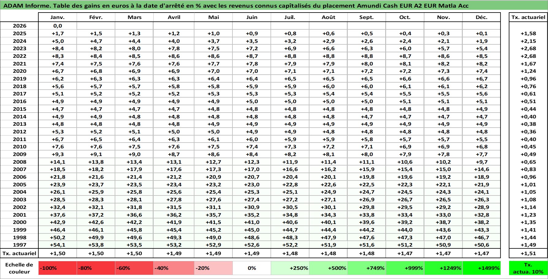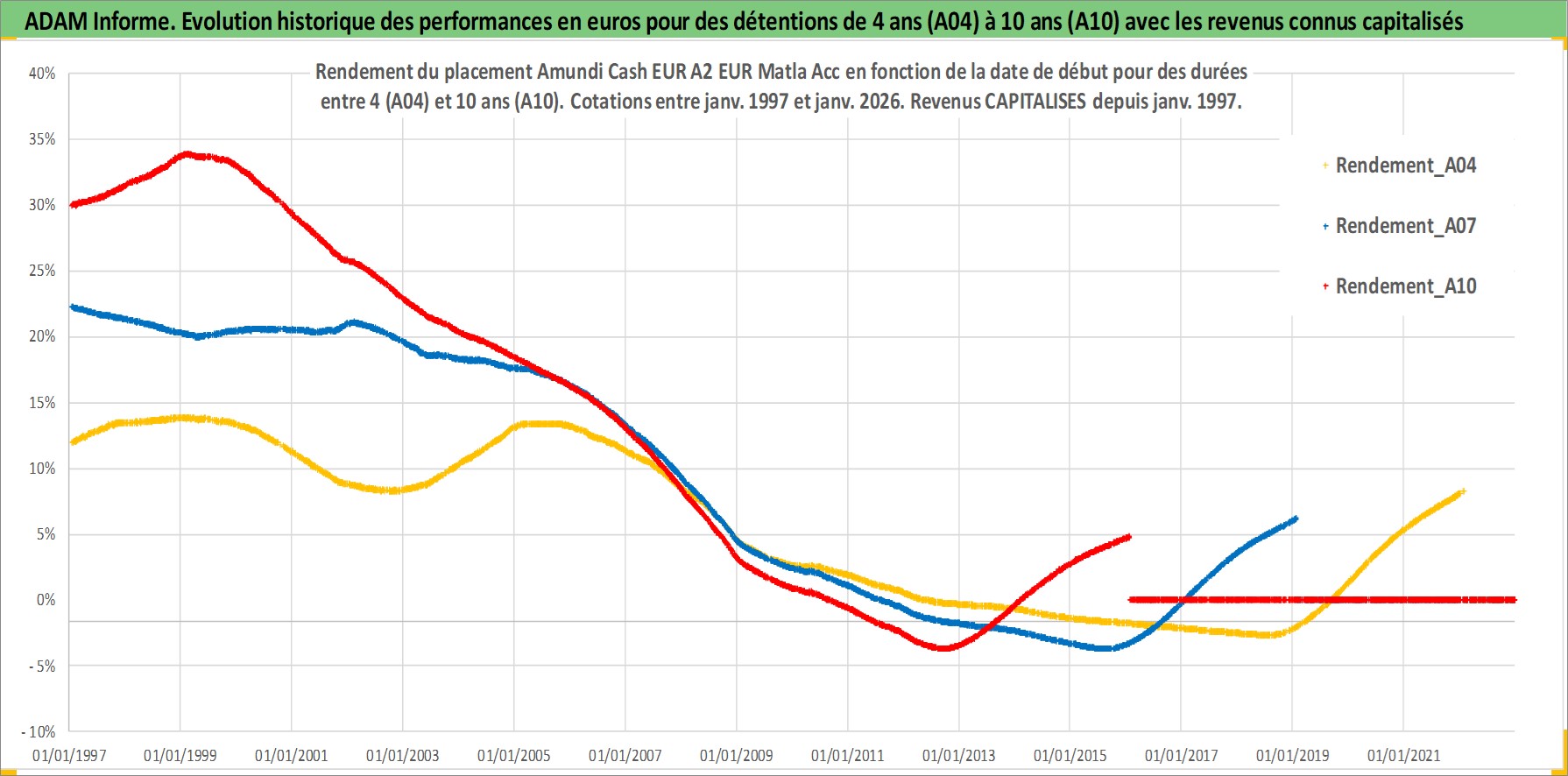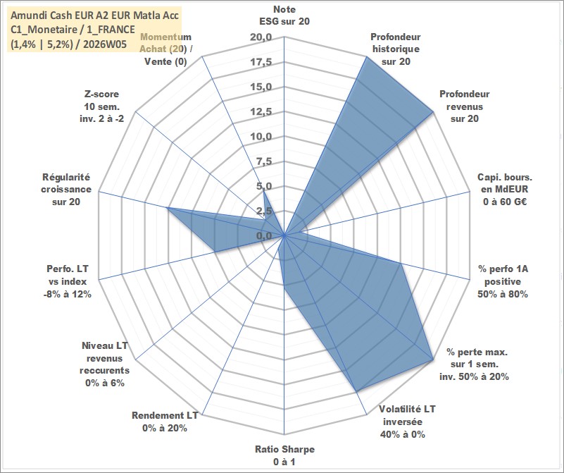 Site dédié aux investisseursPage dédiée sur site financeAnalyse des valorisations hebdomadaires du fonds Amundi Cash EUR A2 EUR Matla Acc. Cet actif est cote en EUR. Les valorisations couvrent les semaines 1997W01 a 2026W05. Les revenus de cet actif financier sont pris en compte depuis la semaine 1997W01. La note ESG de cet actif n'est pas connue.