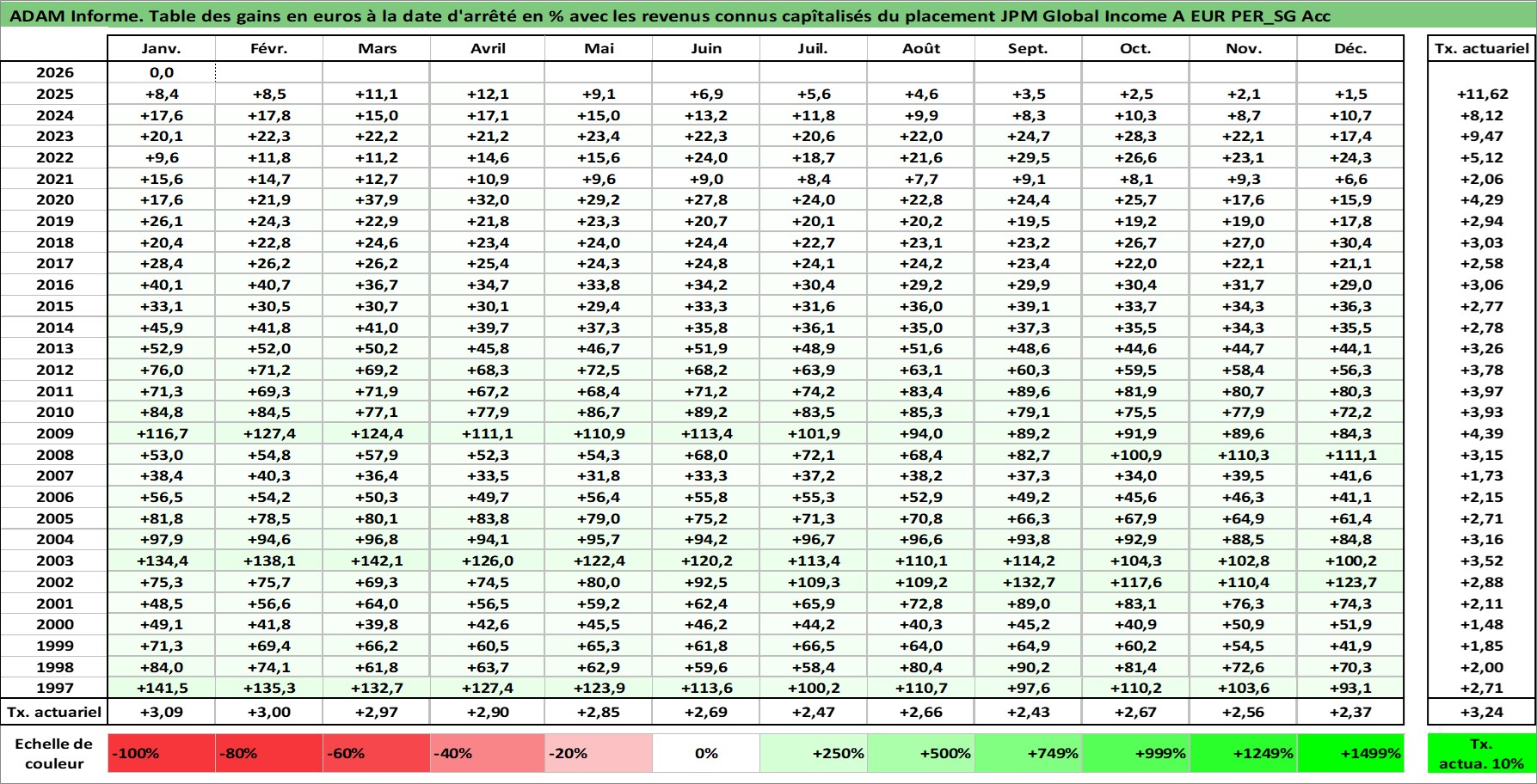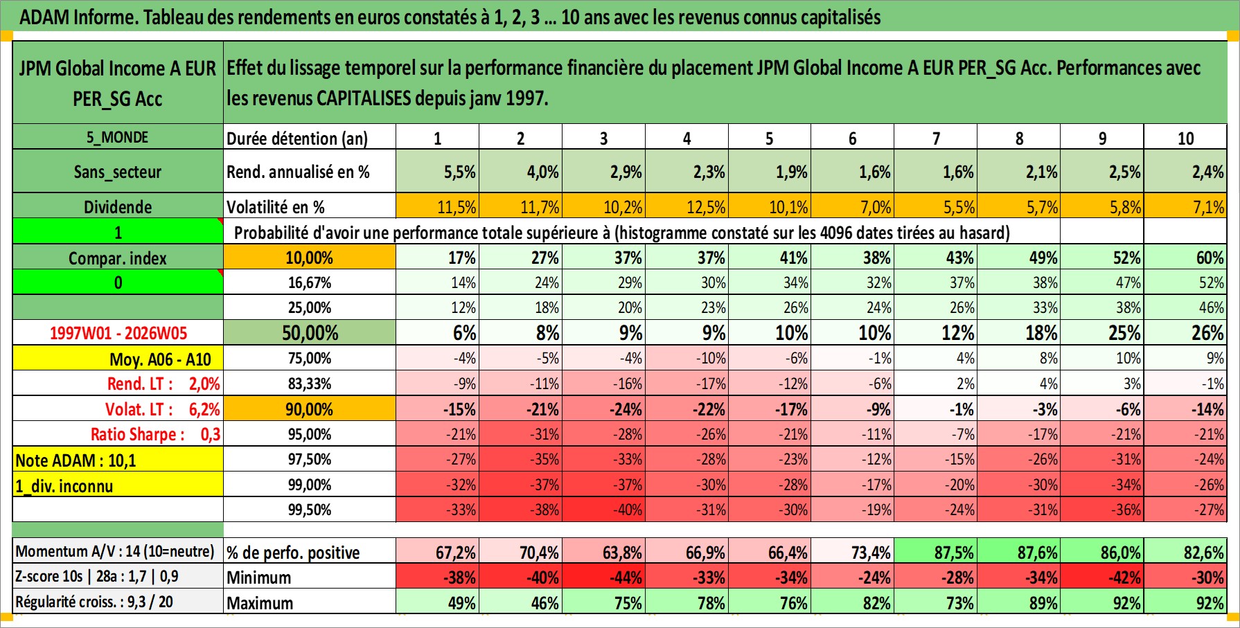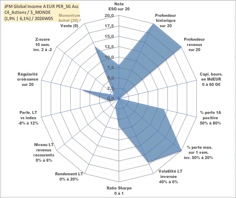 Site dédié aux investisseursPage dédiée sur site financeAnalyse des valorisations hebdomadaires du fonds JPM Global Income A EUR PER_SG Acc. Cet actif est cote en EUR. Les valorisations couvrent les semaines 1997W01 a 2026W05. Les revenus de cet actif financier sont pris en compte depuis la semaine 1997W01. La note globale ESG de cet actif est estimee a 8.0 (apres rebasage entre 0 et 20).