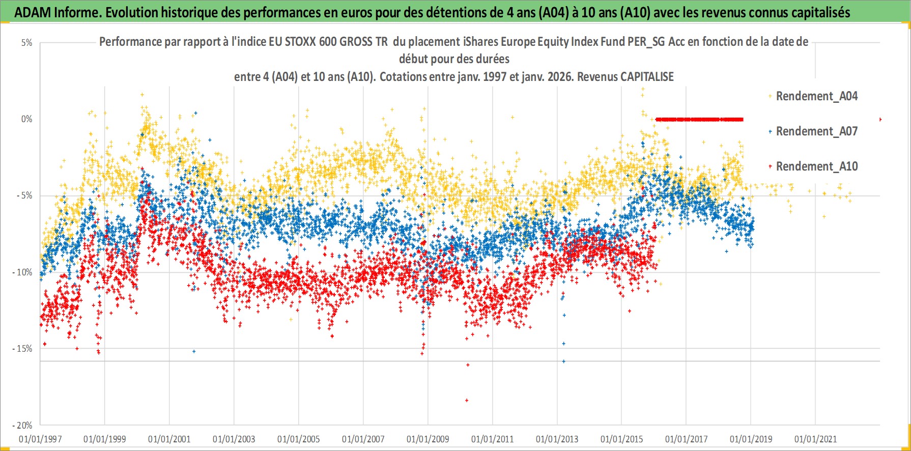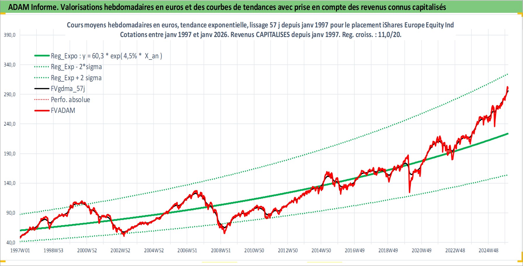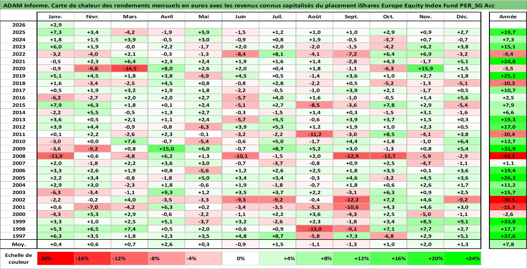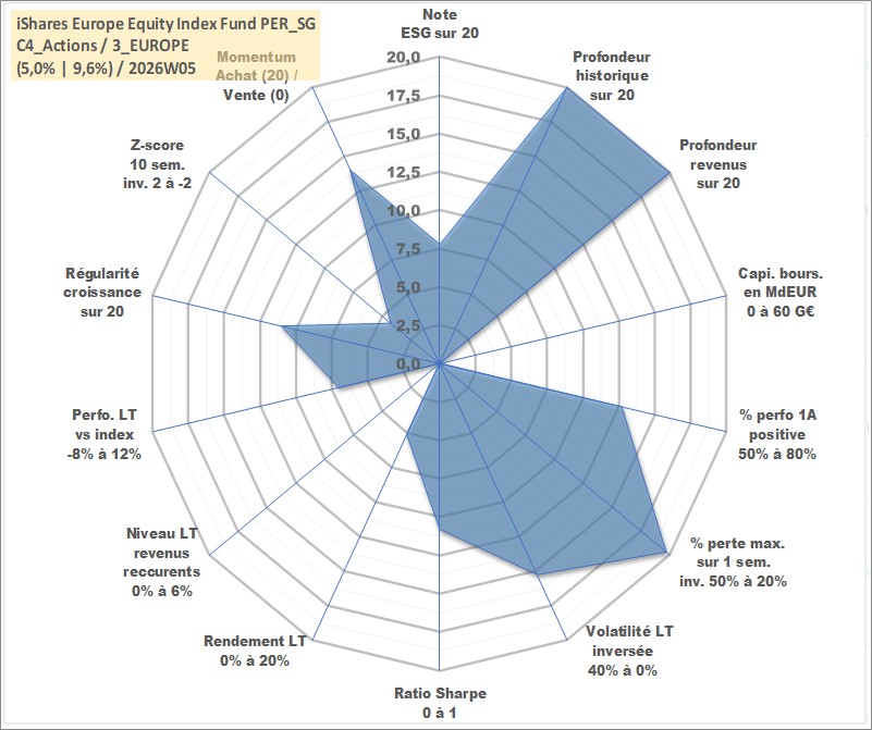 Site dédié aux investisseursPage dédiée sur site financeAnalyse des valorisations hebdomadaires du fonds iShares Europe Equity Index Fund PER_SG Acc. Cet actif est cote en EUR. Les valorisations couvrent les semaines 1997W01 a 2026W05. Les revenus de cet actif financier sont pris en compte depuis la semaine 1997W01. La note globale ESG de cet actif est estimee a 7.9 (apres rebasage entre 0 et 20).