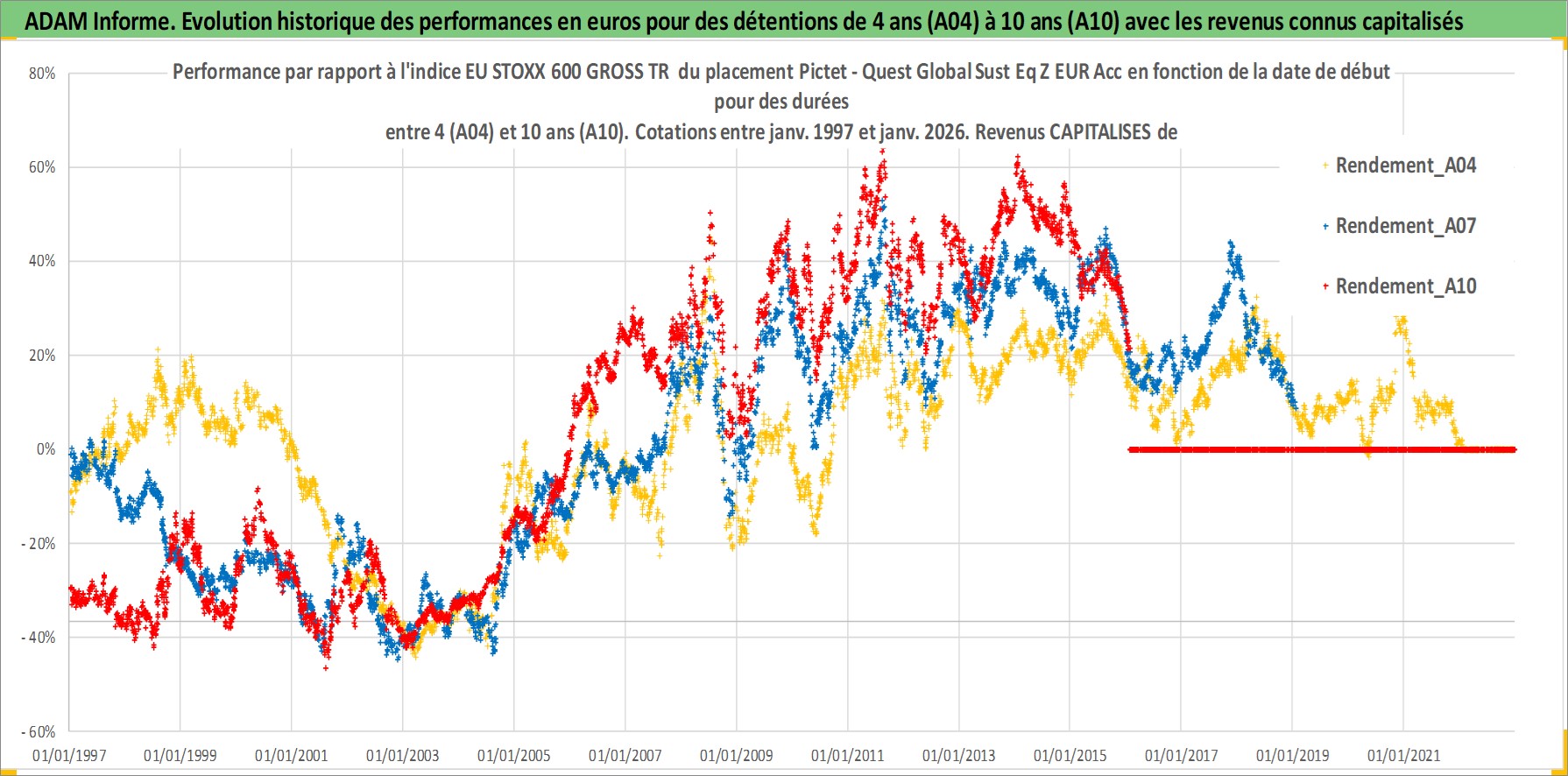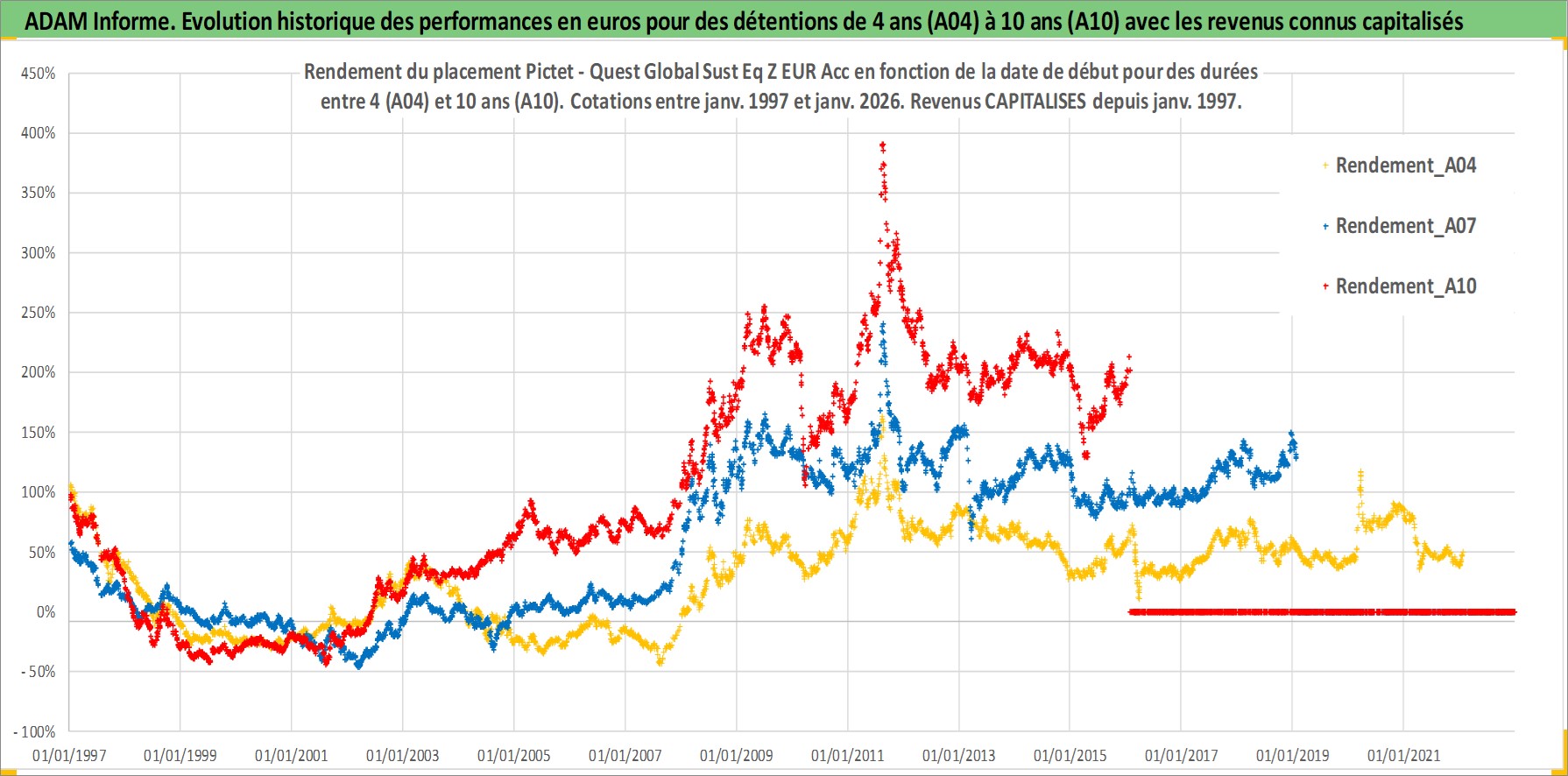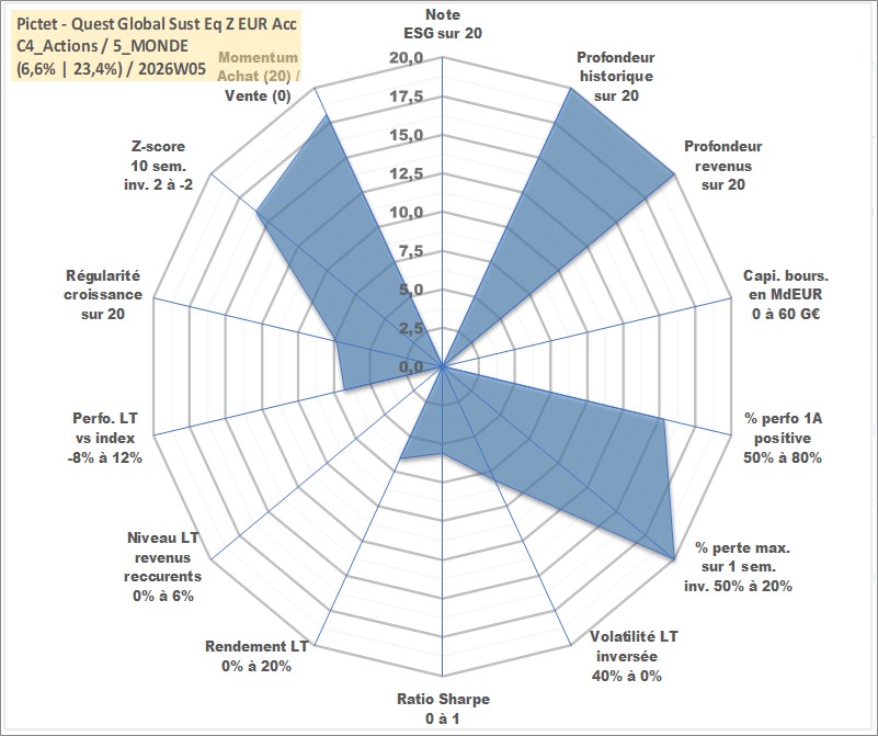 Site dédié aux investisseursPage dédiée sur site financeAnalyse des valorisations hebdomadaires du fonds Pictet - Quest Global Sust Eq Z EUR Acc. Cet actif est cote en EUR. Les valorisations couvrent les semaines 1997W01 a 2026W05. Les revenus de cet actif financier sont pris en compte depuis la semaine 1997W01. La note ESG de cet actif n'est pas connue.