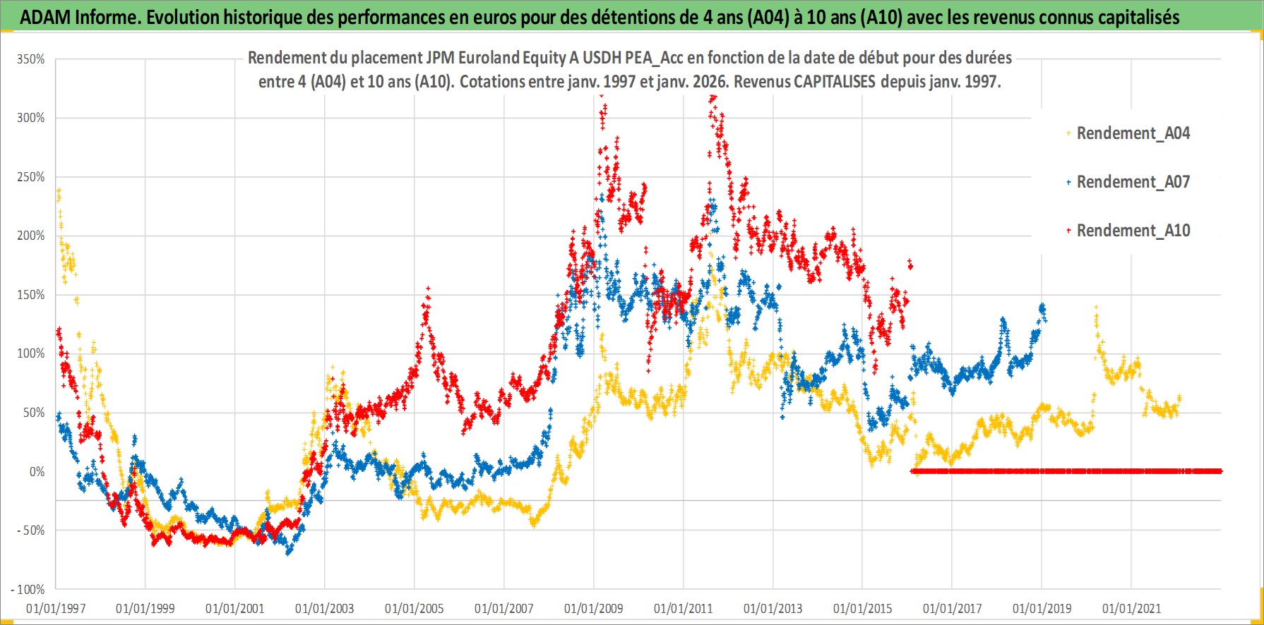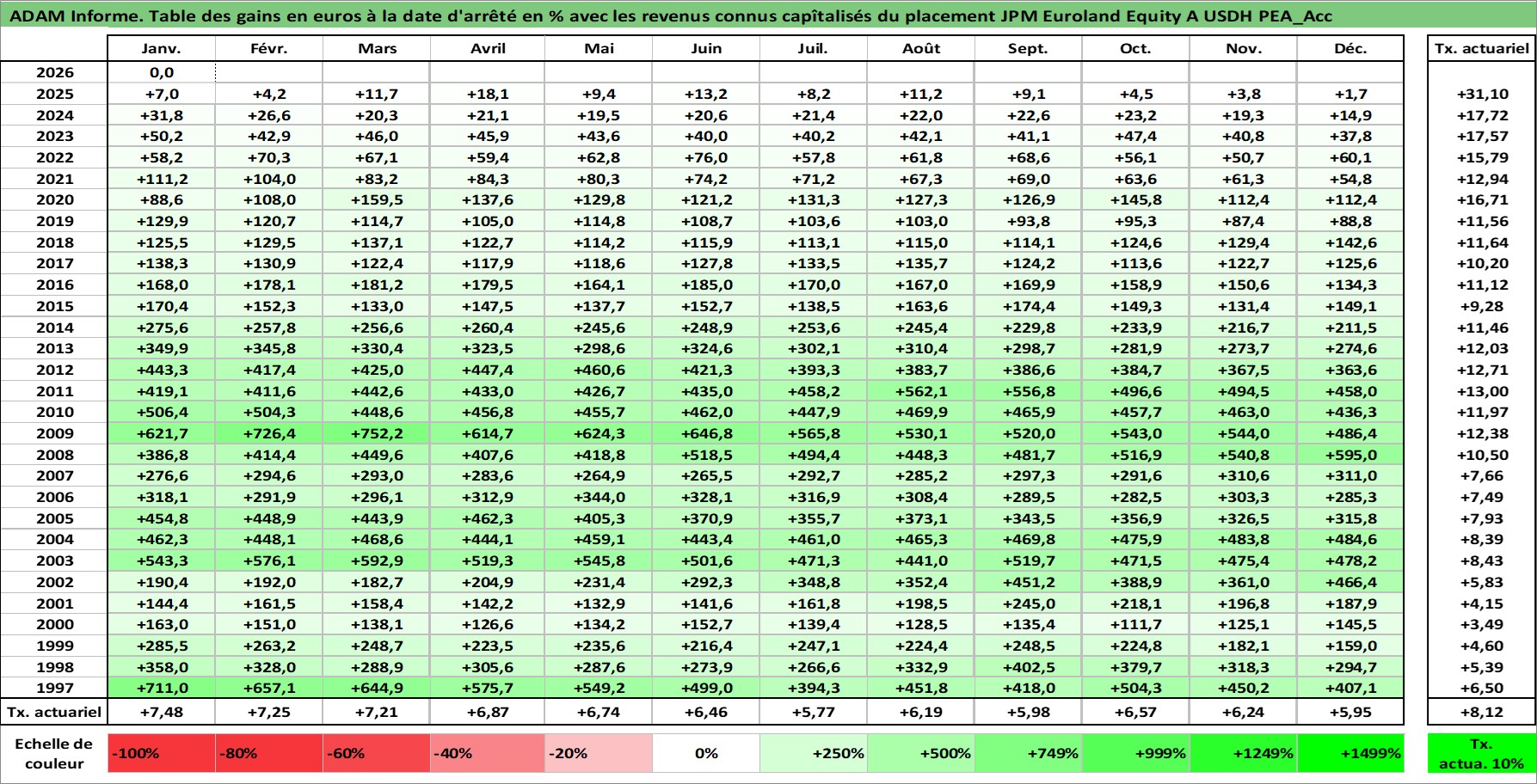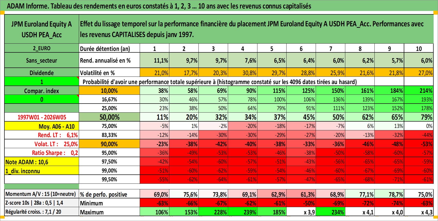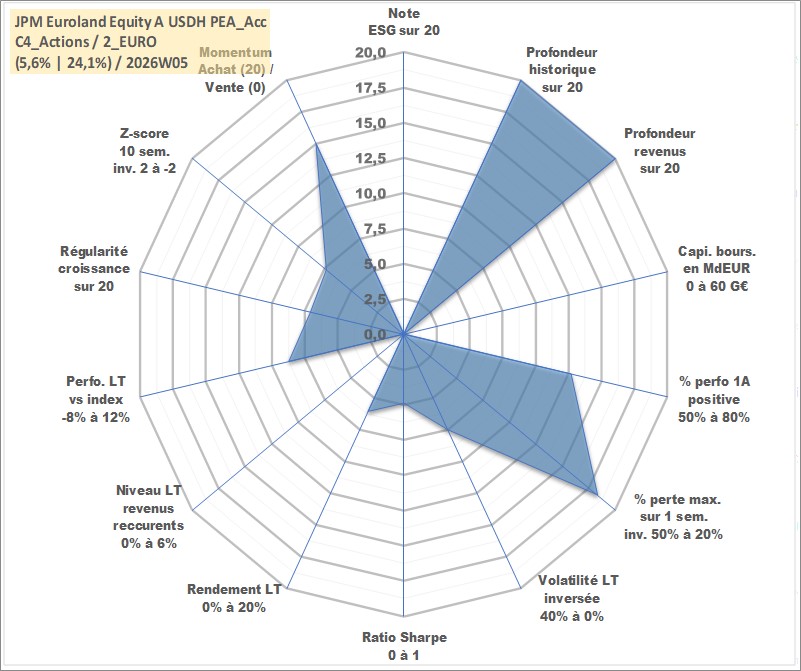 Site dédié aux investisseursPage dédiée sur site financeAnalyse des valorisations hebdomadaires du fonds JPM Euroland Equity A USDH PEA_Acc. Cet actif est cote en USD. Les valorisations sont en contrevaleur EURO et couvrent les semaines 1997W01 a 2026W05. Les revenus de cet actif financier sont pris en compte depuis la semaine 1997W01. La note ESG de cet actif n'est pas connue.
