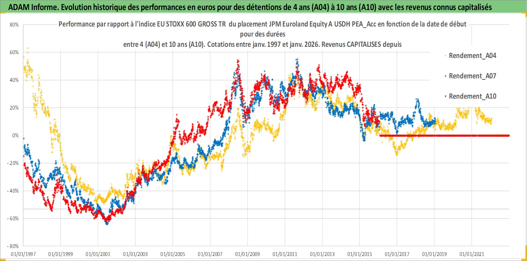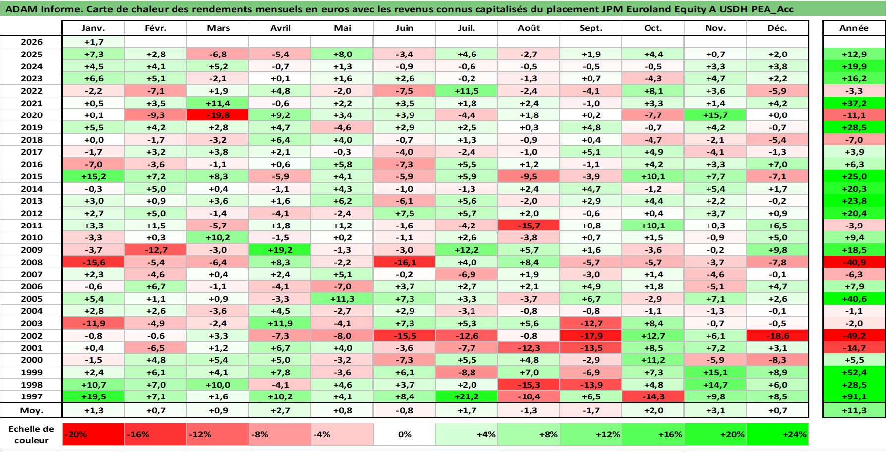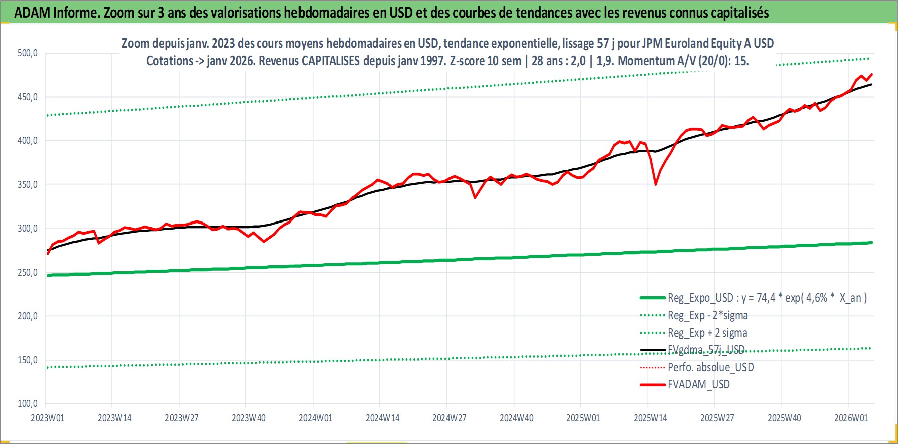 Site dédié aux investisseursPage dédiée sur site financeAnalyse des valorisations hebdomadaires du fonds JPM Euroland Equity A USDH PEA_Acc. Cet actif est cote en USD. Les valorisations sont en contrevaleur EURO et couvrent les semaines 1997W01 a 2026W05. Les revenus de cet actif financier sont pris en compte depuis la semaine 1997W01. La note ESG de cet actif n'est pas connue.