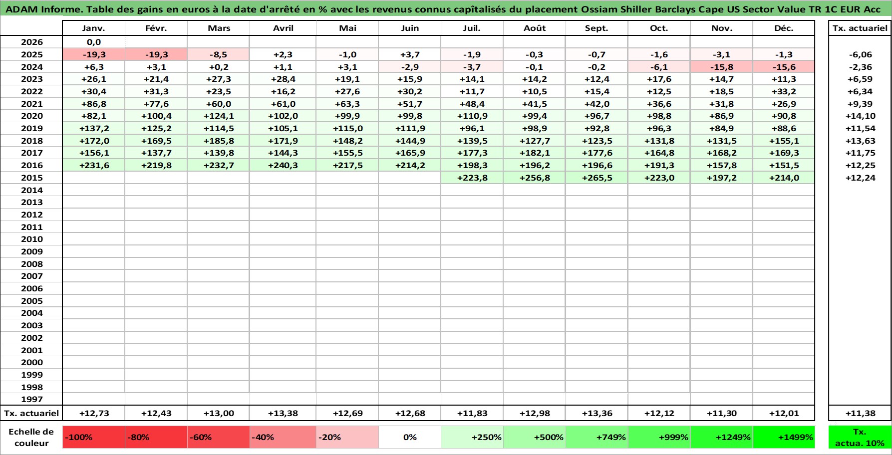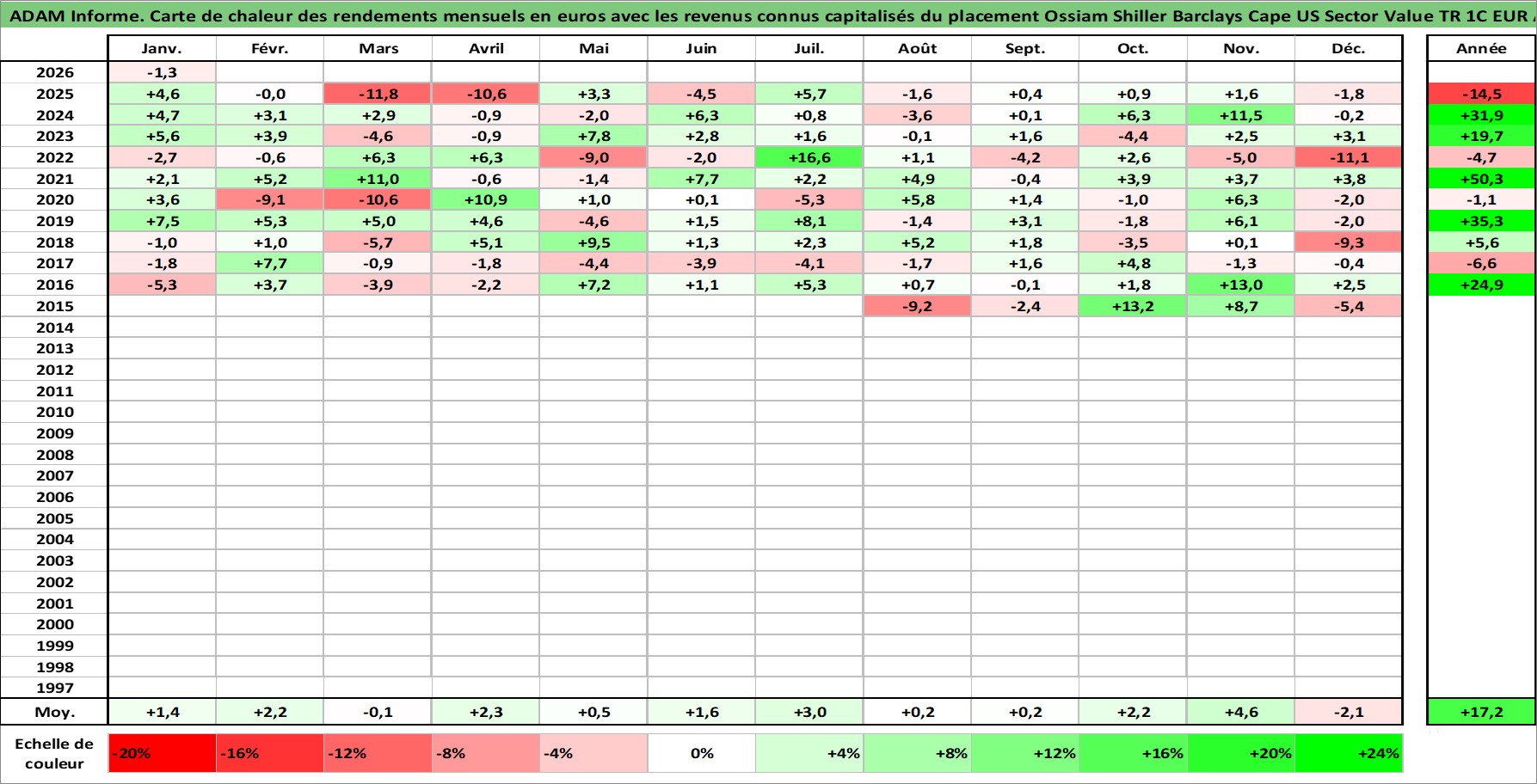 Site dédié aux investisseursPage dédiée sur site financeAnalyse des valorisations hebdomadaires du fonds Ossiam Shiller Barclays Cape US Sector Value TR 1C EUR Acc. Cet actif est cote en USD. Les valorisations sont en contrevaleur EURO et couvrent les semaines 2015W30 a 2026W05. Les revenus de cet actif financier sont pris en compte depuis la semaine 2015W30. La note ESG de cet actif n'est pas connue.