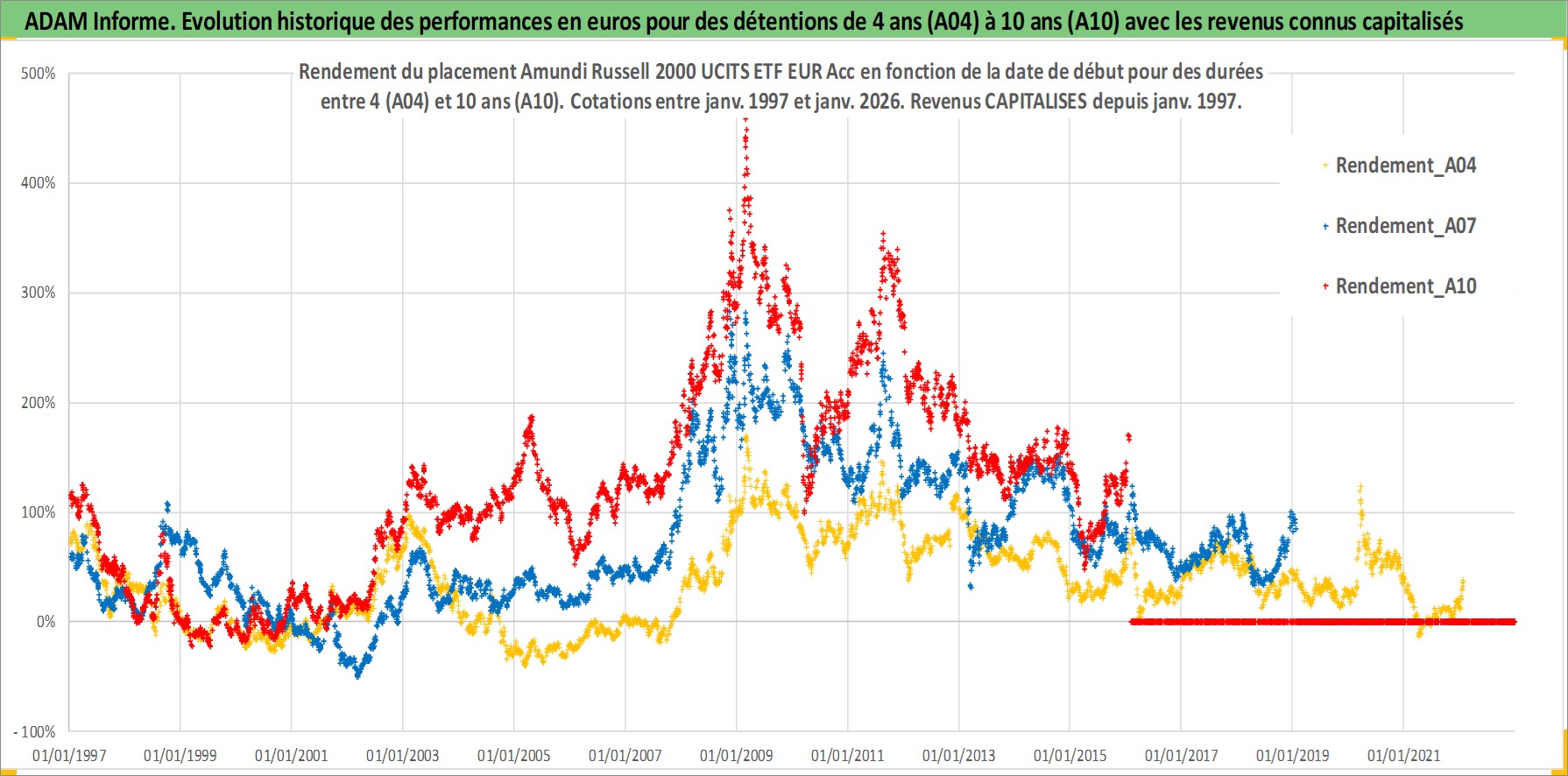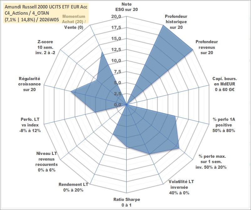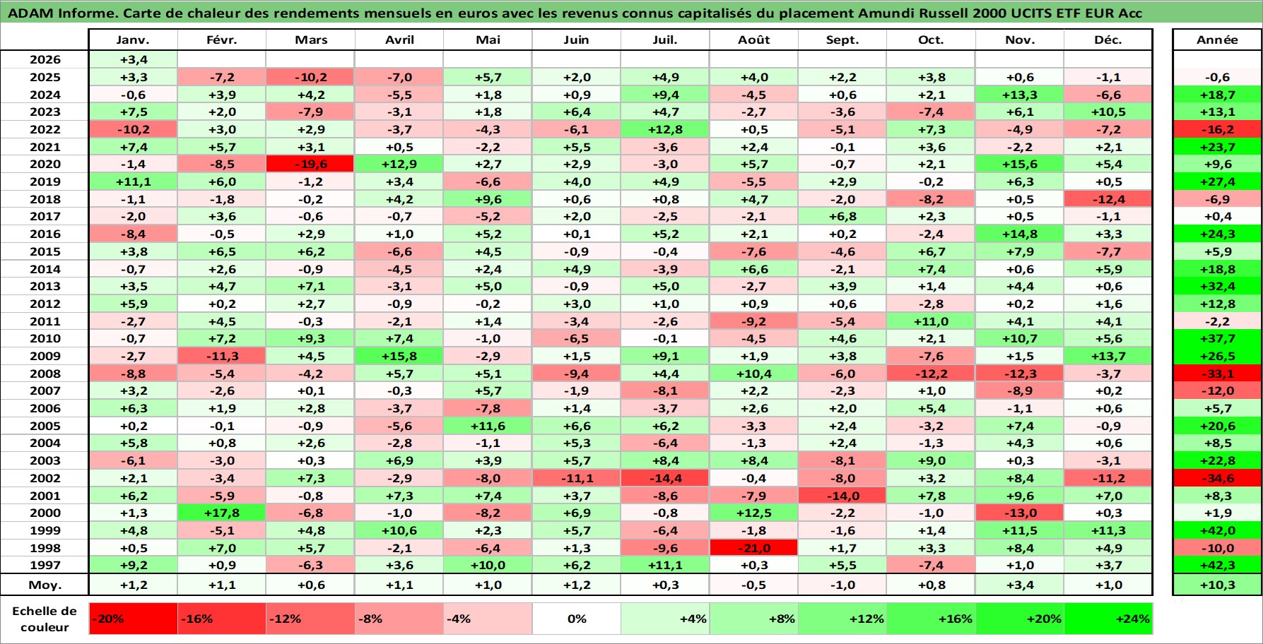Site dédié aux investisseursPage dédiée sur site financeAnalyse des valorisations hebdomadaires du fonds Amundi Russell 2000 UCITS ETF EUR Acc. Cet actif est cote en EUR. Les valorisations couvrent les semaines 1997W01 a 2026W05. Les revenus de cet actif financier sont pris en compte depuis la semaine 1997W01. La note ESG de cet actif n'est pas connue.