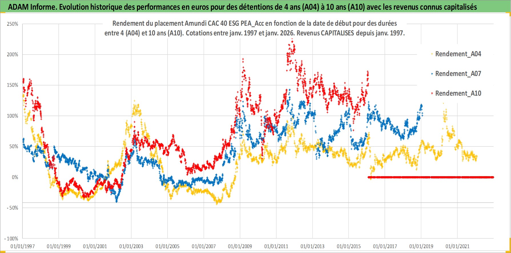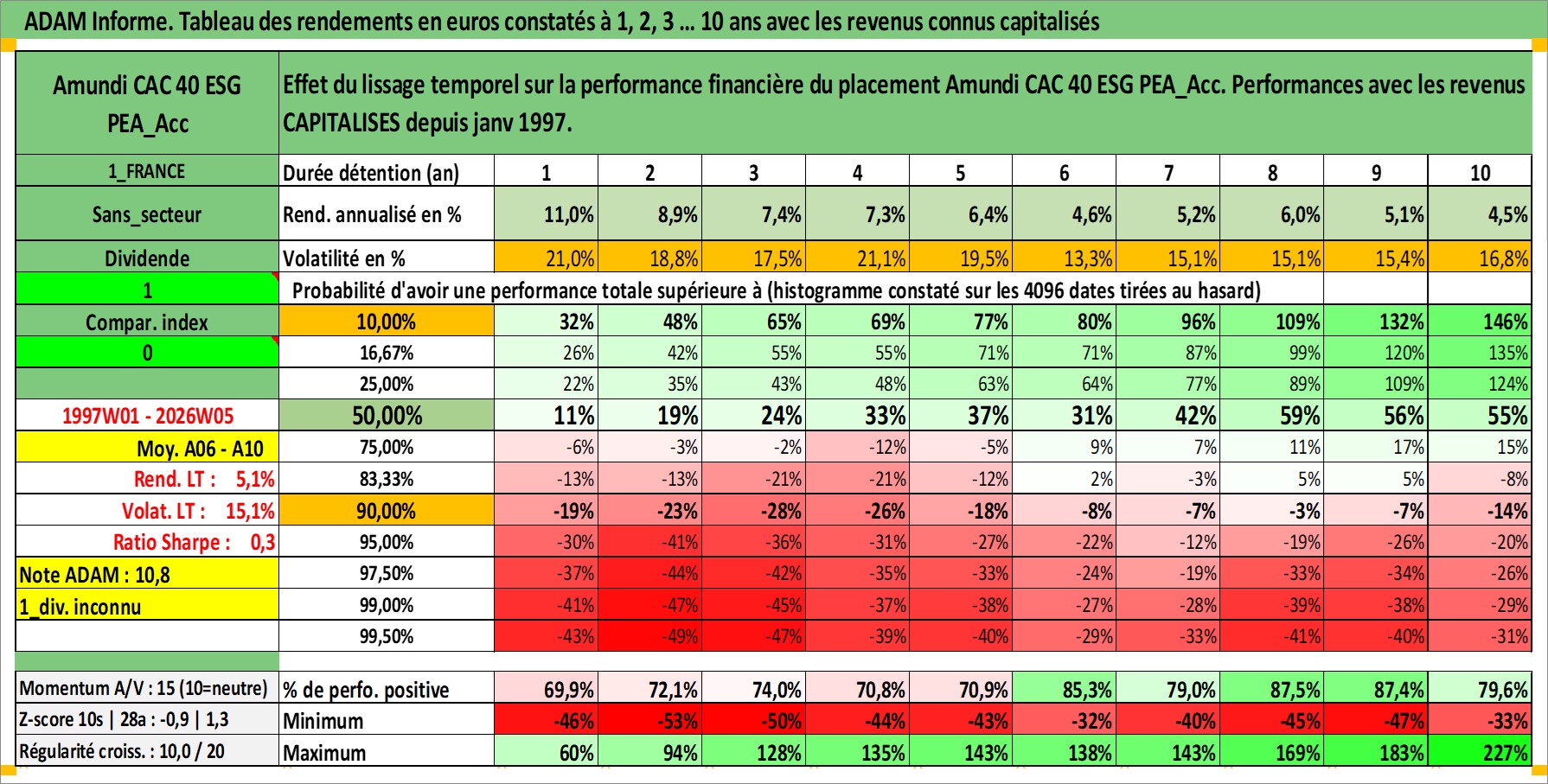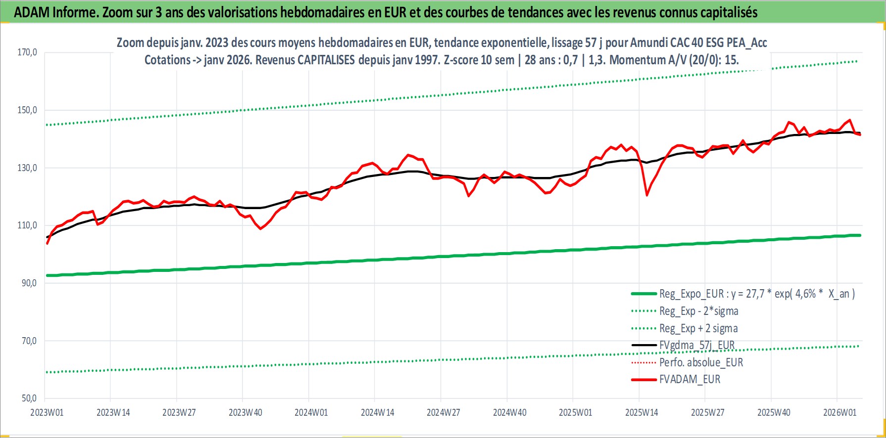 Site dédié aux investisseursPage dédiée sur site financeAnalyse des valorisations hebdomadaires du fonds Amundi CAC 40 ESG PEA_Acc. Cet actif est cote en EUR. Les valorisations couvrent les semaines 1997W01 a 2026W05. Les revenus de cet actif financier sont pris en compte depuis la semaine 1997W01. La note ESG de cet actif n'est pas connue.