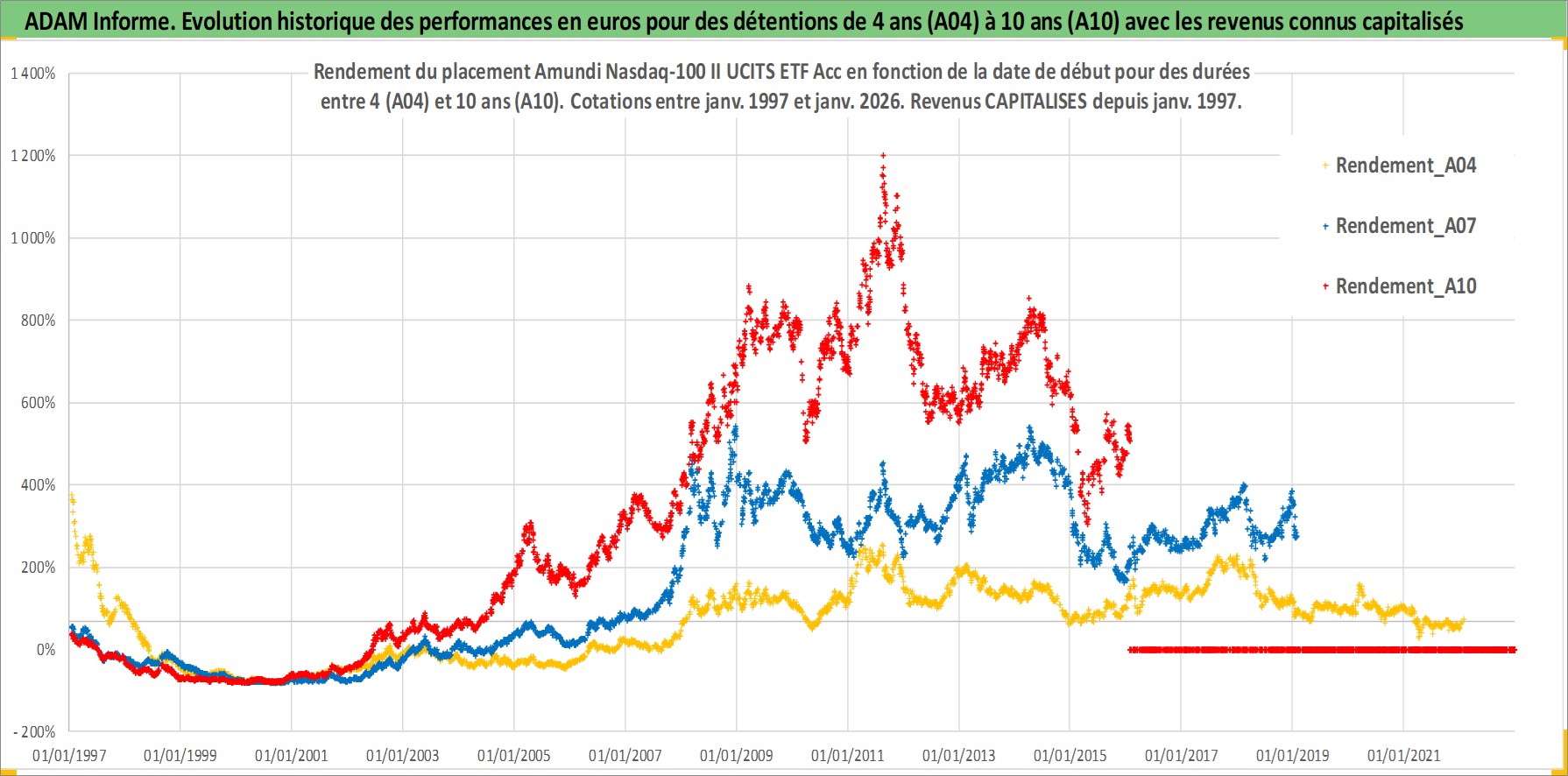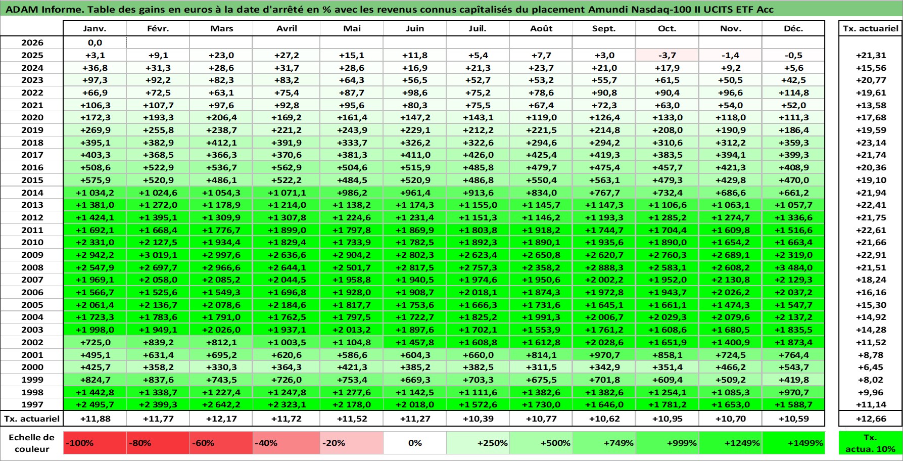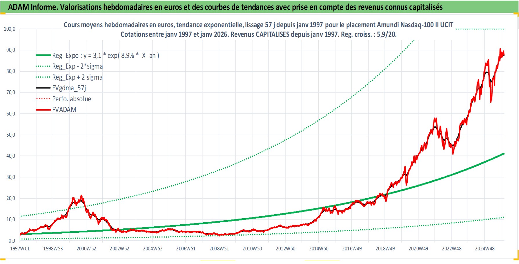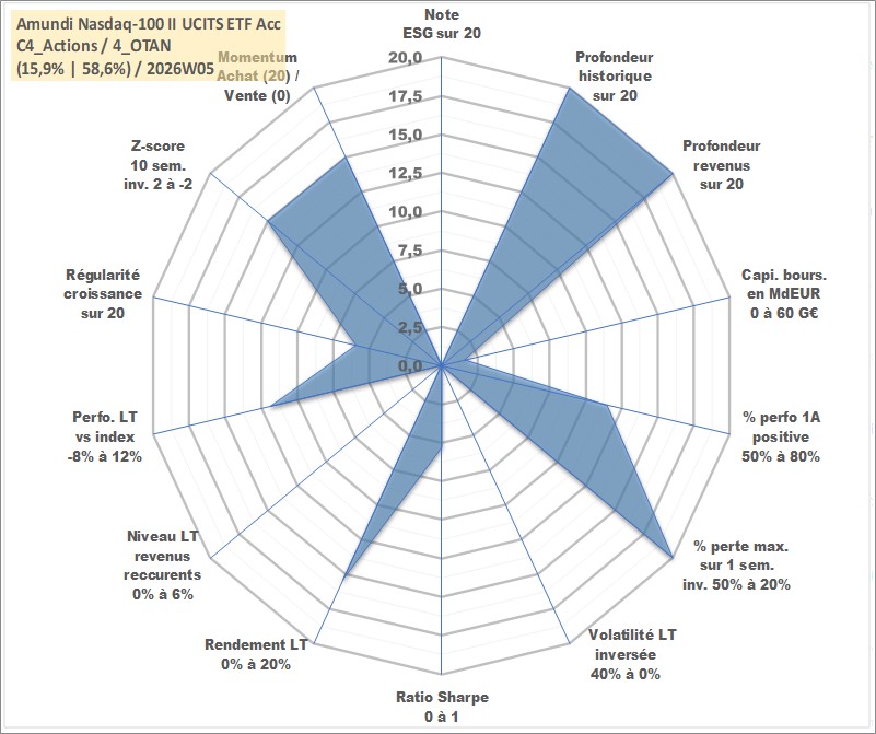 Site dédié aux investisseursPage dédiée sur site financeAnalyse des valorisations hebdomadaires du fonds Amundi Nasdaq-100 II UCITS ETF Acc. Cet actif est cote en USD. Les valorisations sont en contrevaleur EURO et couvrent les semaines 1997W01 a 2026W05. Les revenus de cet actif financier sont pris en compte depuis la semaine 1997W01. La note ESG de cet actif n'est pas connue.