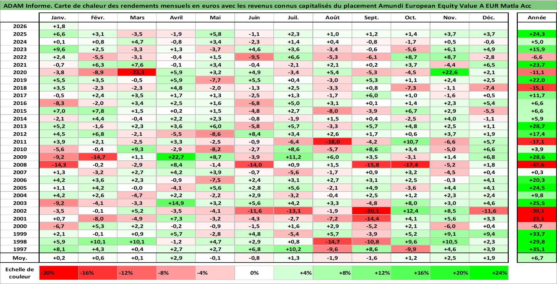 Site dédié aux investisseursPage dédiée sur site financeAnalyse des valorisations hebdomadaires du fonds Amundi European Equity Value A EUR Matla Acc. Cet actif est cote en EUR. Les valorisations couvrent les semaines 1997W01 a 2026W05. Les revenus de cet actif financier sont pris en compte depuis la semaine 1997W01. La note ESG de cet actif n'est pas connue.