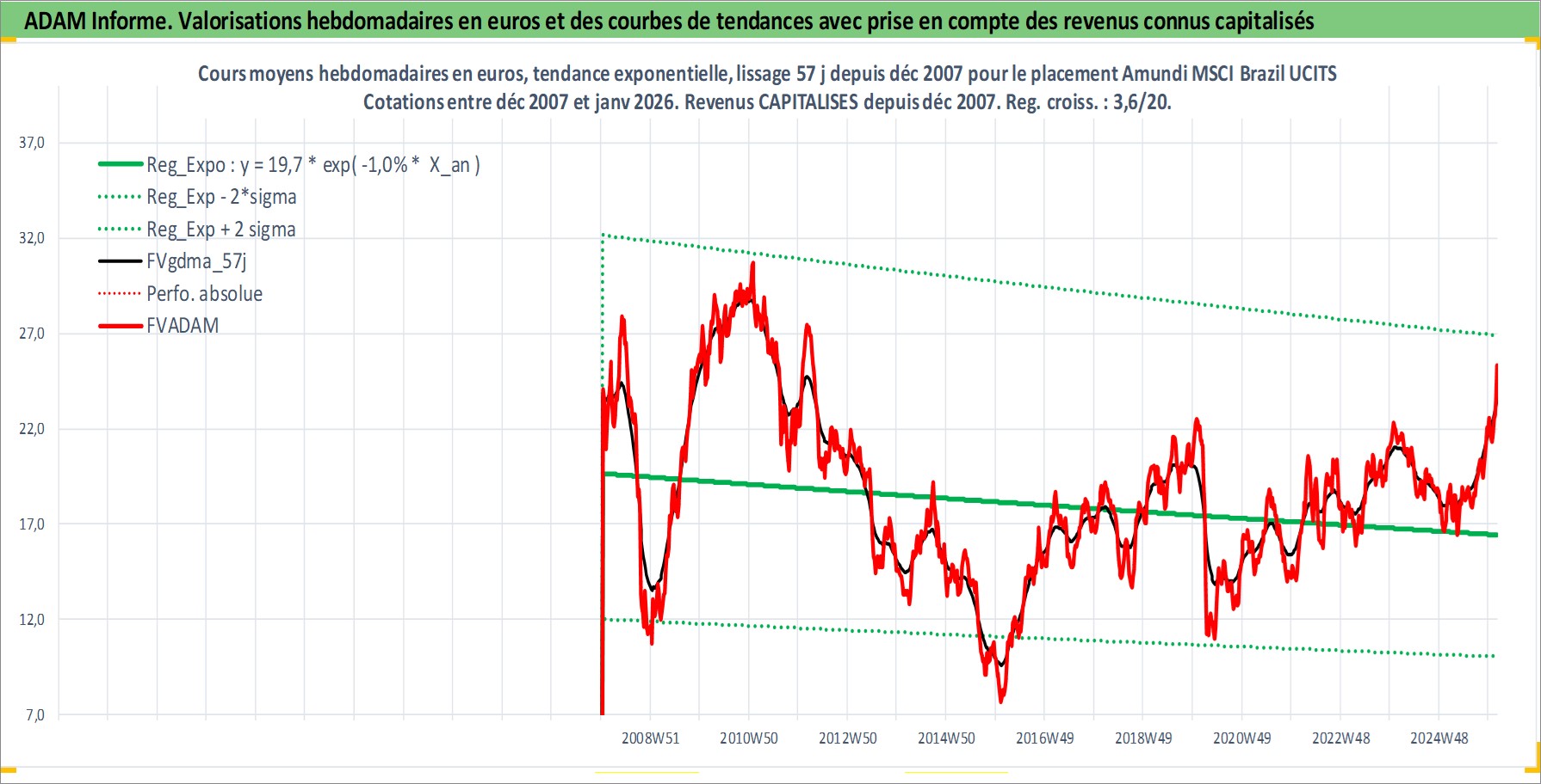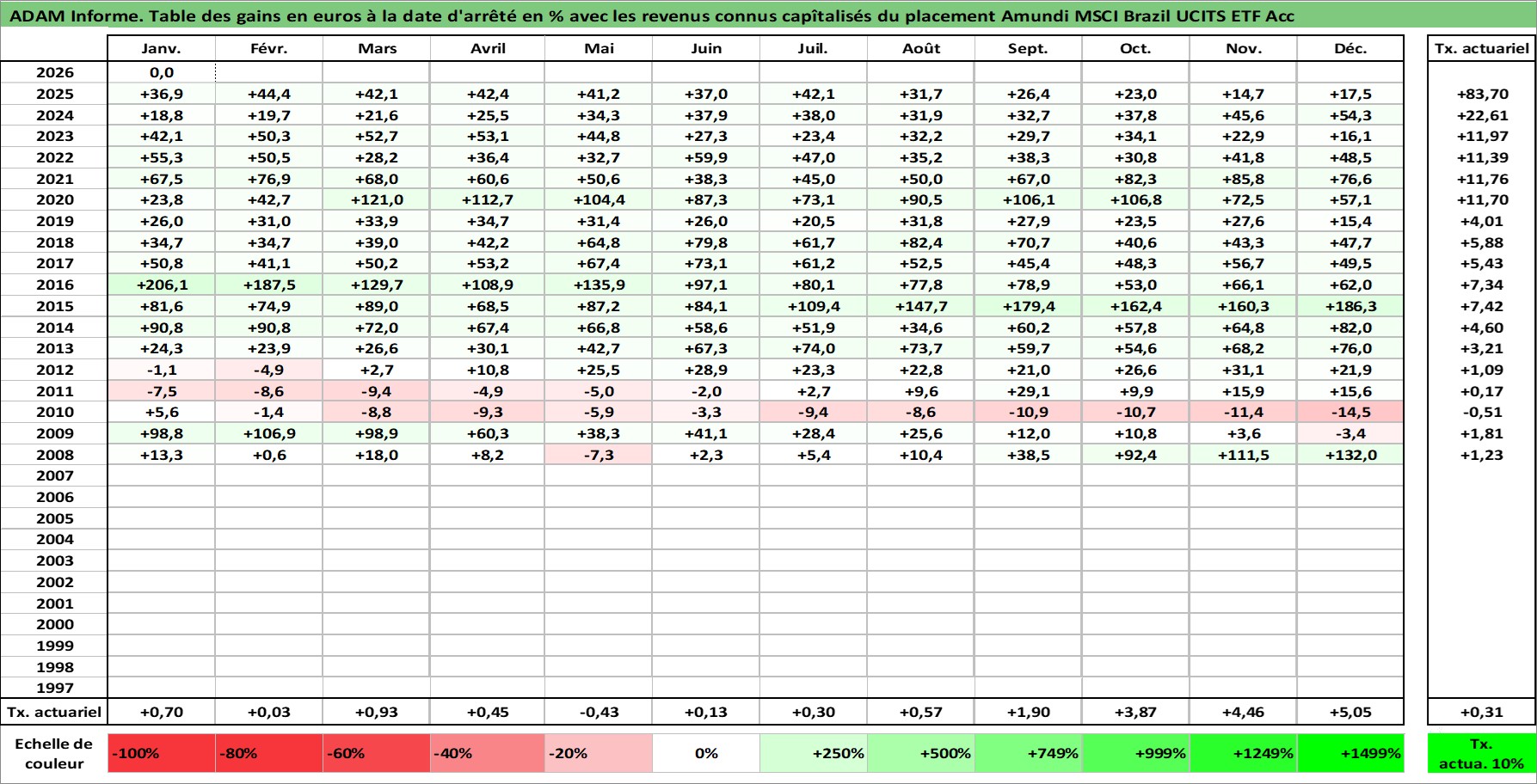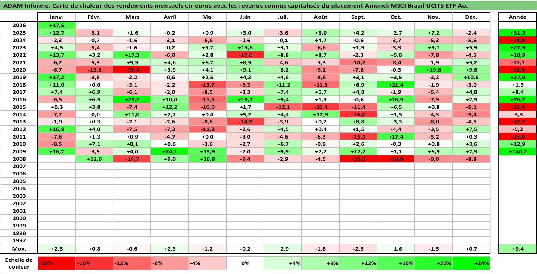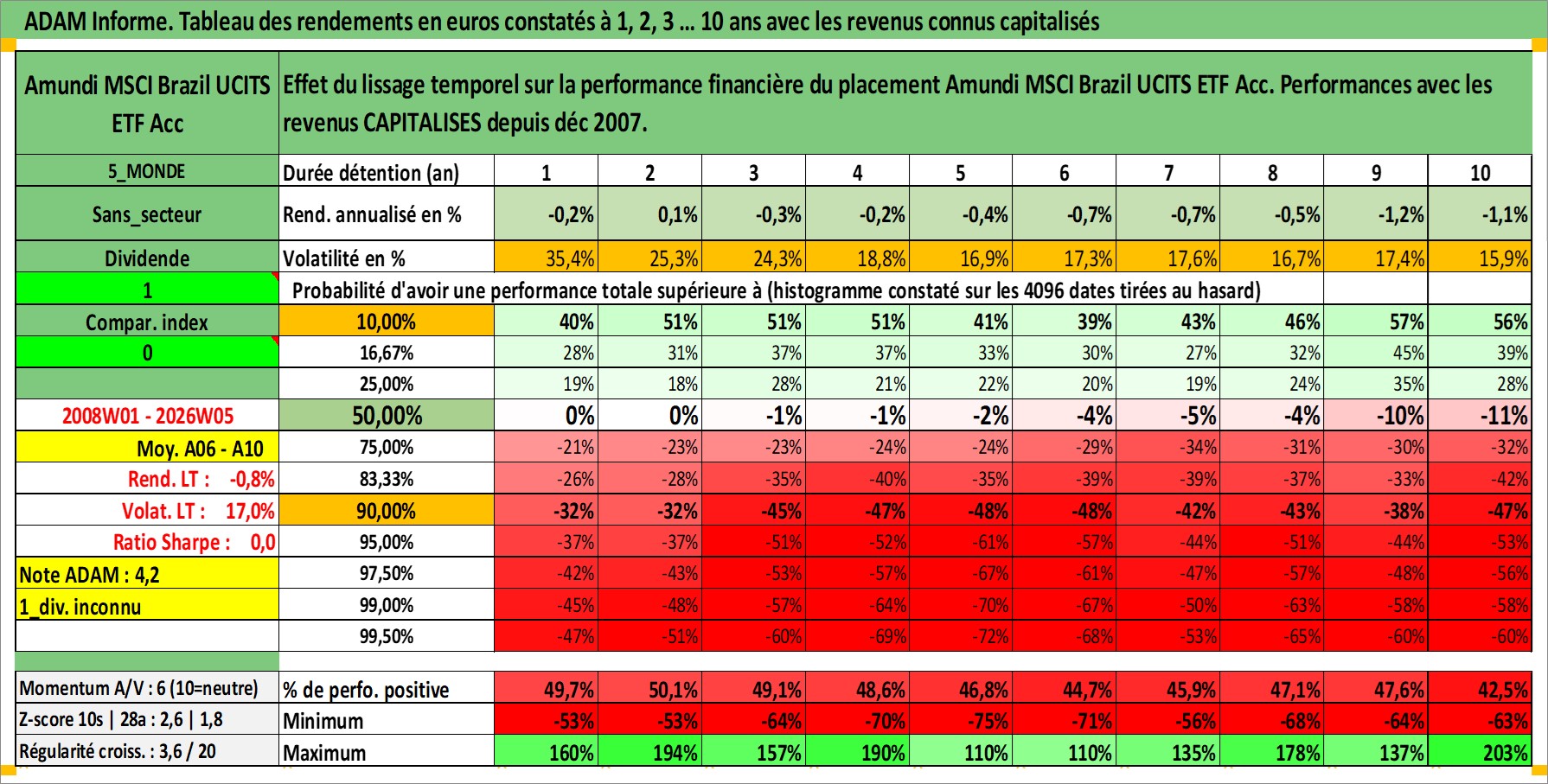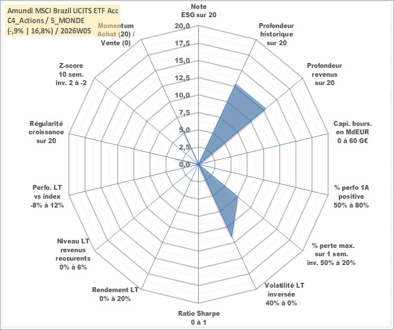 Site dédié aux investisseursPage dédiée sur site financeAnalyse des valorisations hebdomadaires du fonds Amundi MSCI Brazil UCITS ETF Acc. Cet actif est cote en EUR. Les valorisations couvrent les semaines 2008W01 a 2026W05. Les revenus de cet actif financier sont pris en compte depuis la semaine 2008W01. La note ESG de cet actif n'est pas connue.