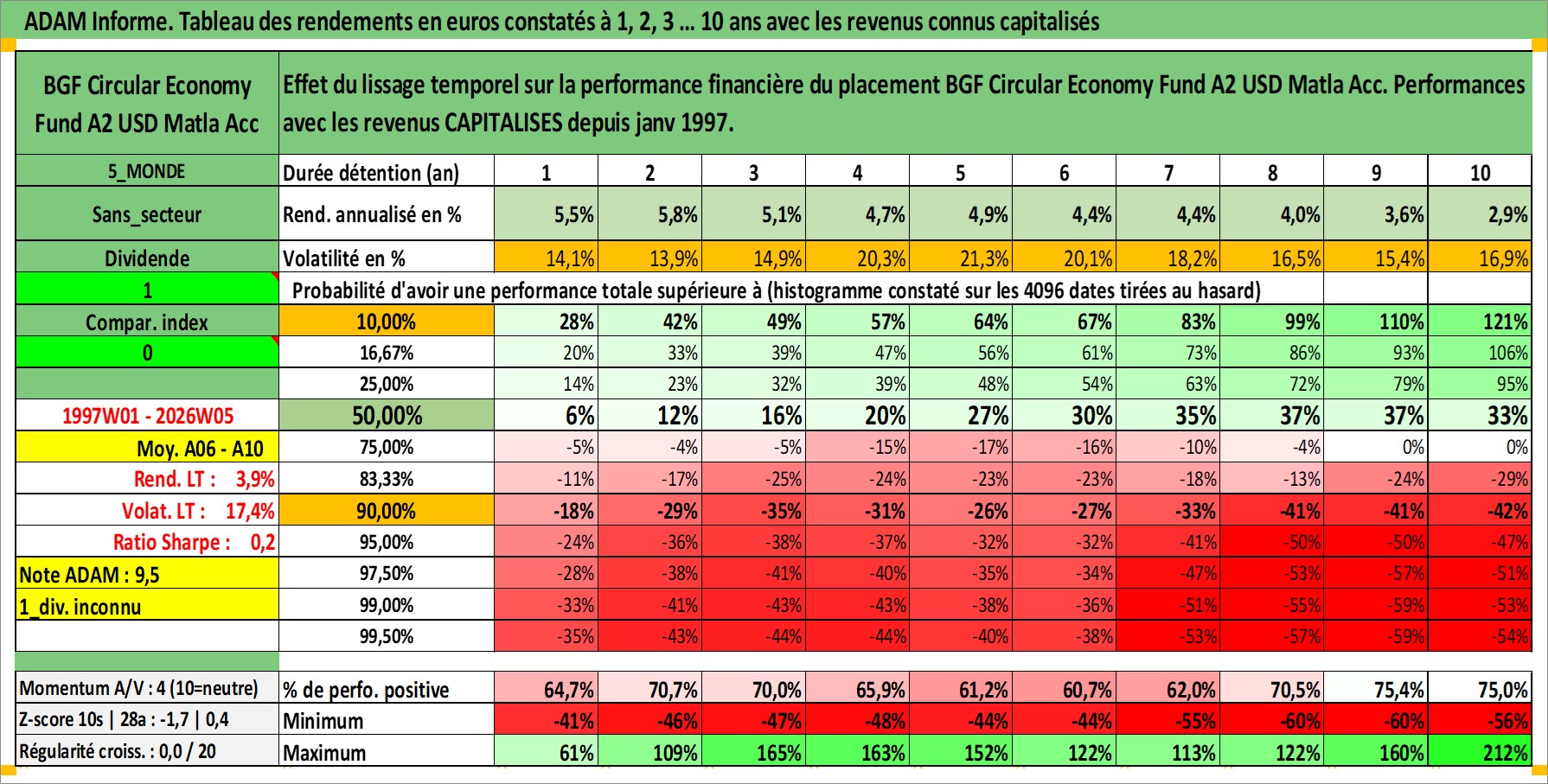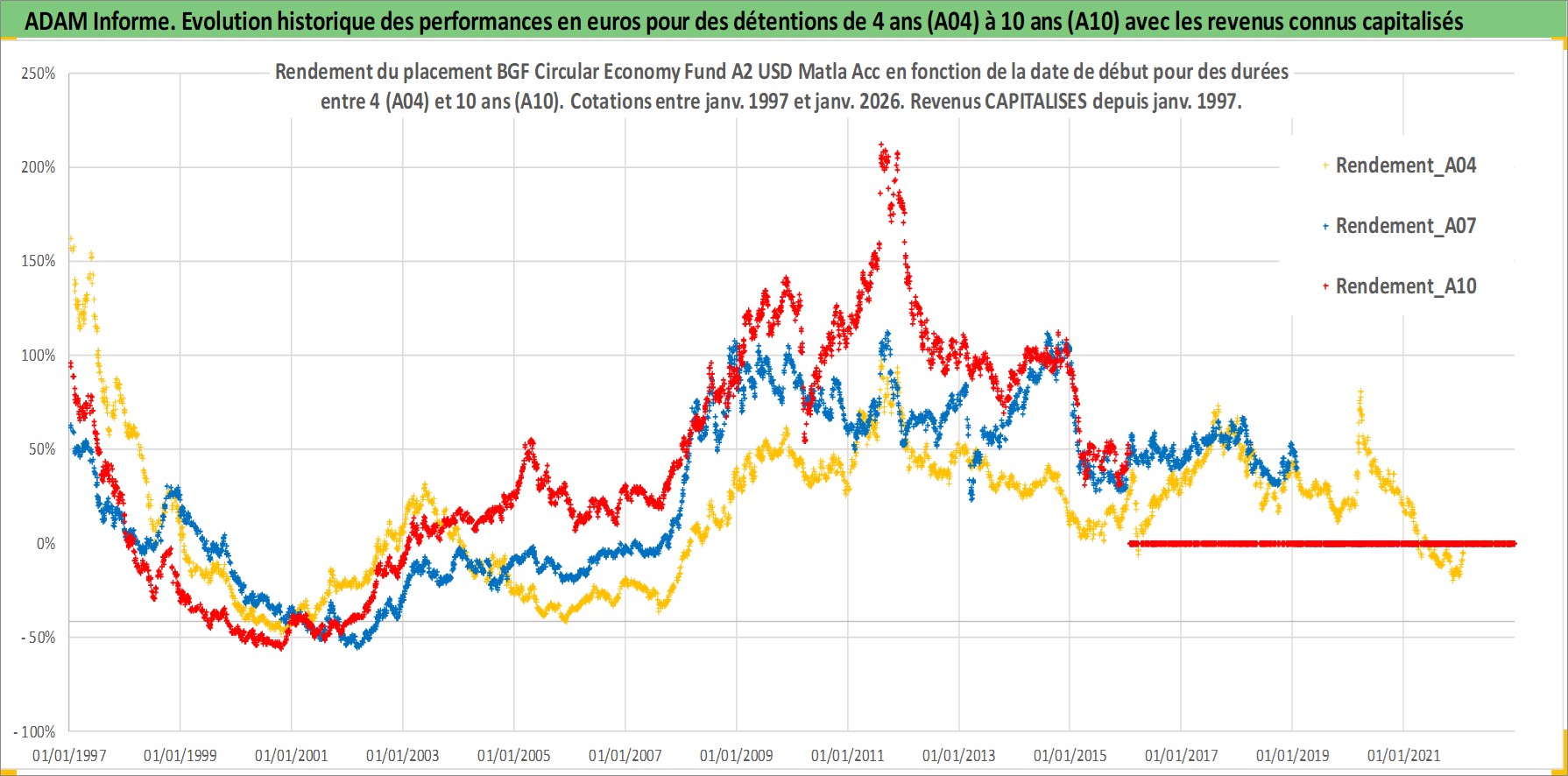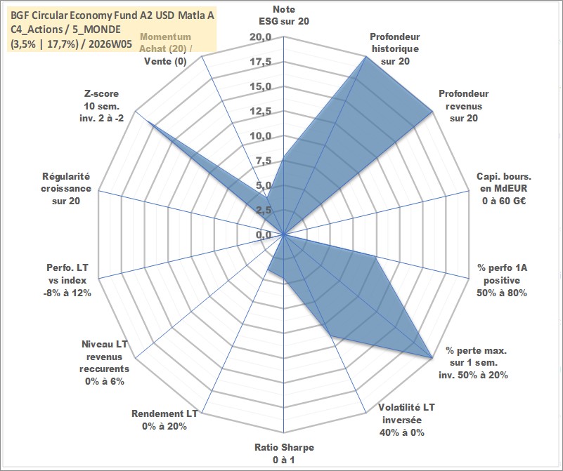 Site dédié aux investisseursPage dédiée sur site financeAnalyse des valorisations hebdomadaires du fonds BGF Circular Economy Fund A2 USD Matla Acc. Cet actif est cote en USD. Les valorisations sont en contrevaleur EURO et couvrent les semaines 1997W01 a 2026W05. Les revenus de cet actif financier sont pris en compte depuis la semaine 1997W01. La note globale ESG de cet actif est estimee a 7.9 (apres rebasage entre 0 et 20).