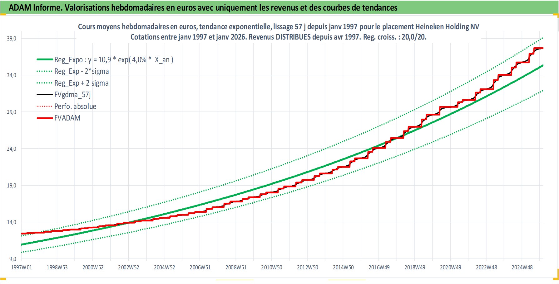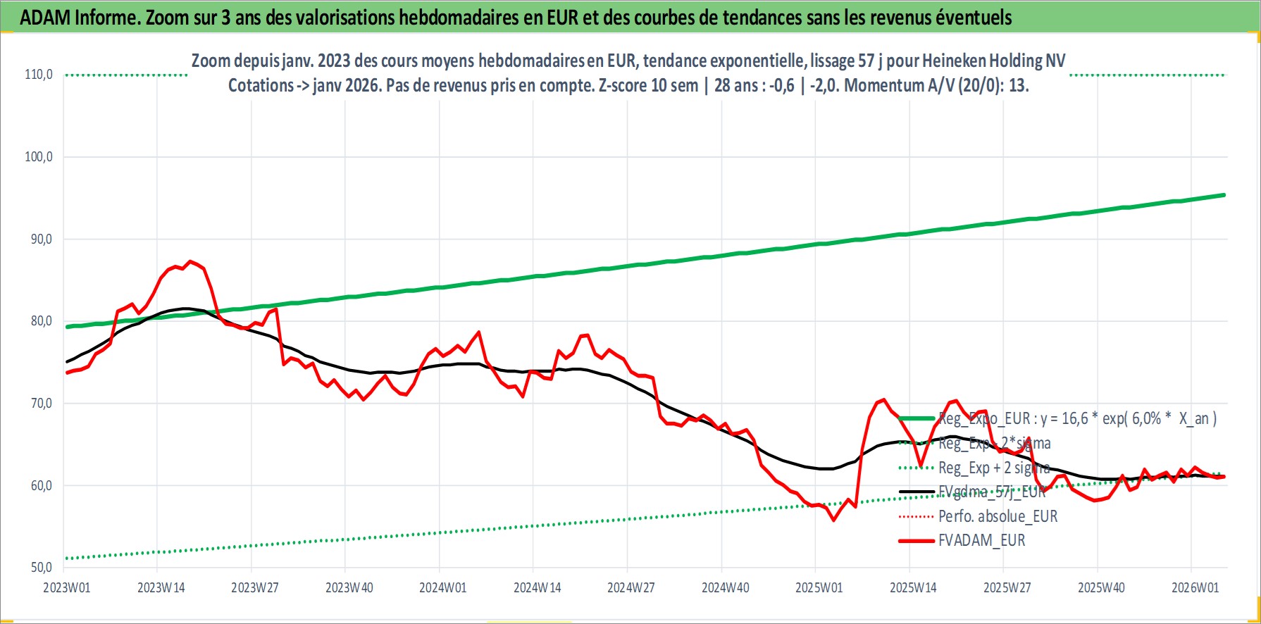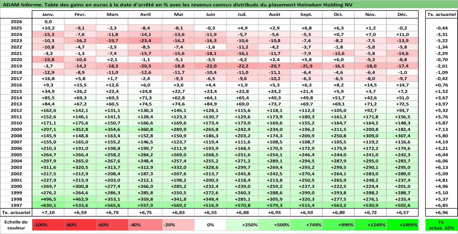 Site dédié aux investisseursPage dédiée sur site financeAnalyse des valorisations hebdomadaires de l'action Heineken Holding NV. Cet actif est cote en EUR. Les valorisations couvrent les semaines 1997W01 a 2026W05. Les revenus de cet actif financier sont pris en compte depuis la semaine 1997W17. La note globale ESG de cet actif est estimee a 10.0 (apres rebasage entre 0 et 20).