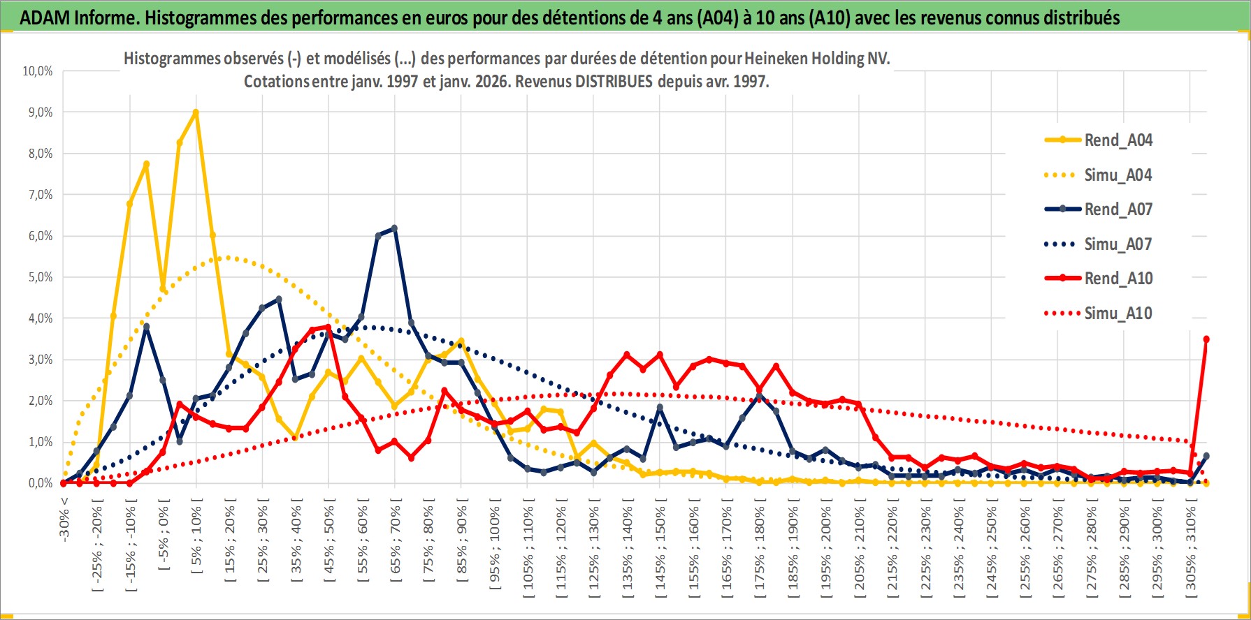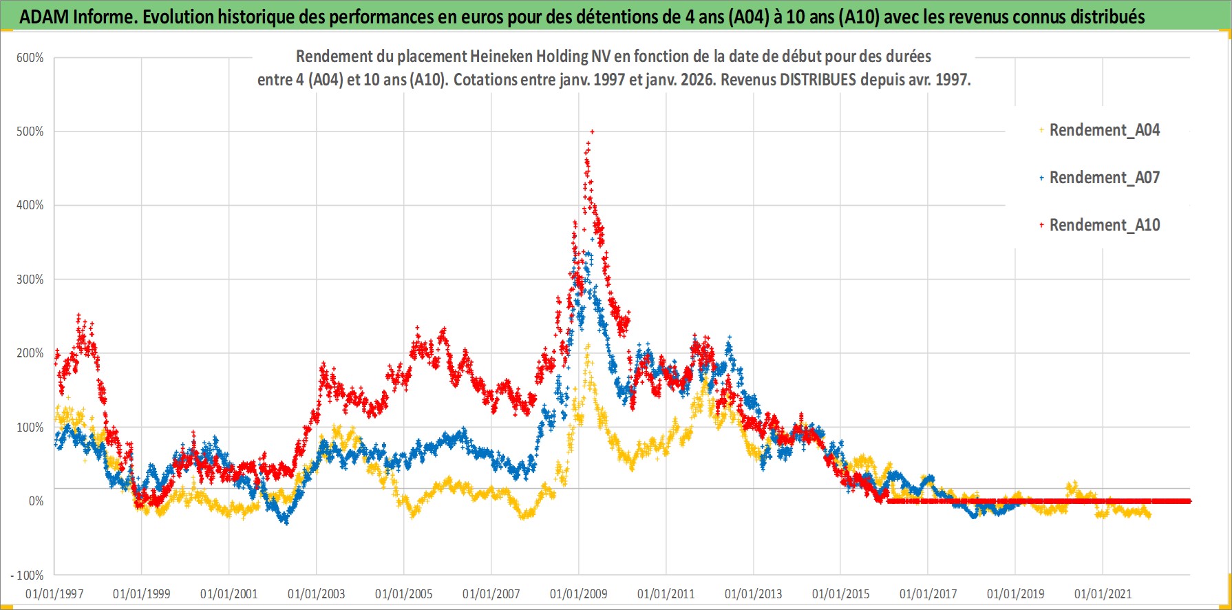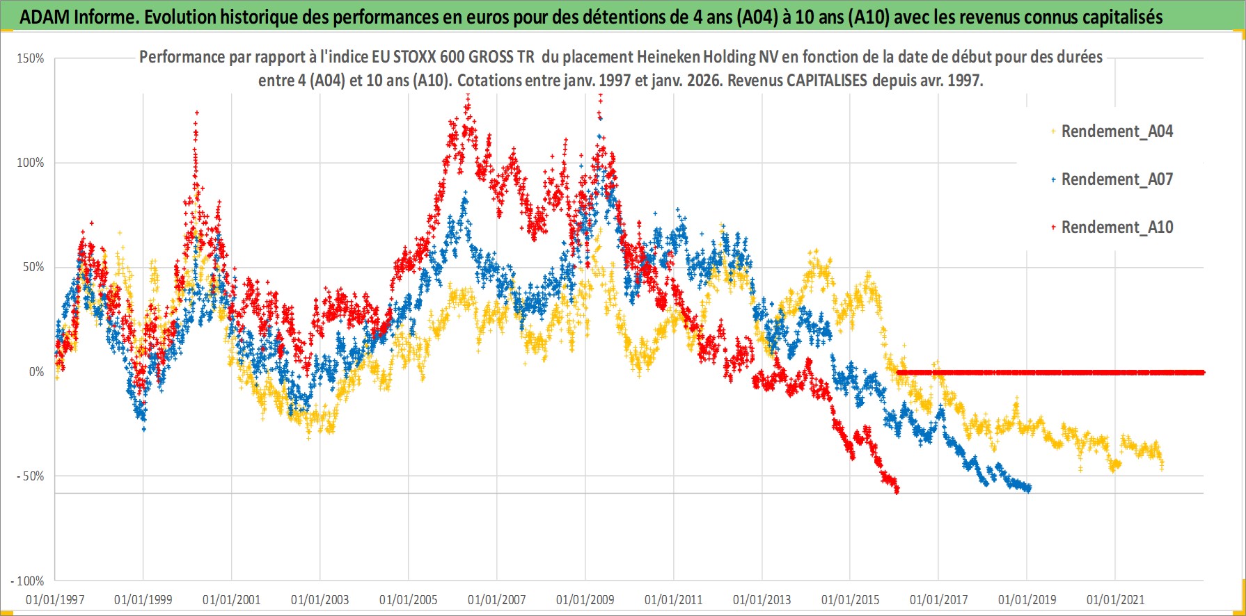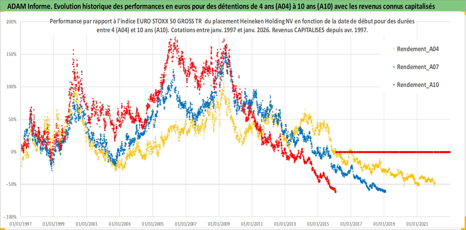 Site dédié aux investisseursPage dédiée sur site financeAnalyse des valorisations hebdomadaires de l'action Heineken Holding NV. Cet actif est cote en EUR. Les valorisations couvrent les semaines 1997W01 a 2026W05. Les revenus de cet actif financier sont pris en compte depuis la semaine 1997W17. La note globale ESG de cet actif est estimee a 10.0 (apres rebasage entre 0 et 20).