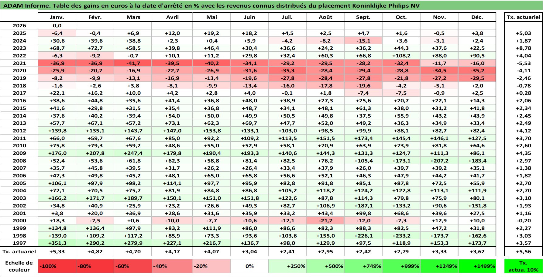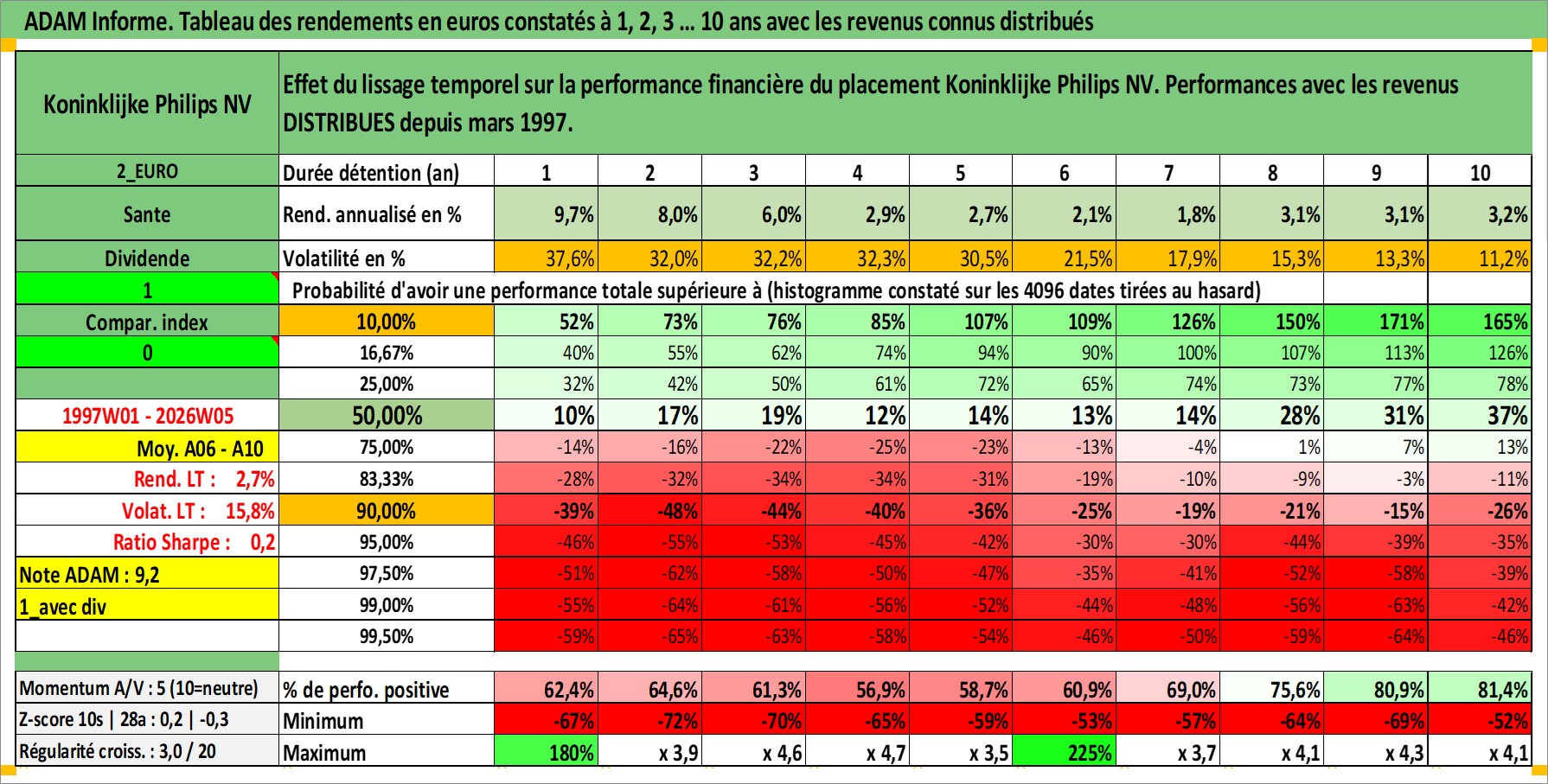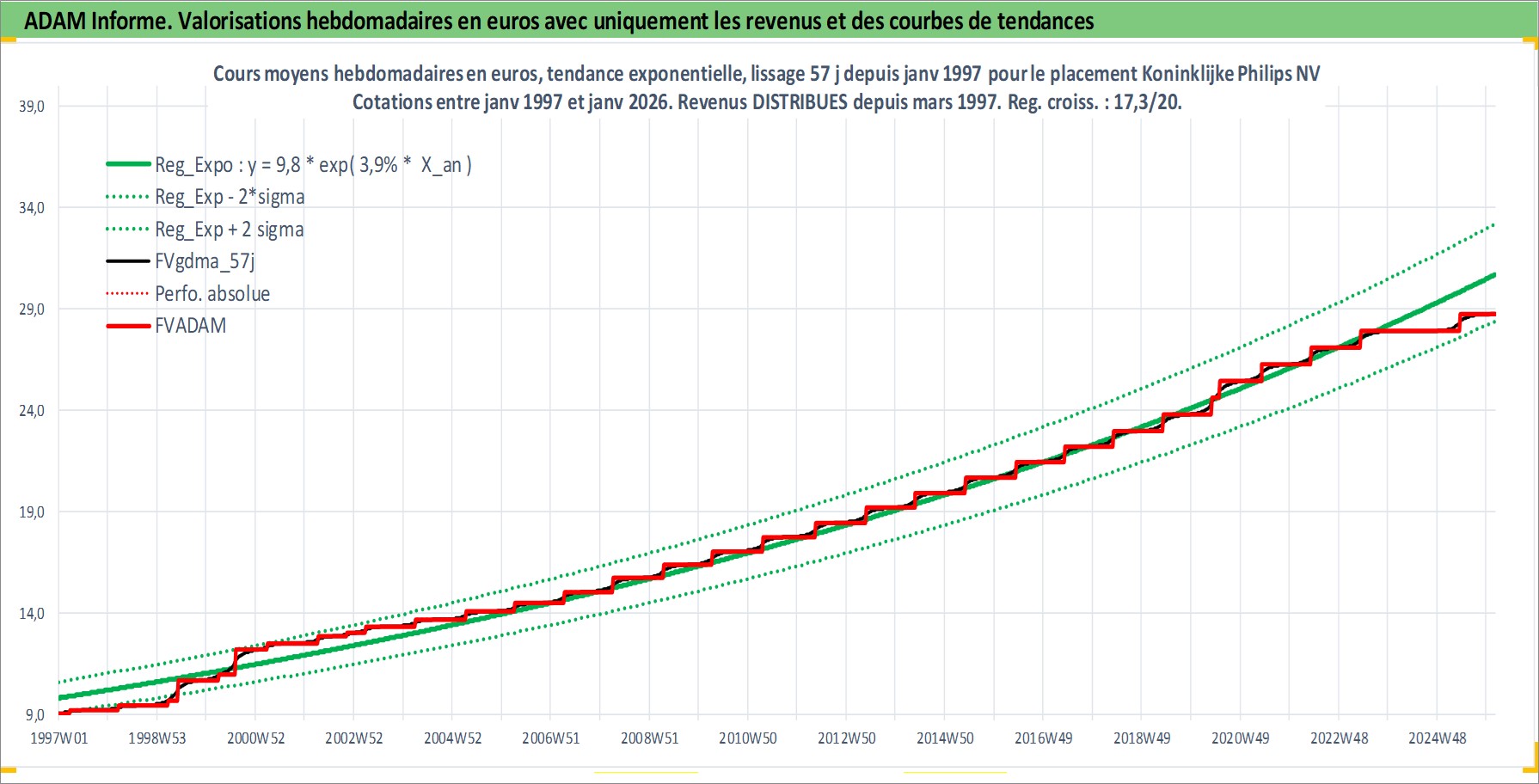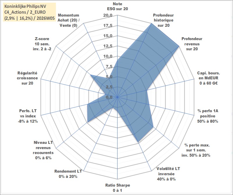 Site dédié aux investisseursPage dédiée sur site financeAnalyse des valorisations hebdomadaires de l'action Koninklijke Philips NV. Cet actif est cote en EUR. Les valorisations couvrent les semaines 1997W01 a 2026W05. Les revenus de cet actif financier sont pris en compte depuis la semaine 1997W13. La note globale ESG de cet actif est estimee a 9.0 (apres rebasage entre 0 et 20).