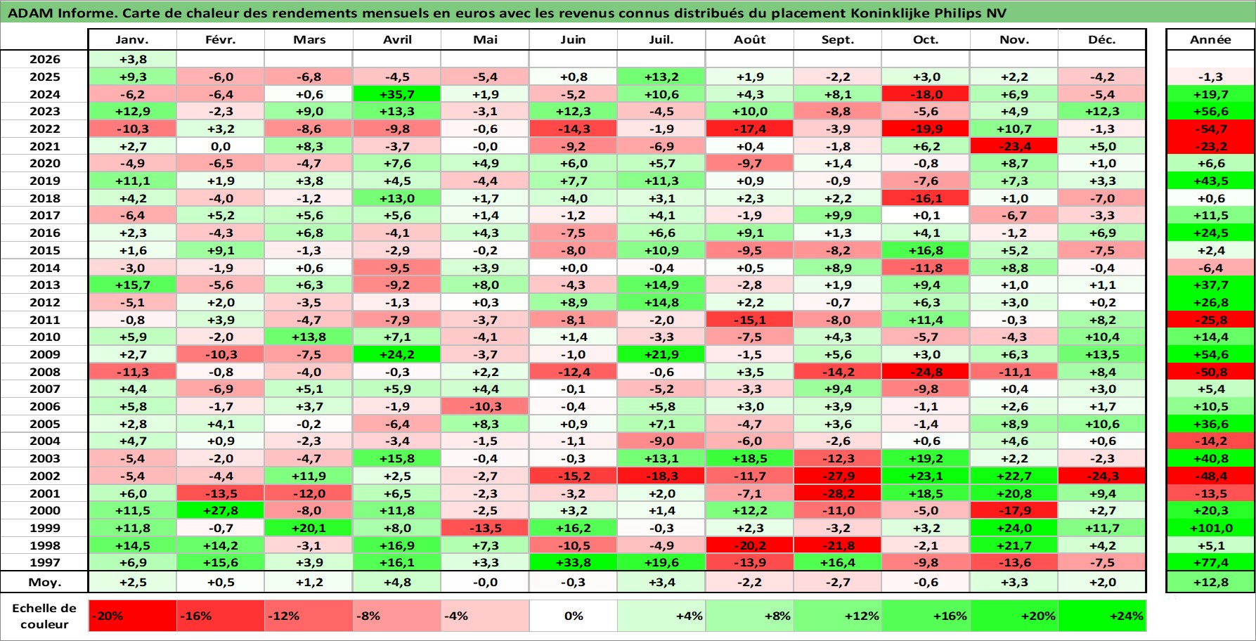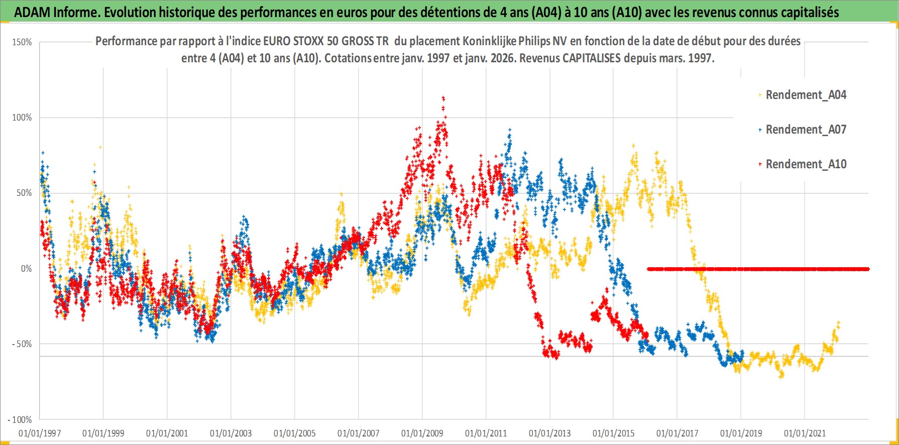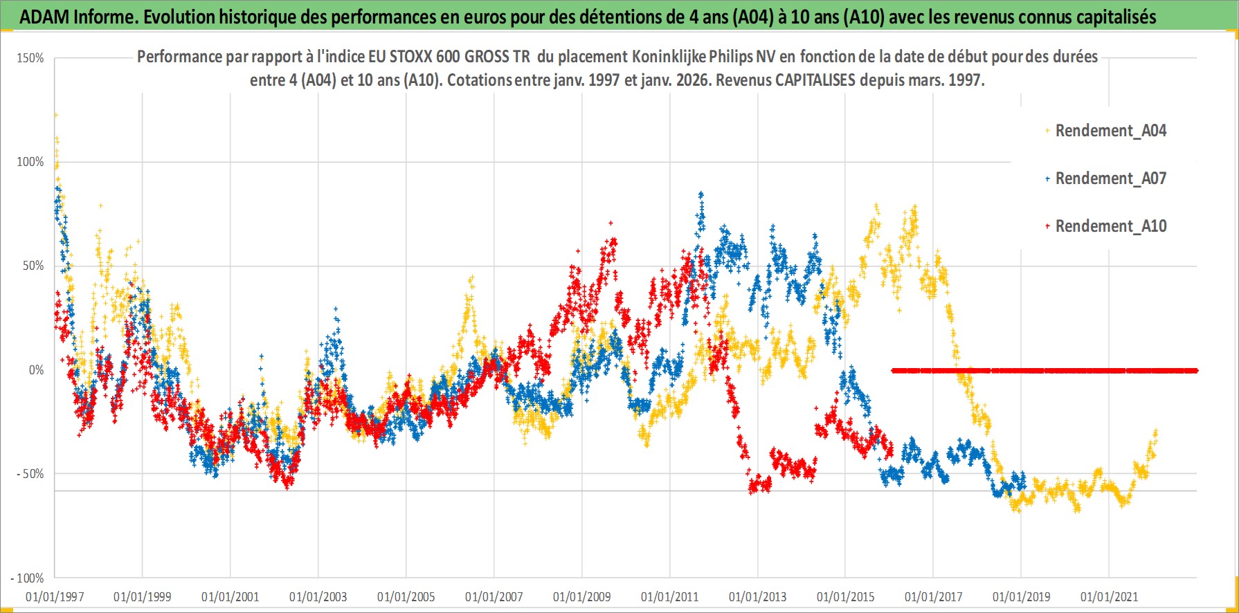 Site dédié aux investisseursPage dédiée sur site financeAnalyse des valorisations hebdomadaires de l'action Koninklijke Philips NV. Cet actif est cote en EUR. Les valorisations couvrent les semaines 1997W01 a 2026W05. Les revenus de cet actif financier sont pris en compte depuis la semaine 1997W13. La note globale ESG de cet actif est estimee a 9.0 (apres rebasage entre 0 et 20).