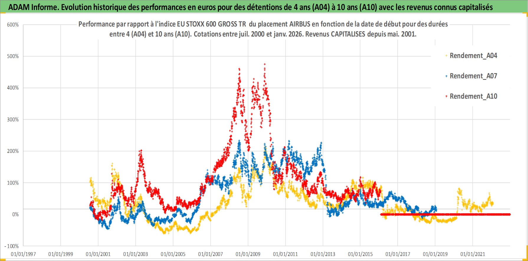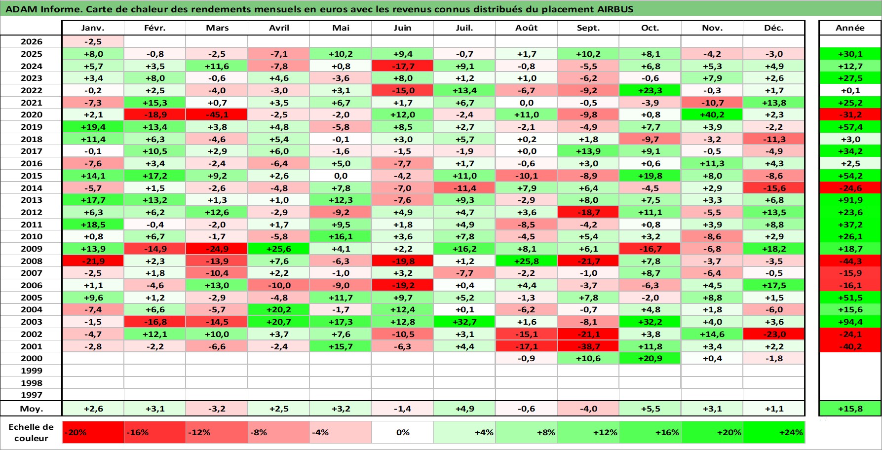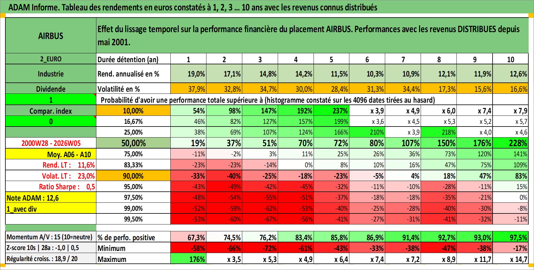 Site dédié aux investisseursPage dédiée sur site financeAnalyse des valorisations hebdomadaires de l'action AIRBUS. Cet actif est cote en EUR. Les valorisations couvrent les semaines 2000W28 a 2026W05. Les revenus de cet actif financier sont pris en compte depuis la semaine 2001W20. La note globale ESG de cet actif est estimee a 7.0 (apres rebasage entre 0 et 20).