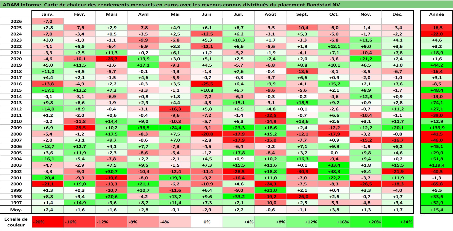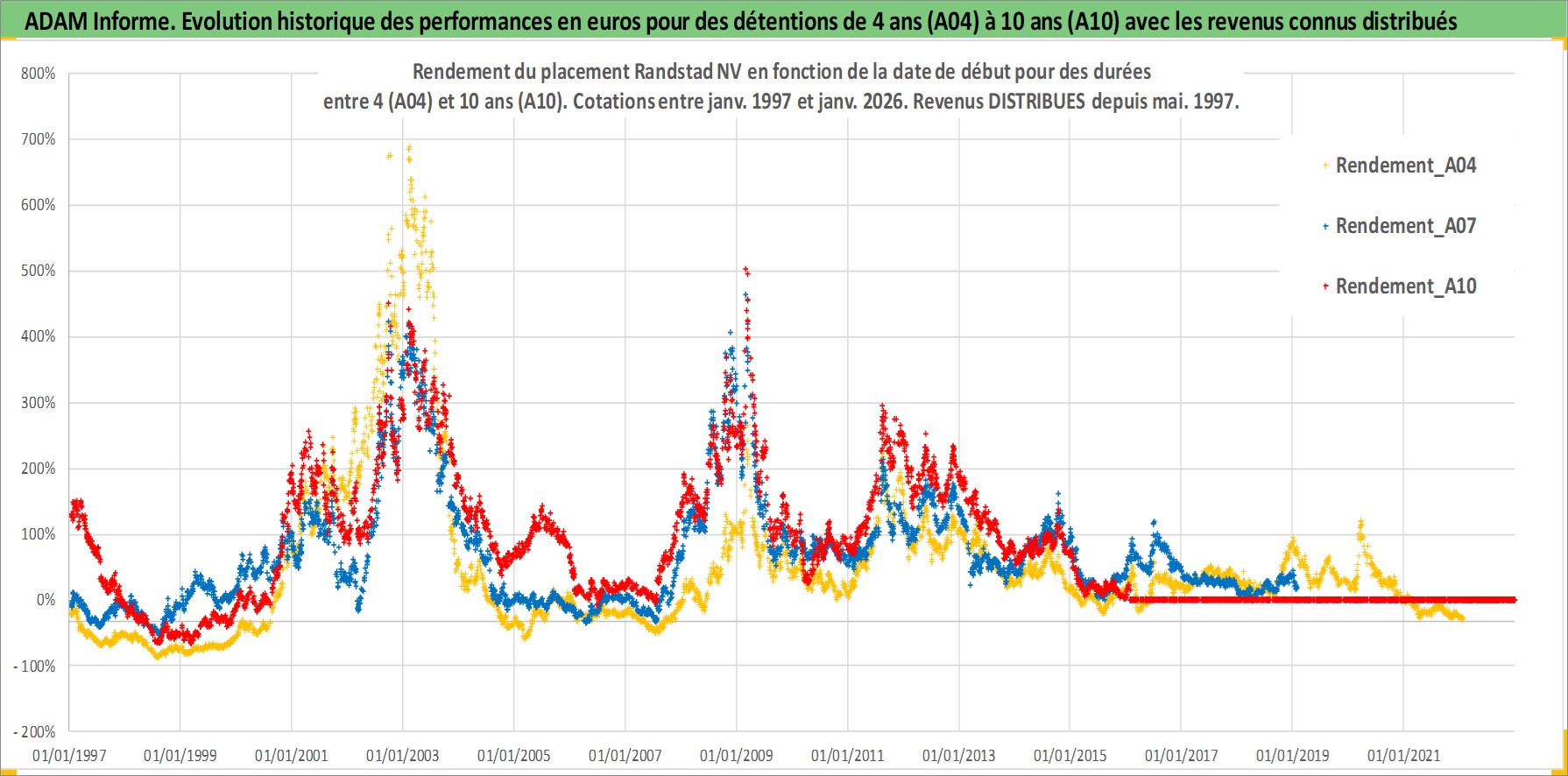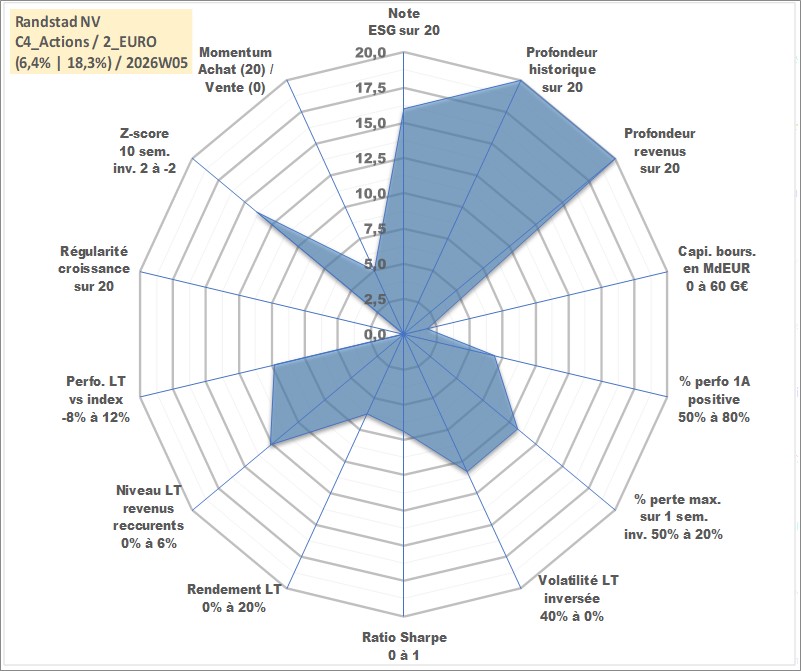 Site dédié aux investisseursPage dédiée sur site financeAnalyse des valorisations hebdomadaires de l'action Randstad NV. Cet actif est cote en EUR. Les valorisations couvrent les semaines 1997W01 a 2026W05. Les revenus de cet actif financier sont pris en compte depuis la semaine 1997W21. La note globale ESG de cet actif est estimee a 16.0 (apres rebasage entre 0 et 20).