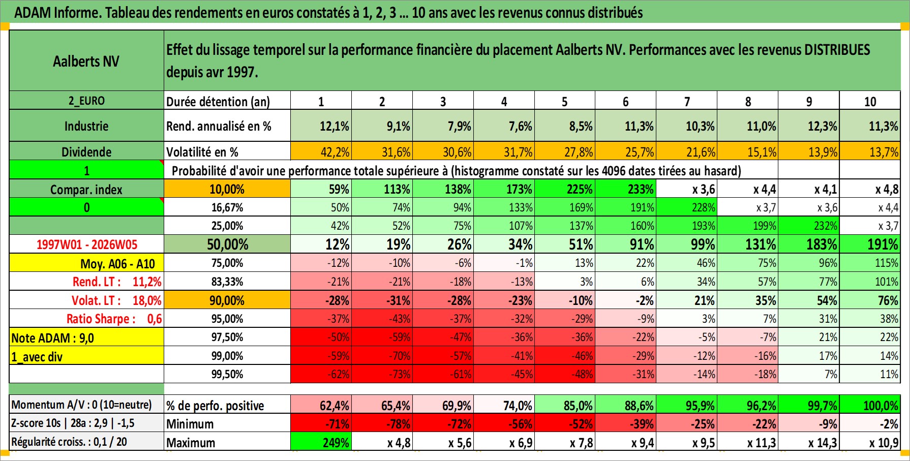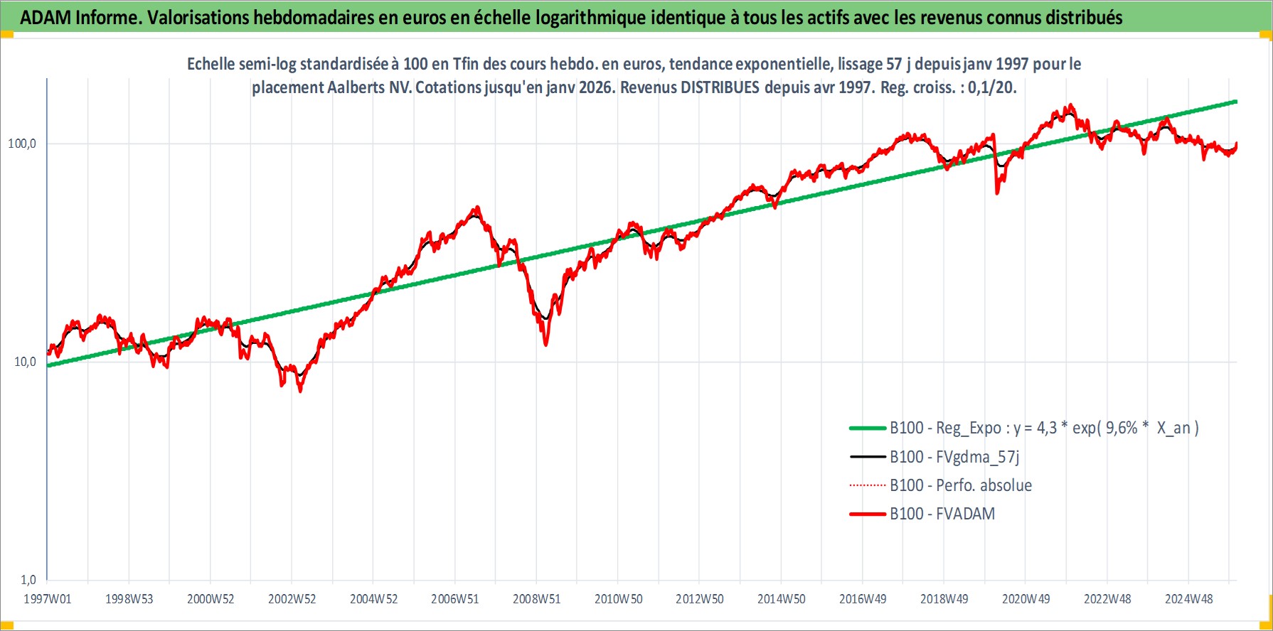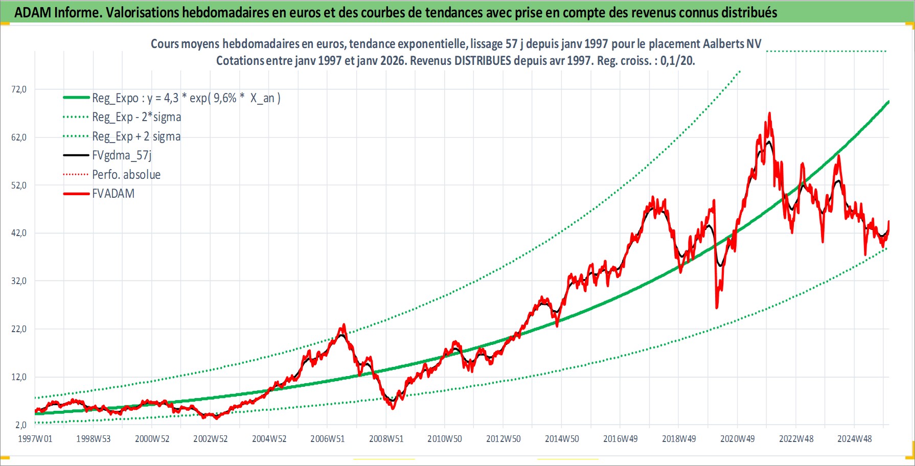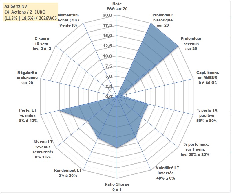 Site dédié aux investisseursPage dédiée sur site financeAnalyse des valorisations hebdomadaires de l'action Aalberts NV. Cet actif est cote en EUR. Les valorisations couvrent les semaines 1997W01 a 2026W05. Les revenus de cet actif financier sont pris en compte depuis la semaine 1997W16. La note ESG de cet actif n'est pas connue.