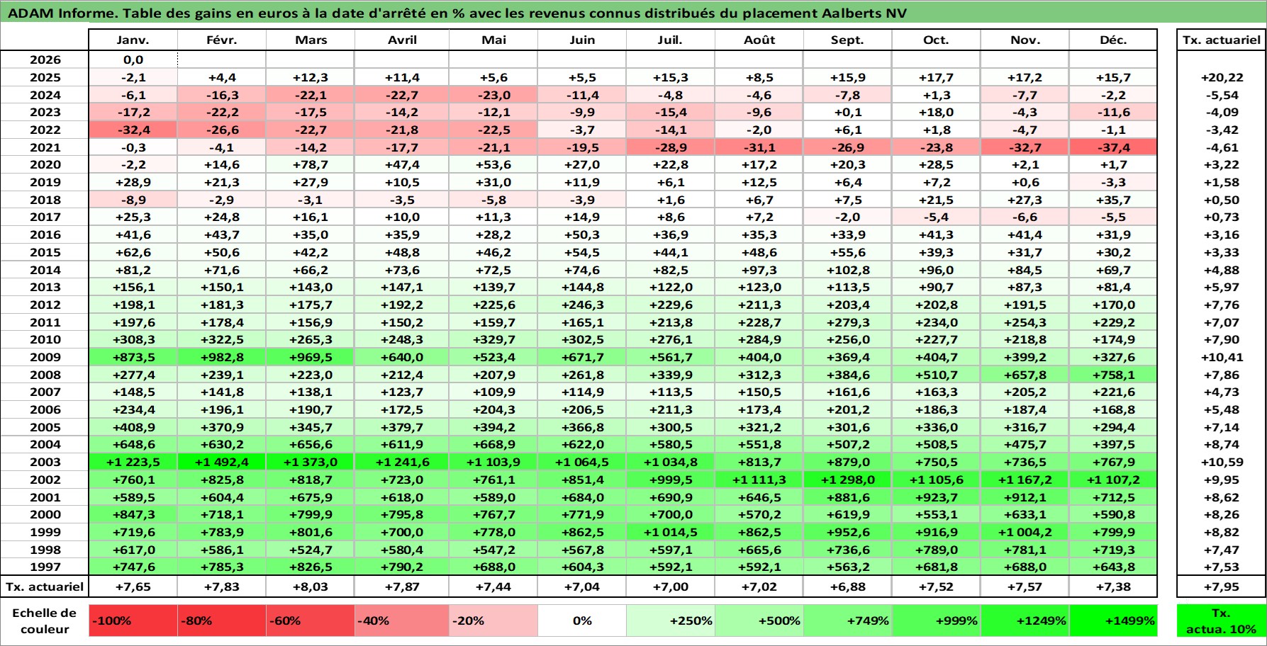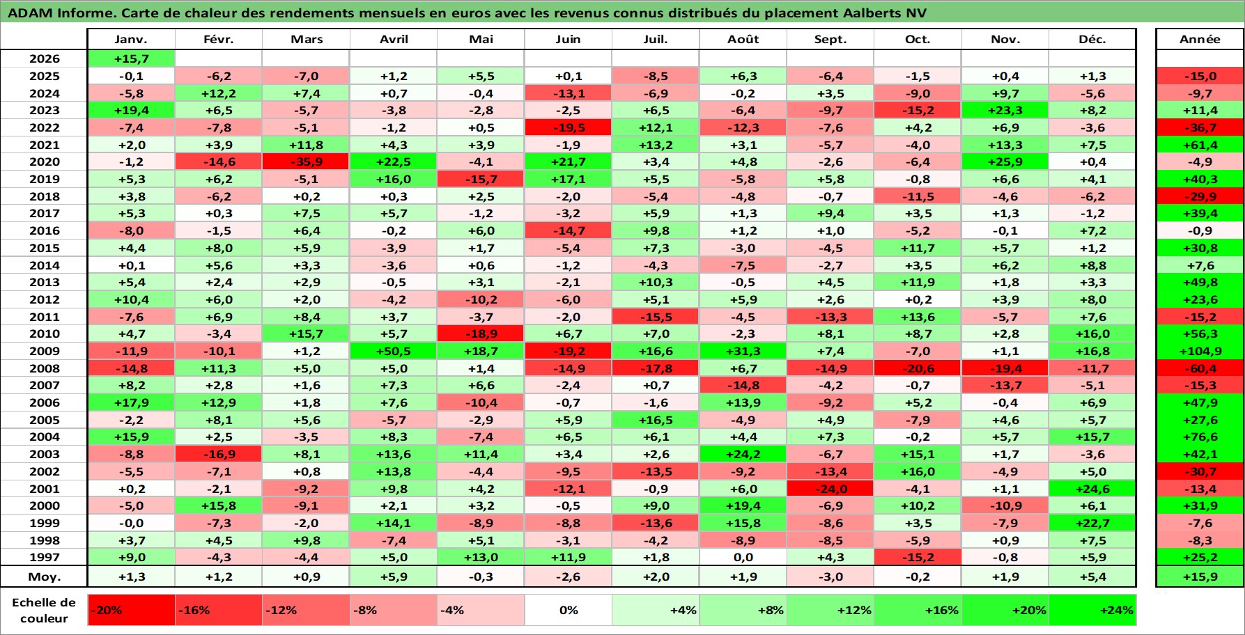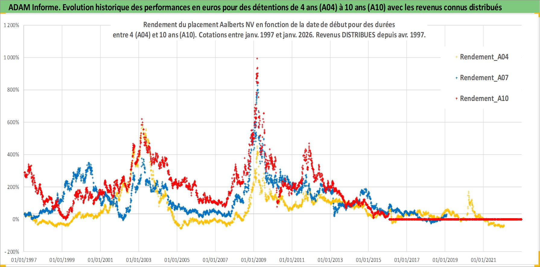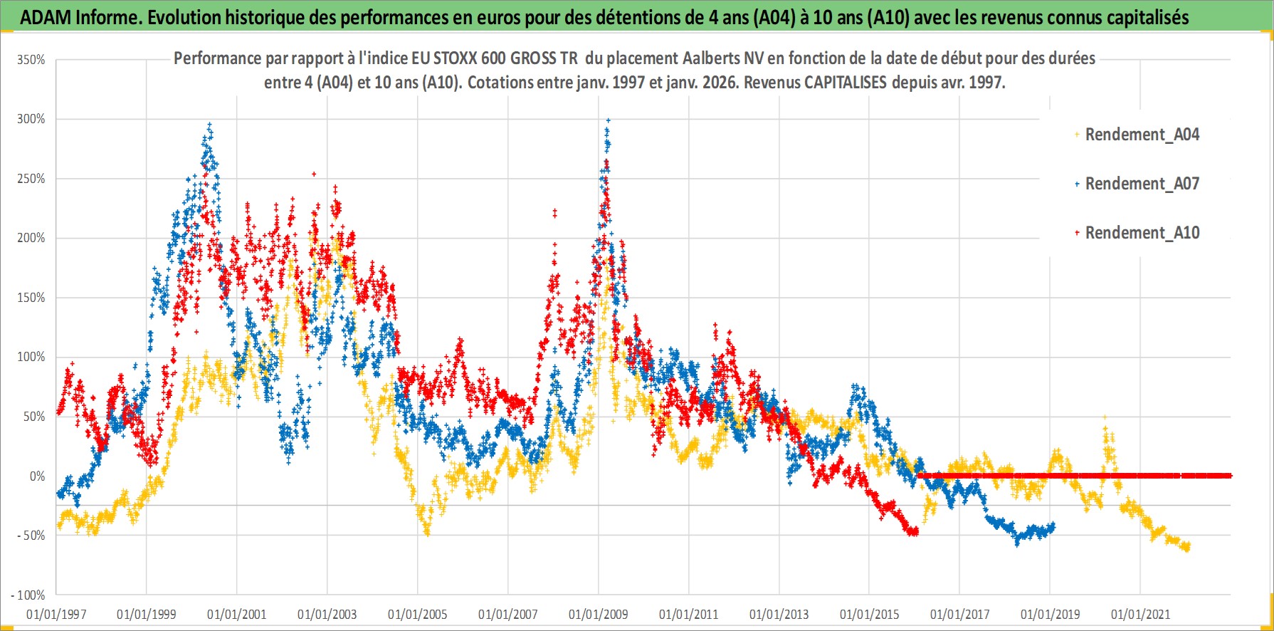 Site dédié aux investisseursPage dédiée sur site financeAnalyse des valorisations hebdomadaires de l'action Aalberts NV. Cet actif est cote en EUR. Les valorisations couvrent les semaines 1997W01 a 2026W05. Les revenus de cet actif financier sont pris en compte depuis la semaine 1997W16. La note ESG de cet actif n'est pas connue.