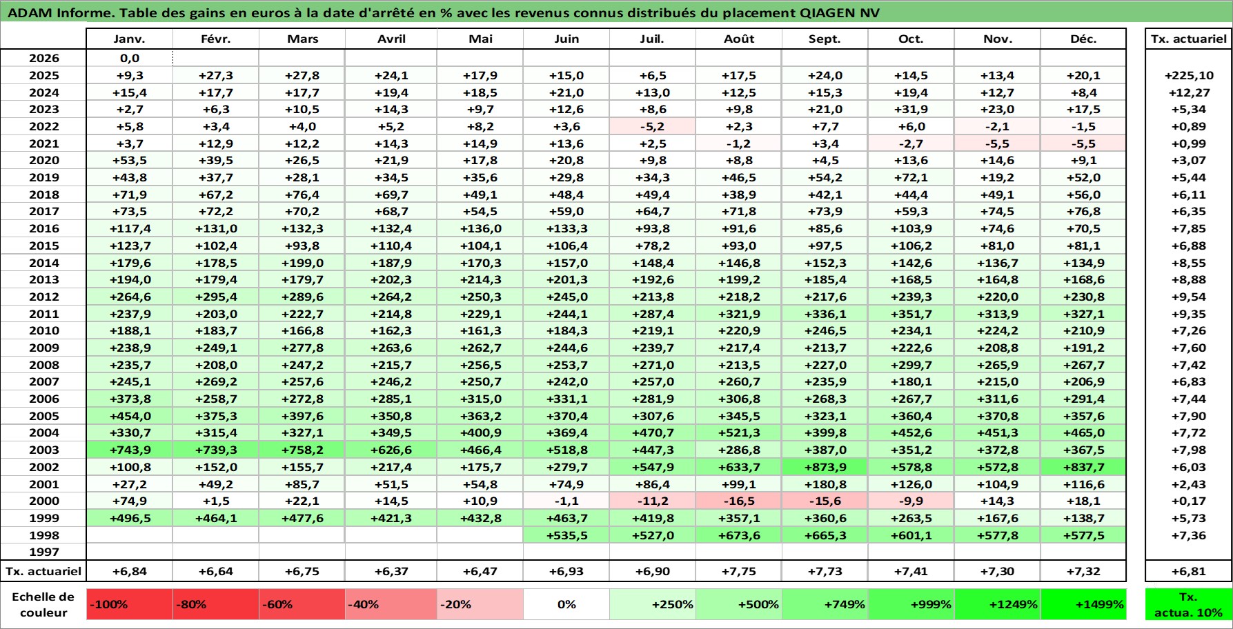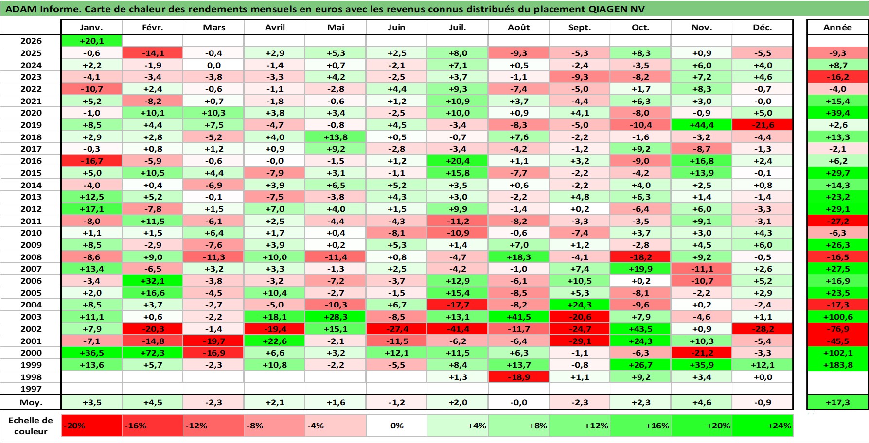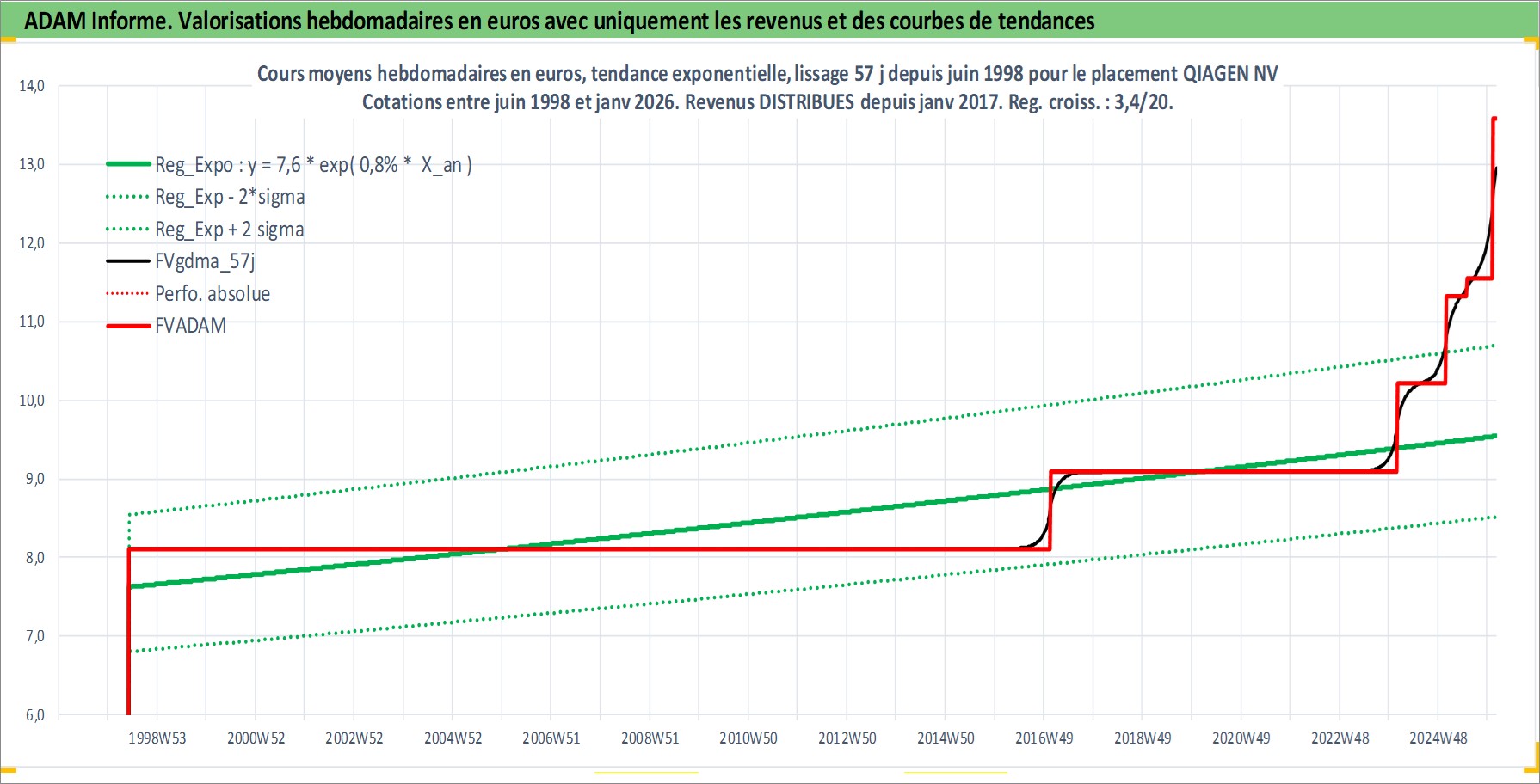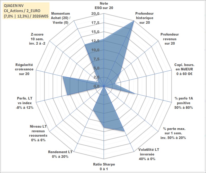 Site dédié aux investisseursPage dédiée sur site financeAnalyse des valorisations hebdomadaires de l'action QIAGEN NV. Cet actif est cote en EUR. Les valorisations couvrent les semaines 1998W23 a 2026W05. Les revenus de cet actif financier sont pris en compte depuis la semaine 2017W04. La note globale ESG de cet actif est estimee a 13.0 (apres rebasage entre 0 et 20).