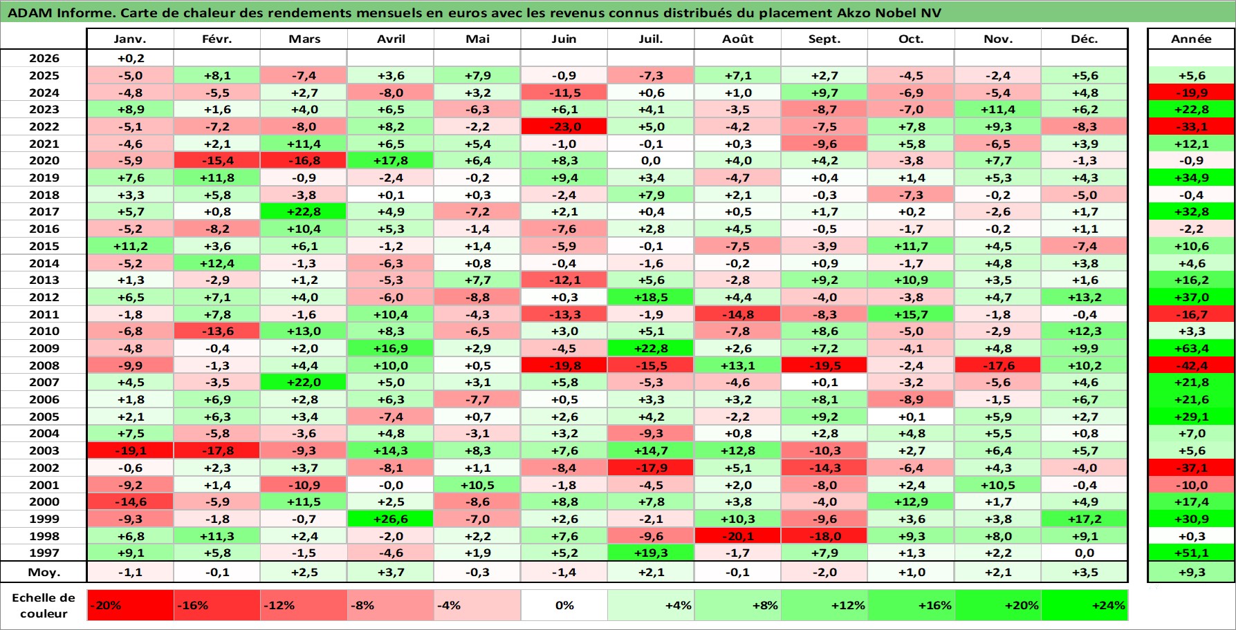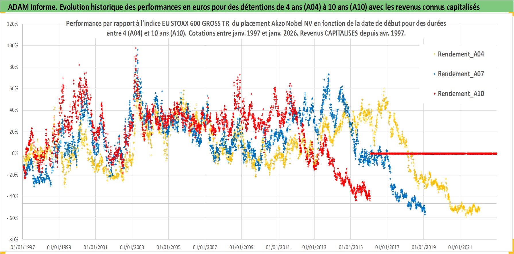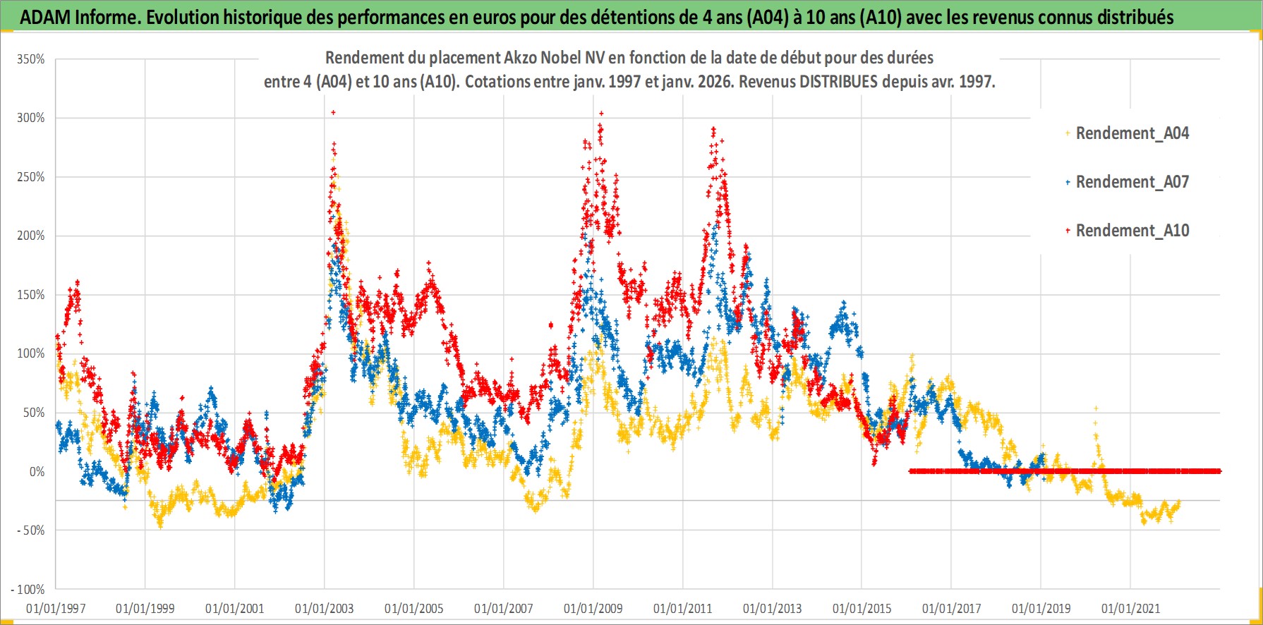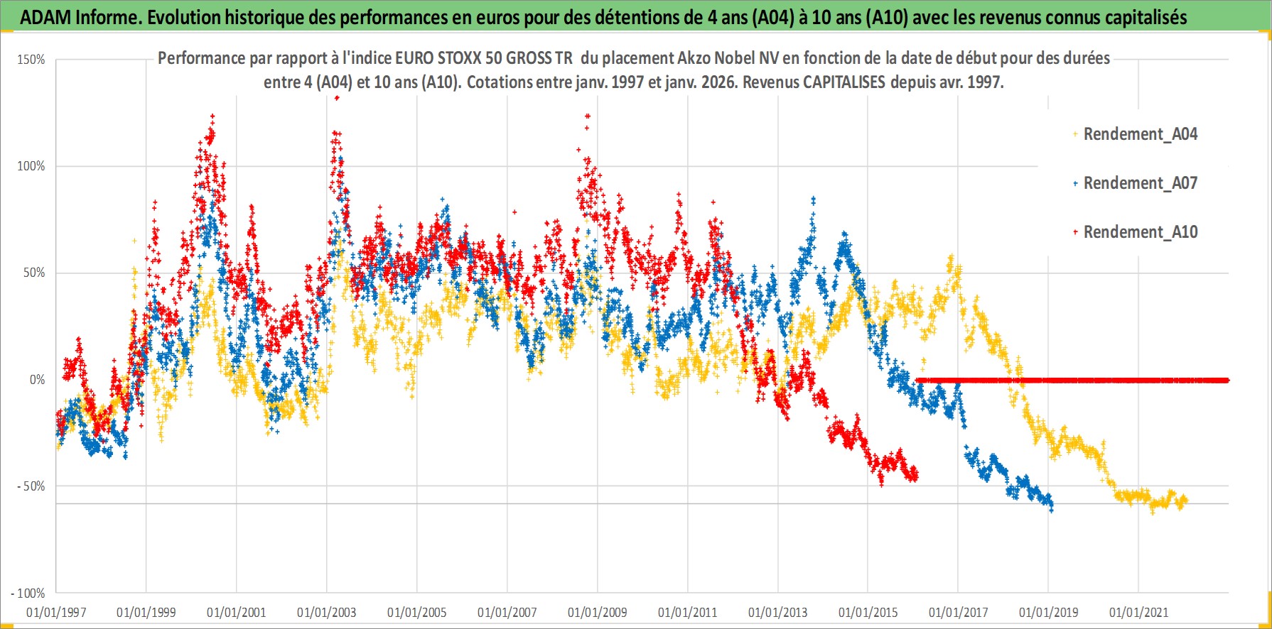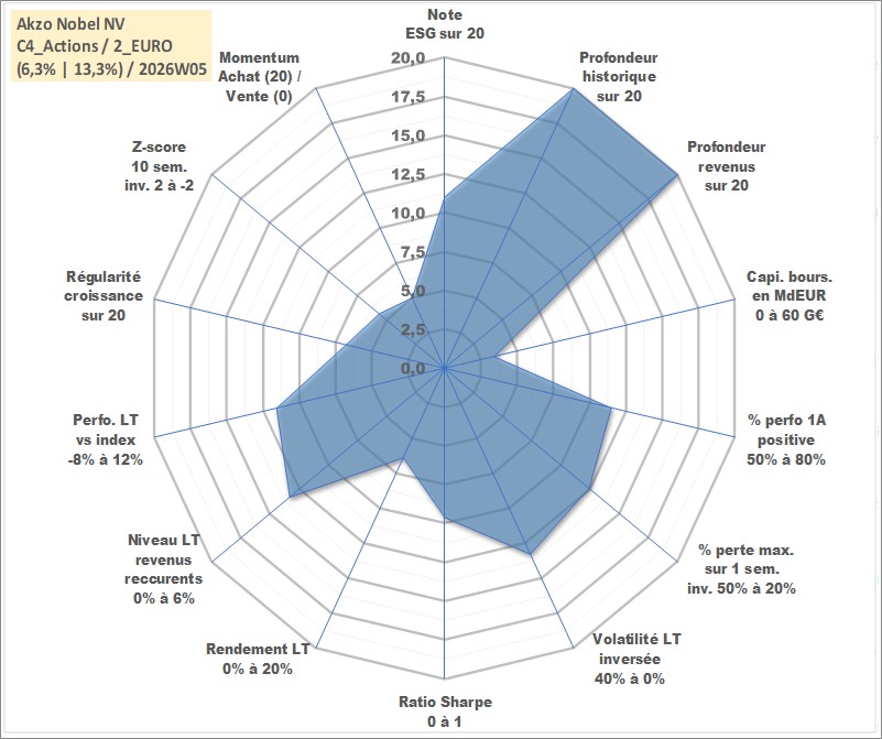 Site dédié aux investisseursPage dédiée sur site financeAnalyse des valorisations hebdomadaires de l'action Akzo Nobel NV. Cet actif est cote en EUR. Les valorisations couvrent les semaines 1997W01 a 2026W05. Les revenus de cet actif financier sont pris en compte depuis la semaine 1997W18. La note globale ESG de cet actif est estimee a 11.0 (apres rebasage entre 0 et 20).