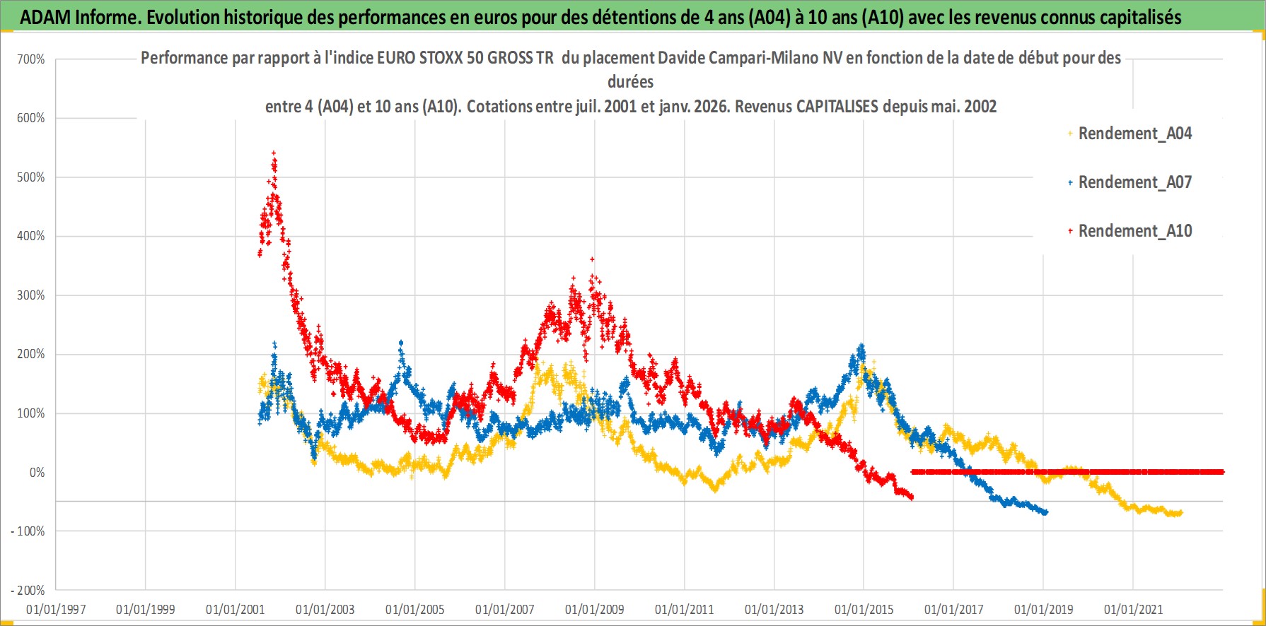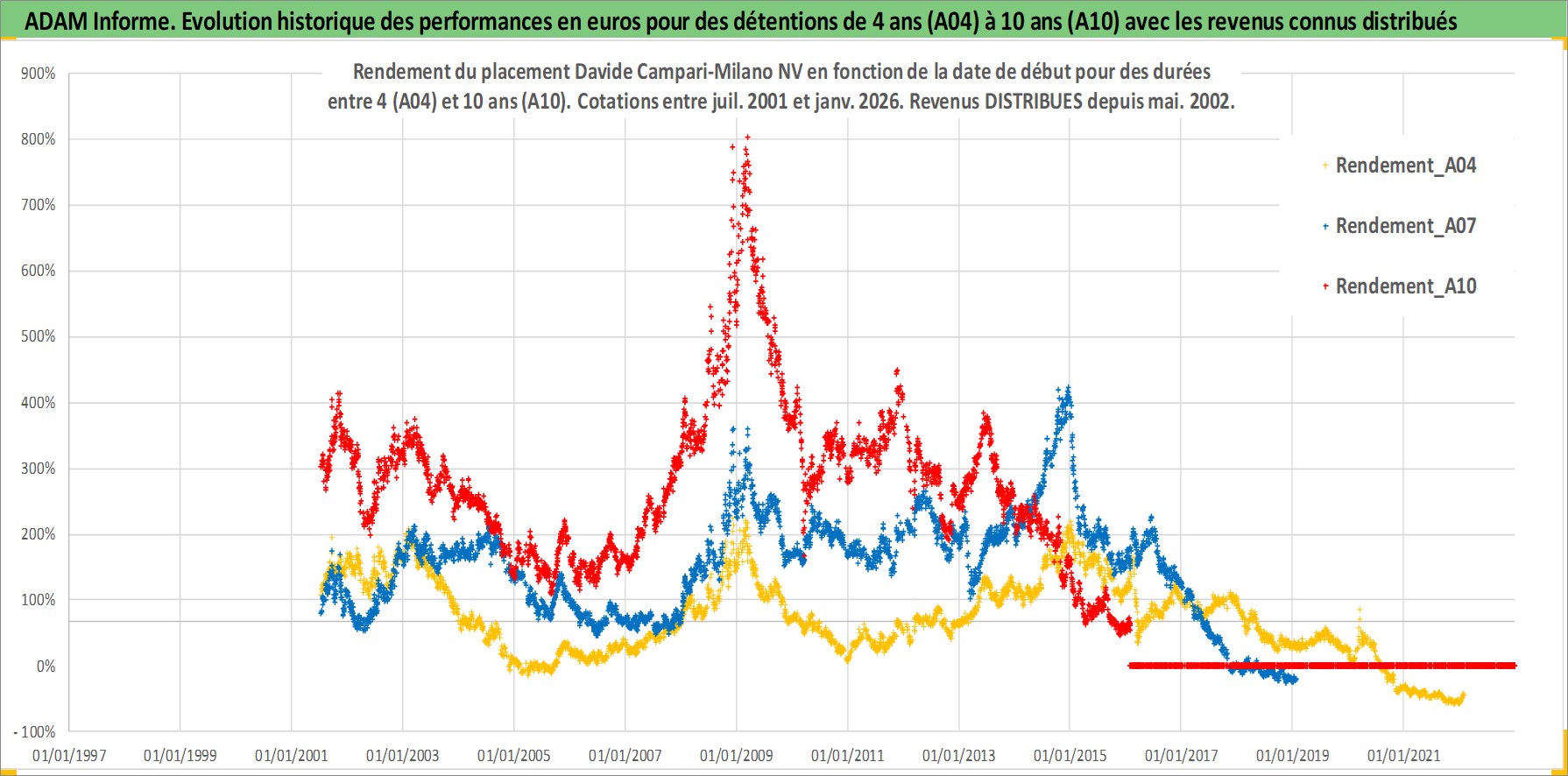 Site dédié aux investisseursPage dédiée sur site financeAnalyse des valorisations hebdomadaires de l'action Davide Campari-Milano NV. Cet actif est cote en EUR. Les valorisations couvrent les semaines 2001W27 a 2026W05. Les revenus de cet actif financier sont pris en compte depuis la semaine 2002W19. La note globale ESG de cet actif est estimee a 11.0 (apres rebasage entre 0 et 20).