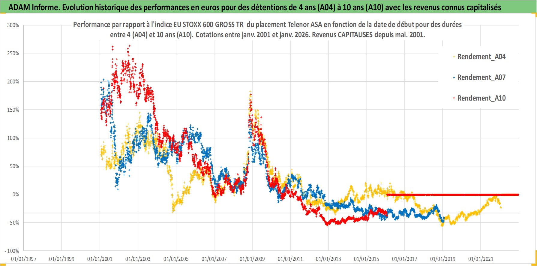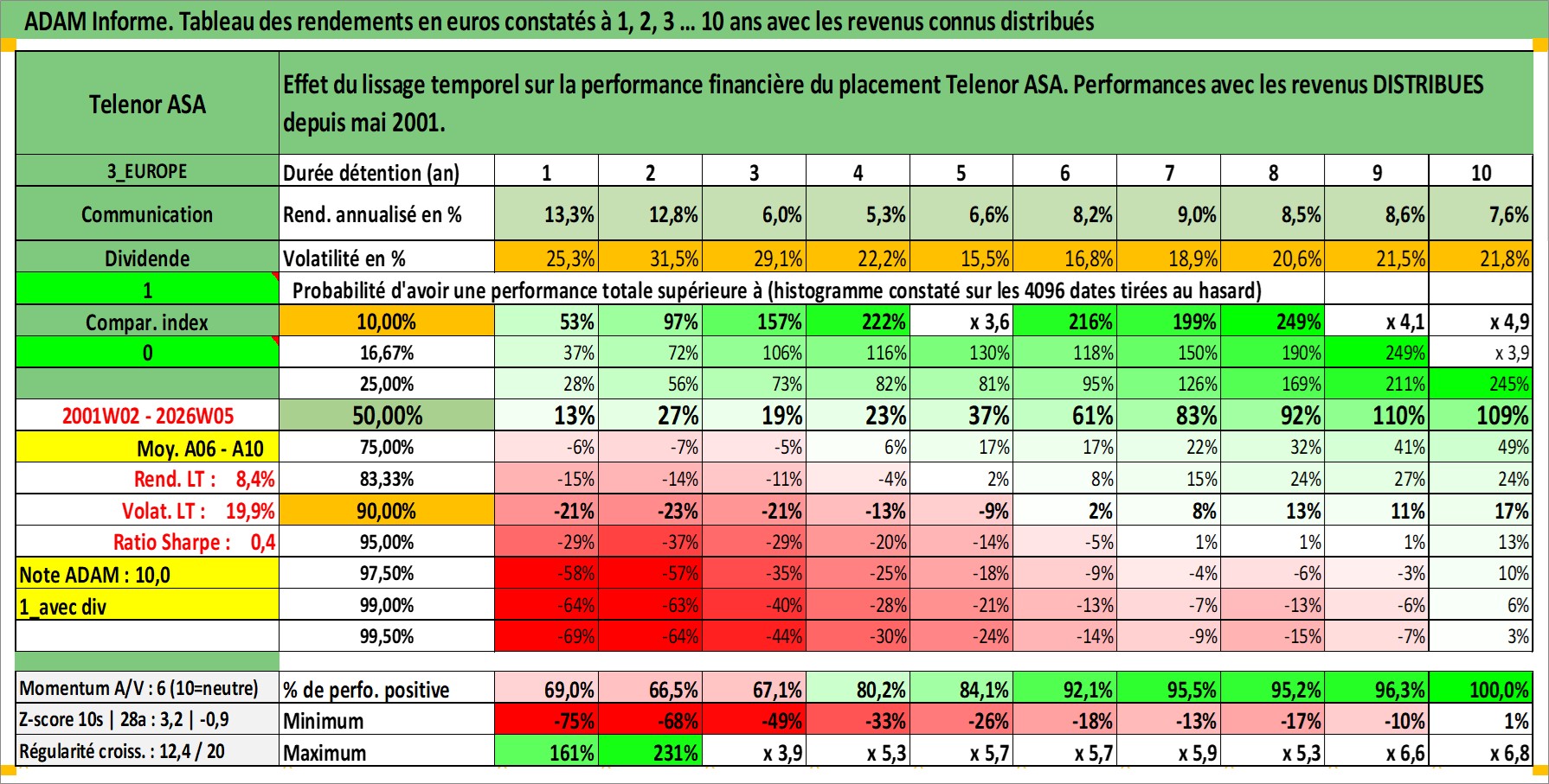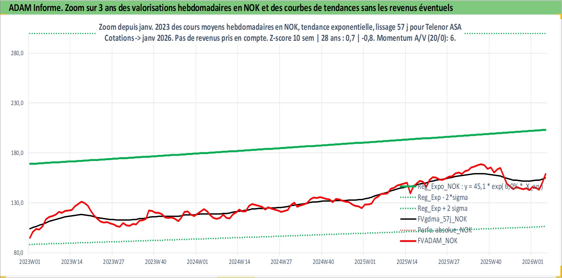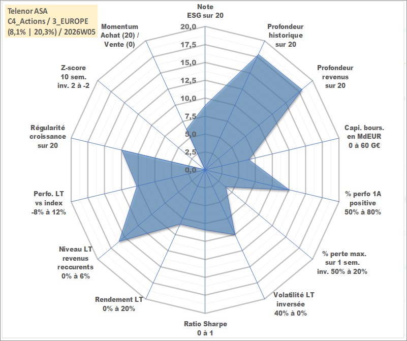 Site dédié aux investisseursPage dédiée sur site financeAnalyse des valorisations hebdomadaires de l'action Telenor ASA. Cet actif est cote en NOK. Les valorisations sont en contrevaleur EURO et couvrent les semaines 2001W02 a 2026W05. Les revenus de cet actif financier sont pris en compte depuis la semaine 2001W19. La note globale ESG de cet actif est estimee a 9.0 (apres rebasage entre 0 et 20).