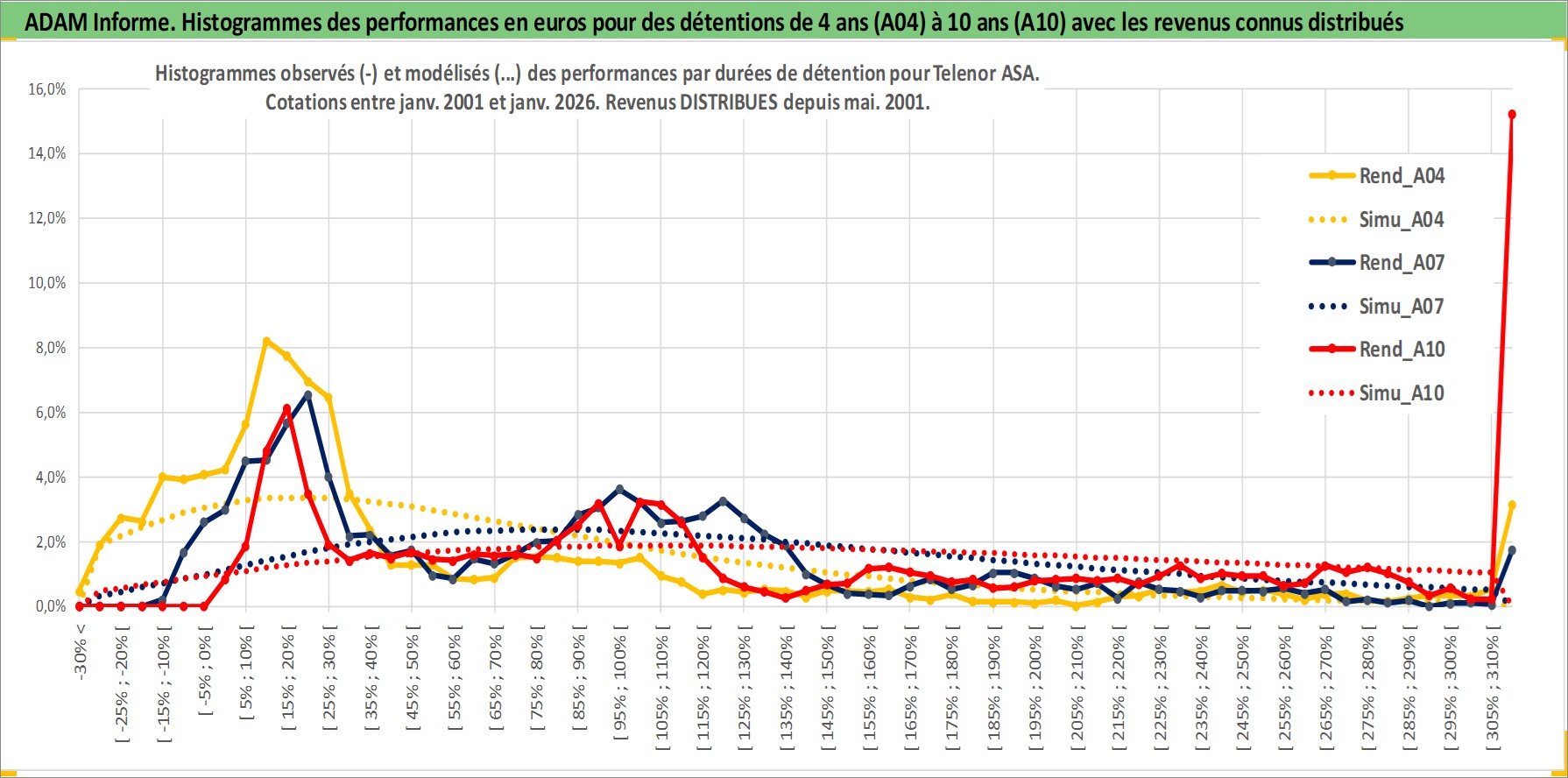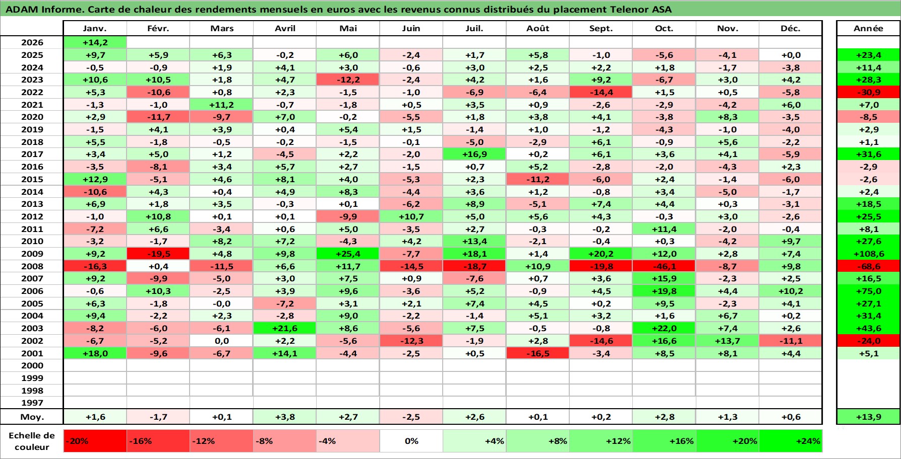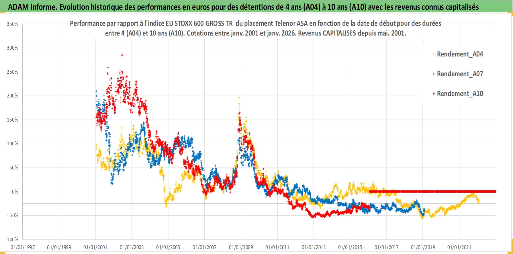 Site dédié aux investisseursPage dédiée sur site financeAnalyse des valorisations hebdomadaires de l'action Telenor ASA. Cet actif est cote en NOK. Les valorisations sont en contrevaleur EURO et couvrent les semaines 2001W02 a 2026W05. Les revenus de cet actif financier sont pris en compte depuis la semaine 2001W19. La note globale ESG de cet actif est estimee a 9.0 (apres rebasage entre 0 et 20).