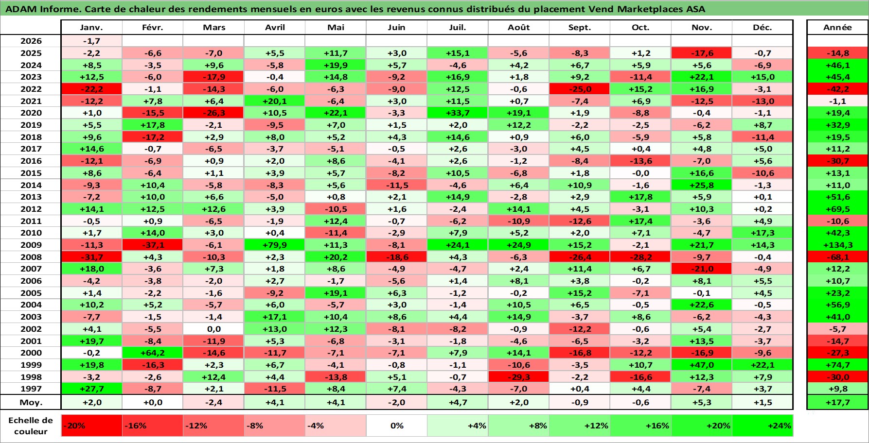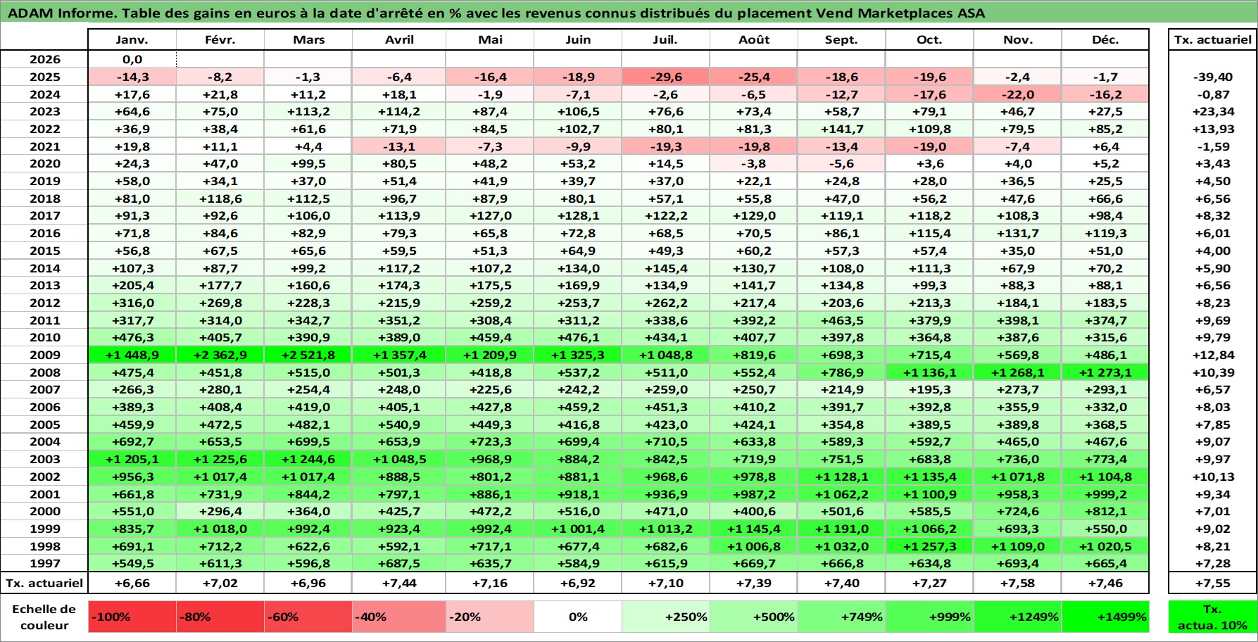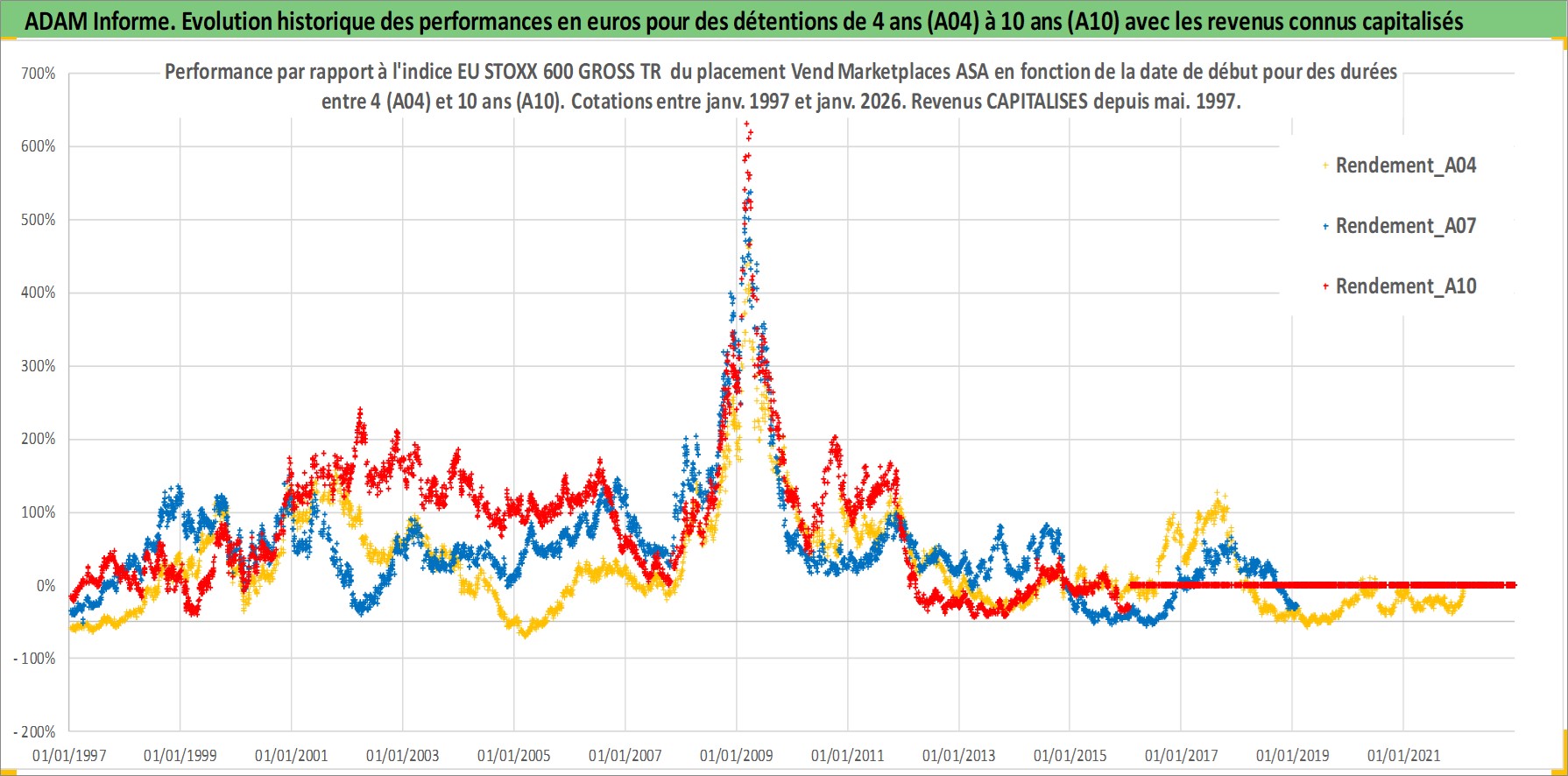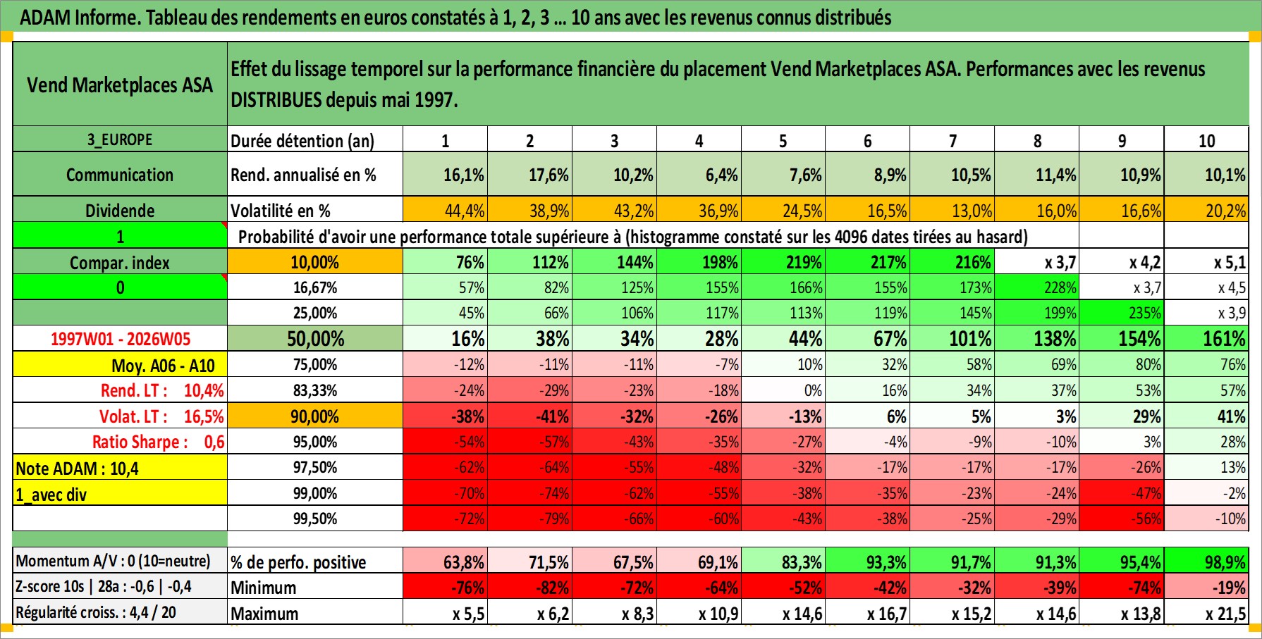 Site dédié aux investisseursPage dédiée sur site financeAnalyse des valorisations hebdomadaires de l'action Vend Marketplaces ASA. Cet actif est cote en NOK. Les valorisations sont en contrevaleur EURO et couvrent les semaines 1997W01 a 2026W05. Les revenus de cet actif financier sont pris en compte depuis la semaine 1997W20. La note globale ESG de cet actif est estimee a 16.0 (apres rebasage entre 0 et 20).