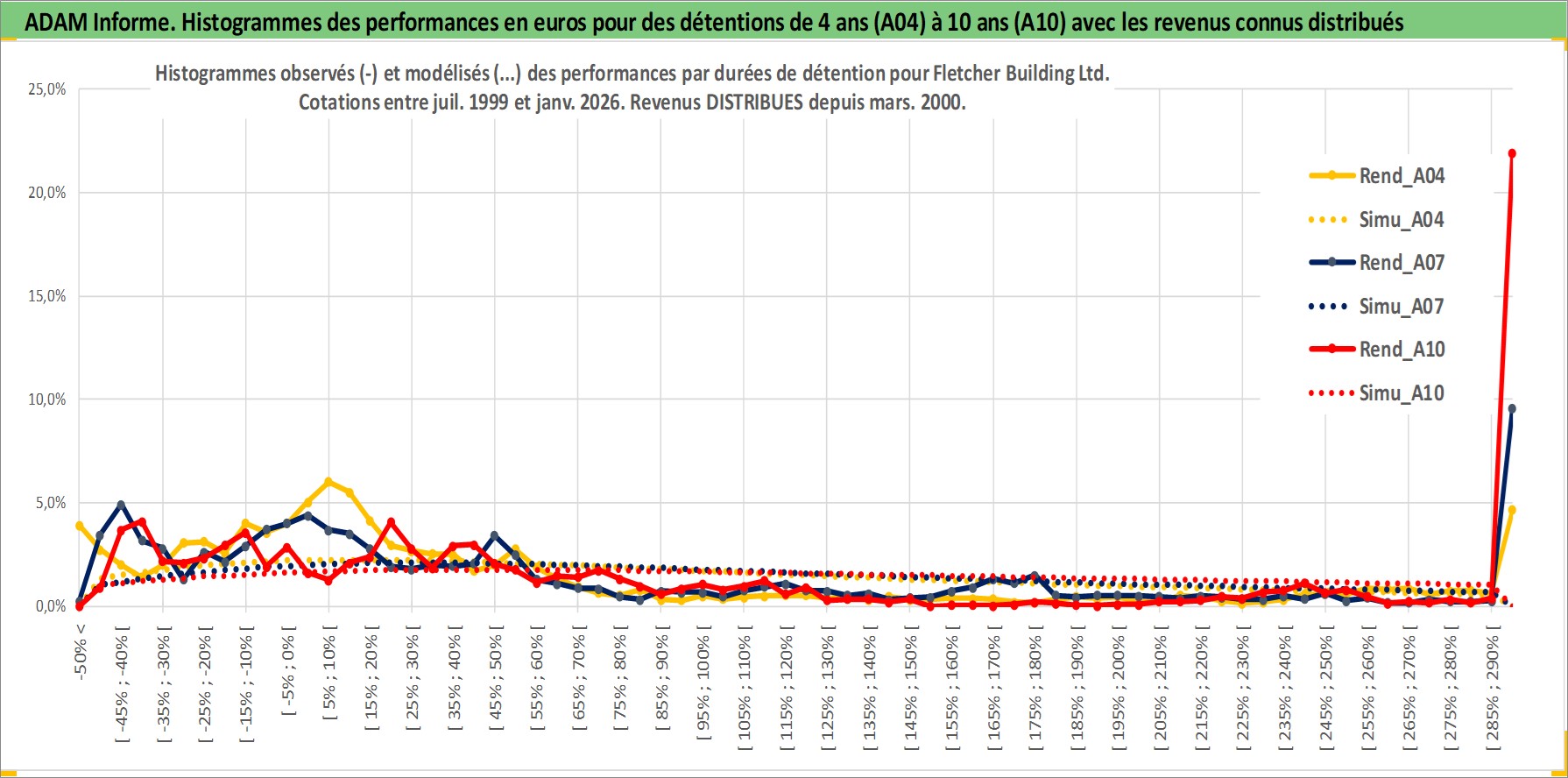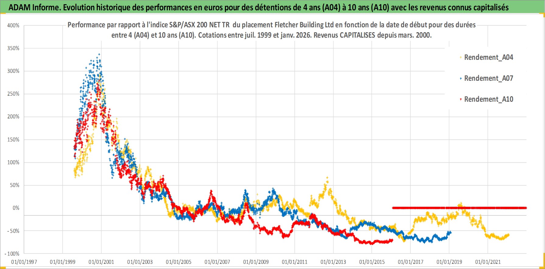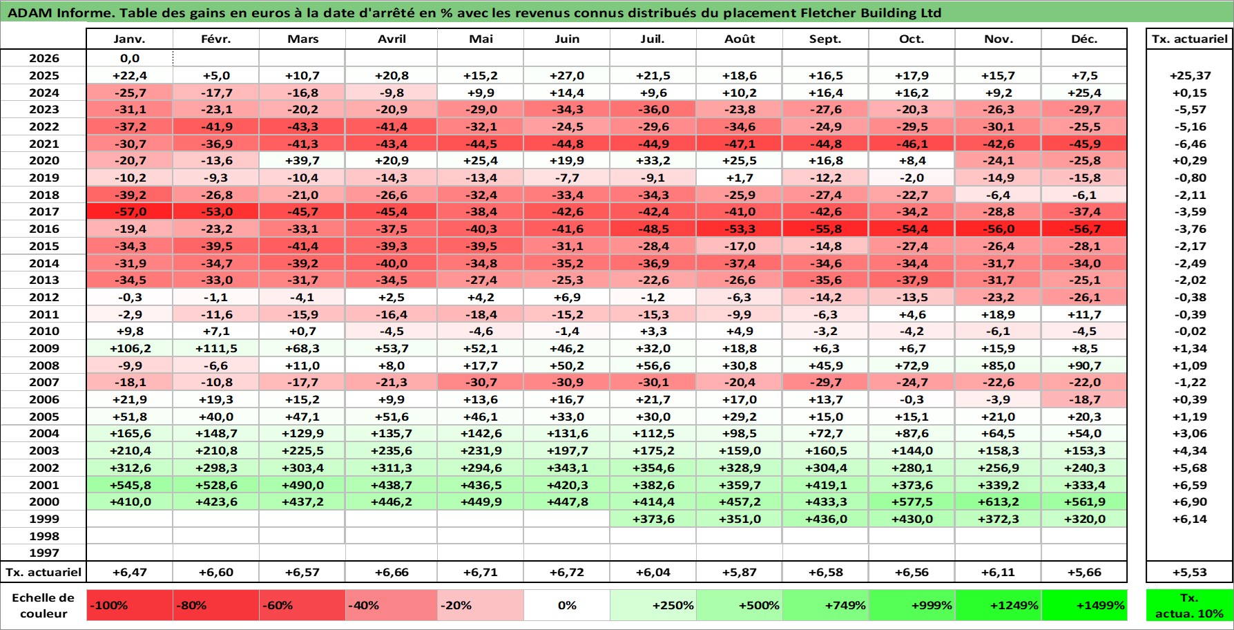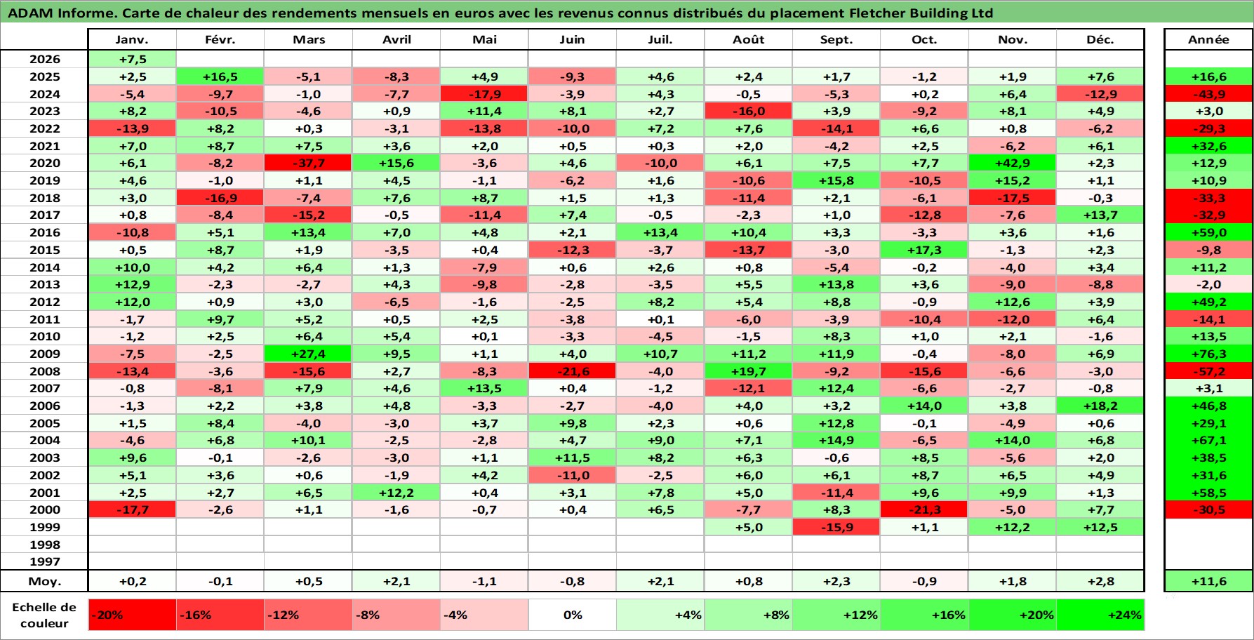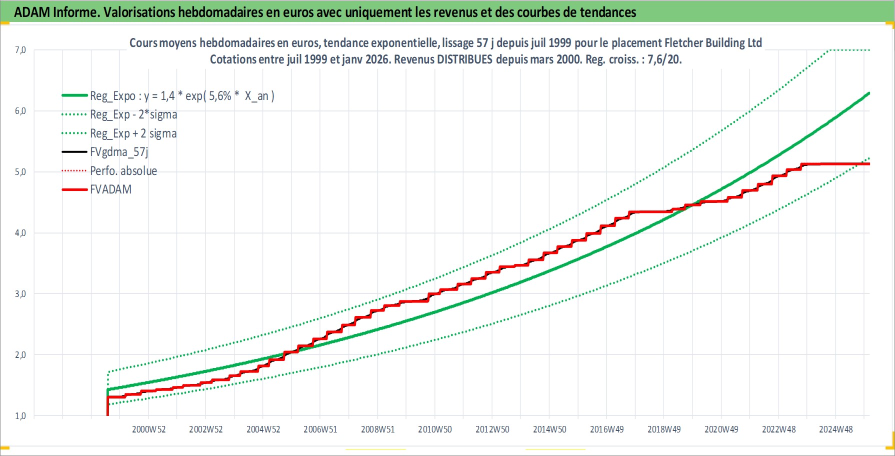 Site dédié aux investisseursPage dédiée sur site financeAnalyse des valorisations hebdomadaires de l'action Fletcher Building Ltd. Cet actif est cote en AUD. Les valorisations sont en contrevaleur EURO et couvrent les semaines 1999W30 a 2026W05. Les revenus de cet actif financier sont pris en compte depuis la semaine 2000W10. La note ESG de cet actif n'est pas connue.