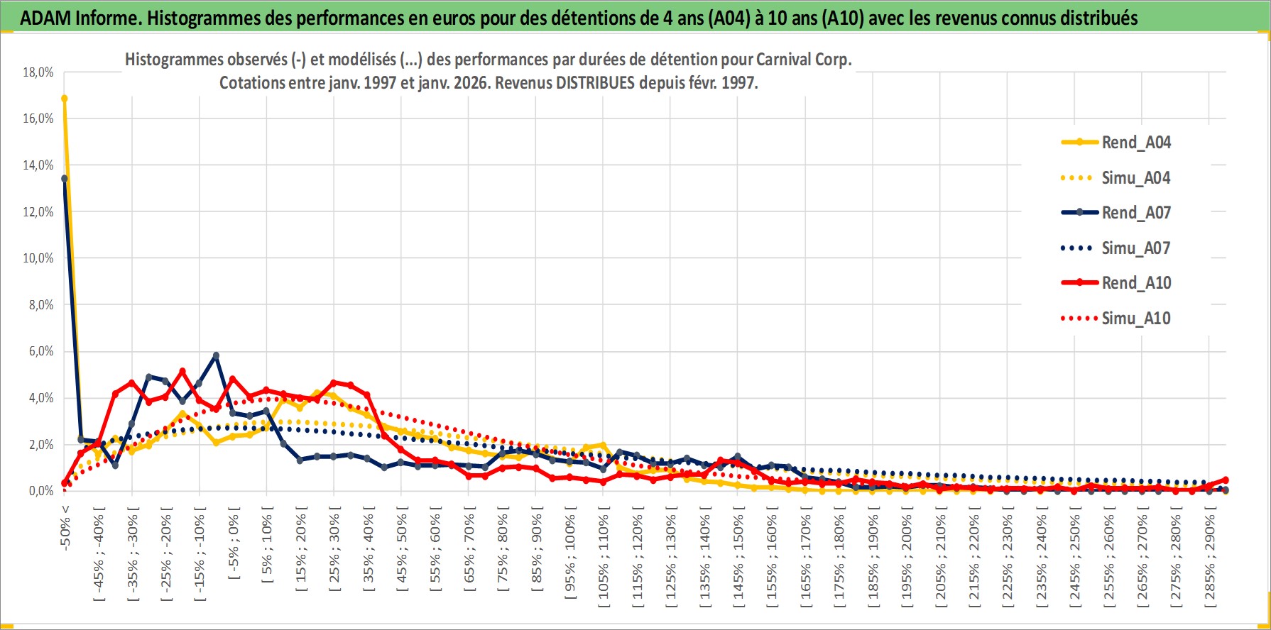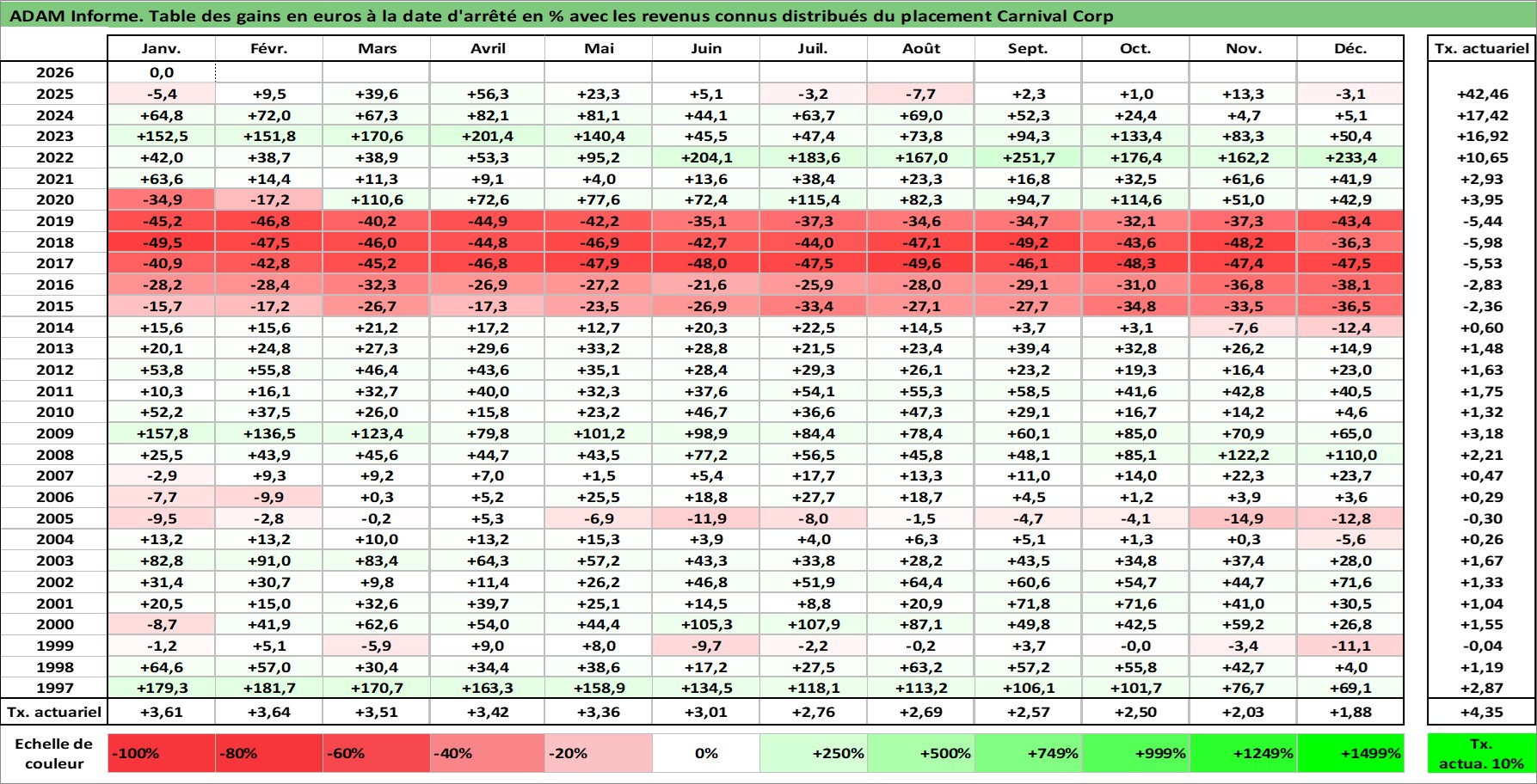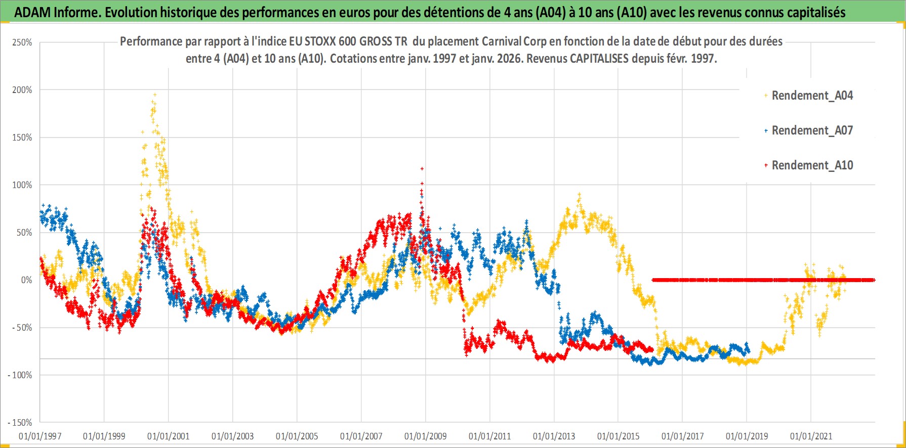 Site dédié aux investisseursPage dédiée sur site financeAnalyse des valorisations hebdomadaires de l'action Carnival Corp. Cet actif est cote en USD. Les valorisations sont en contrevaleur EURO et couvrent les semaines 1997W01 a 2026W05. Les revenus de cet actif financier sont pris en compte depuis la semaine 1997W09. La note globale ESG de cet actif est estimee a 8.0 (apres rebasage entre 0 et 20).
