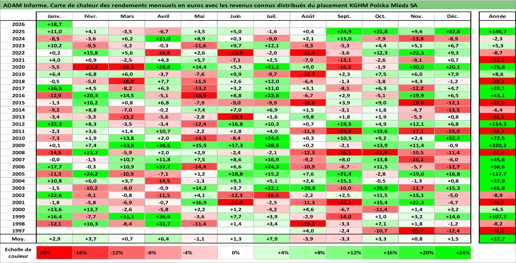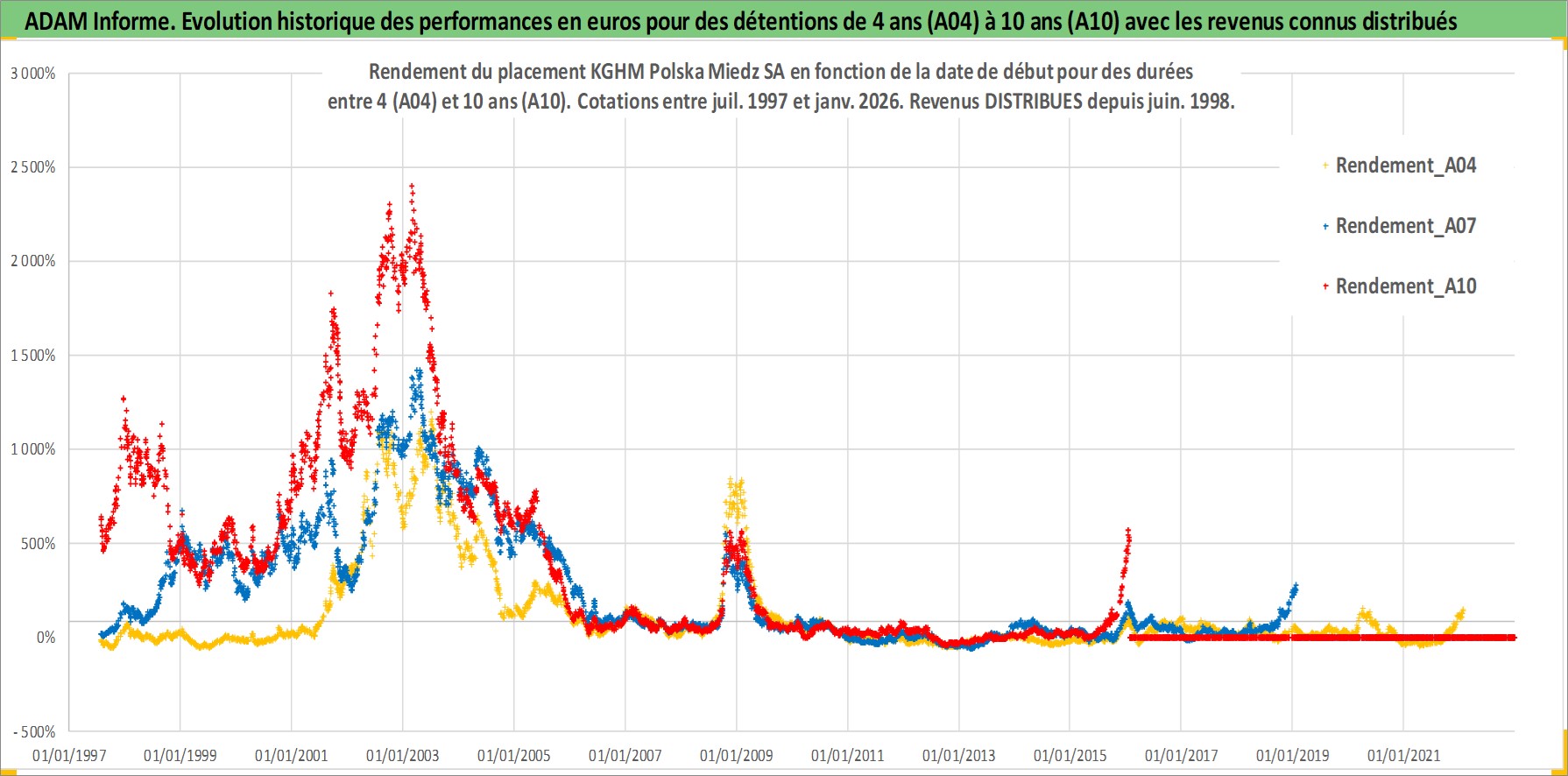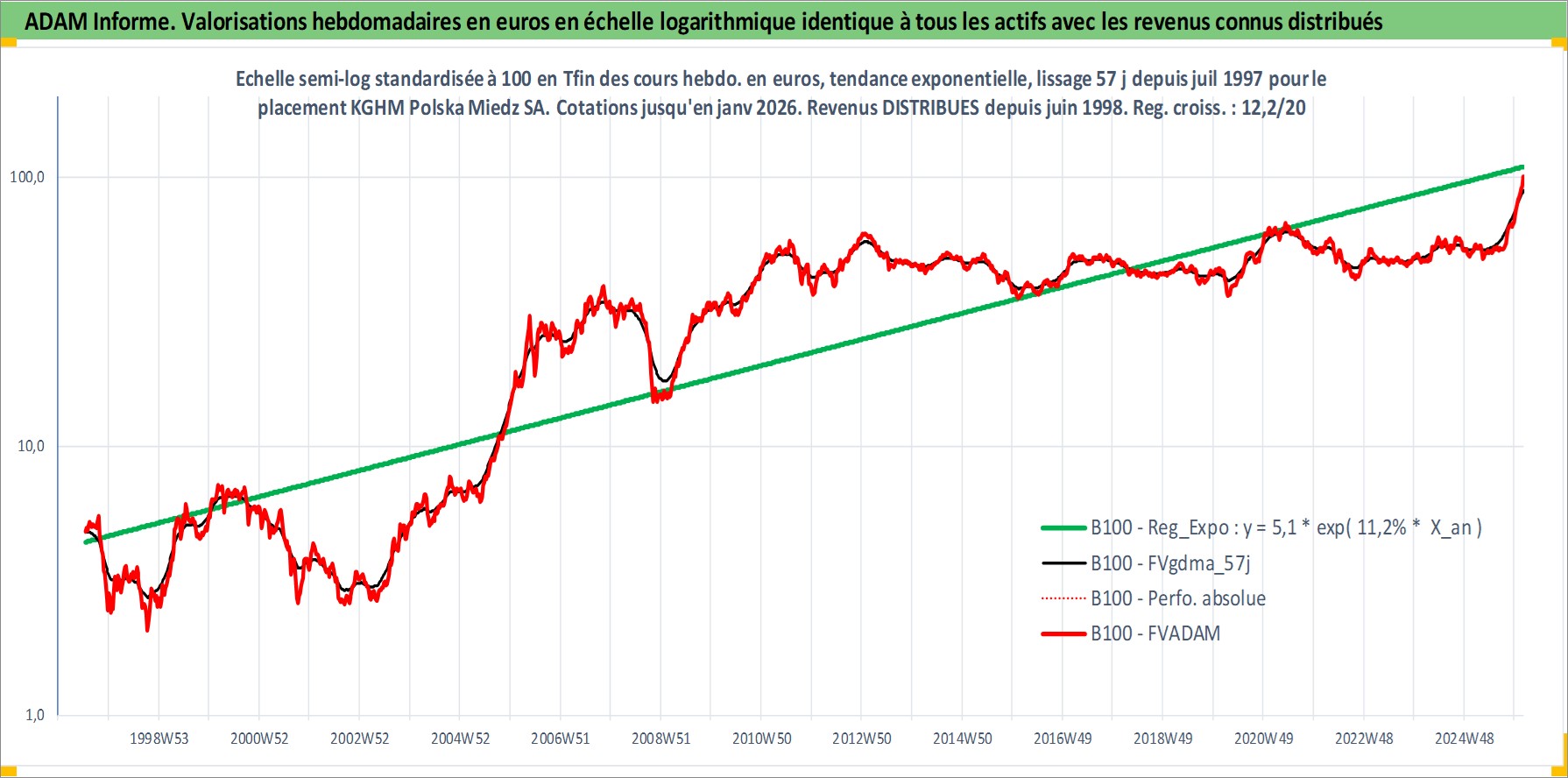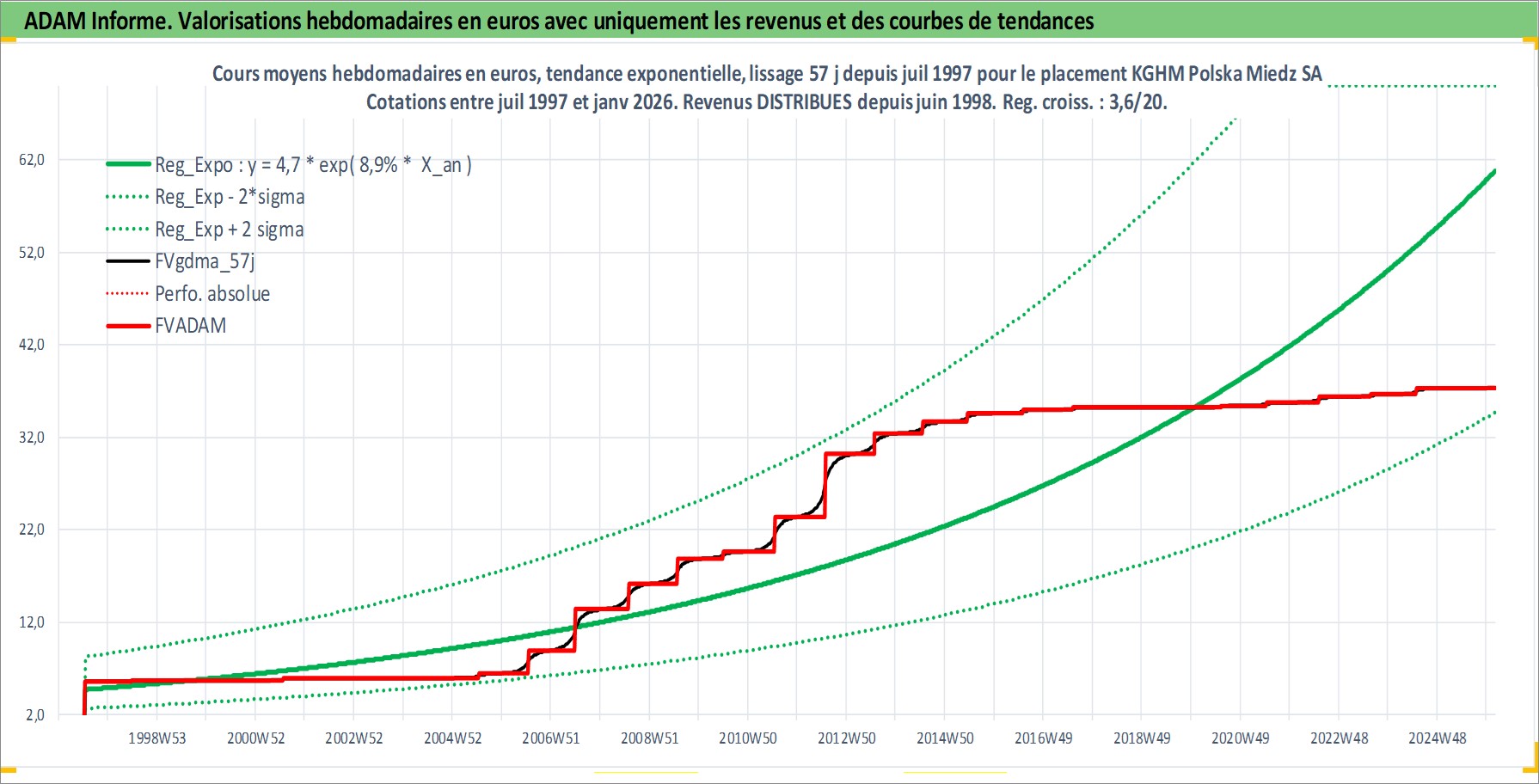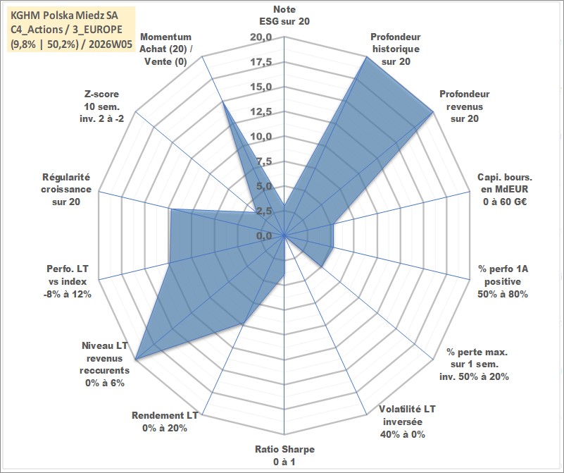 Site dédié aux investisseursPage dédiée sur site financeAnalyse des valorisations hebdomadaires de l'action KGHM Polska Miedz SA. Cet actif est cote en PLN. Les valorisations sont en contrevaleur EURO et couvrent les semaines 1997W29 a 2026W05. Les revenus de cet actif financier sont pris en compte depuis la semaine 1998W26. La note globale ESG de cet actif est estimee a 3.0 (apres rebasage entre 0 et 20).