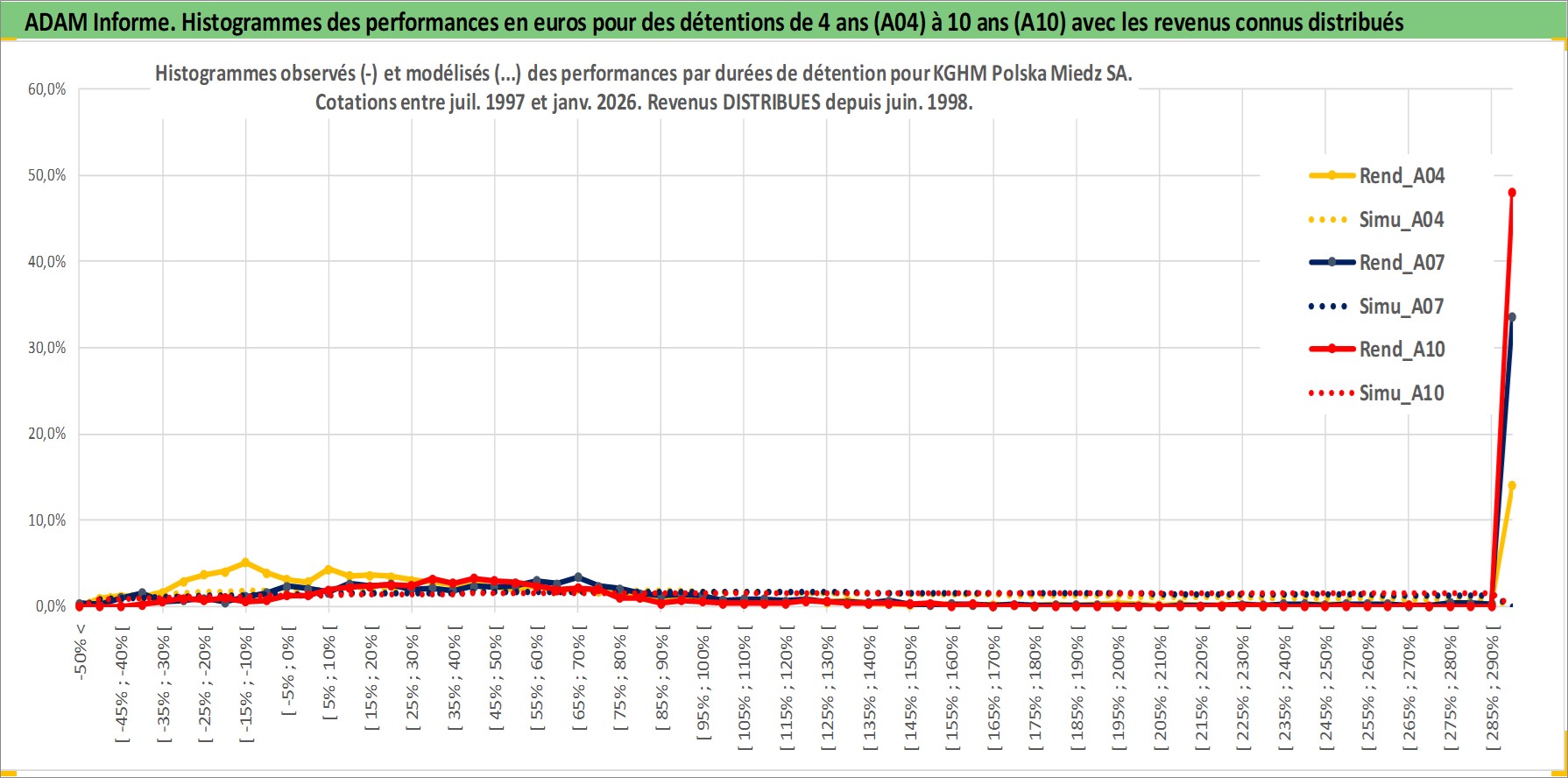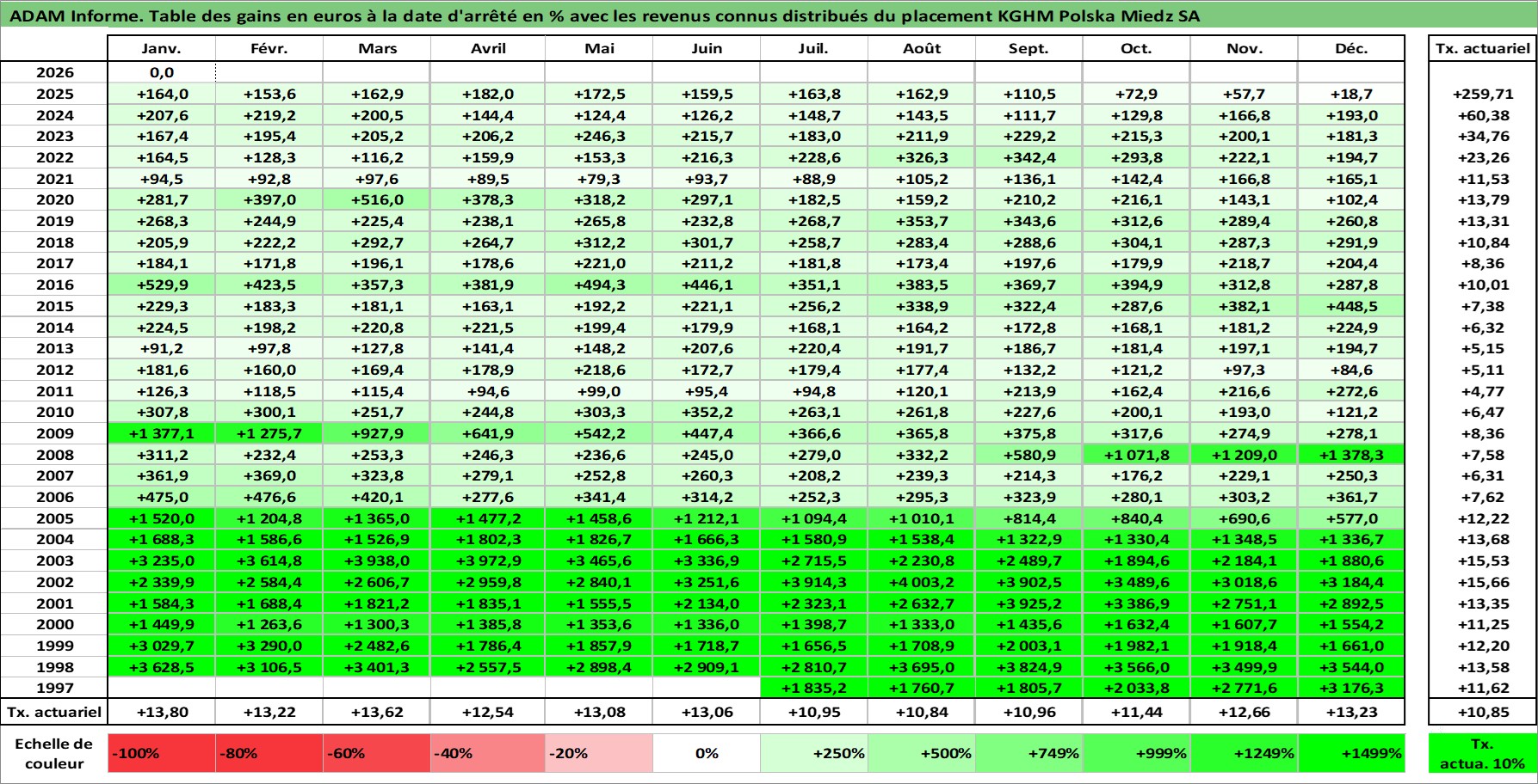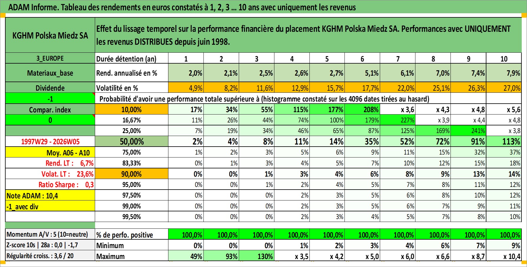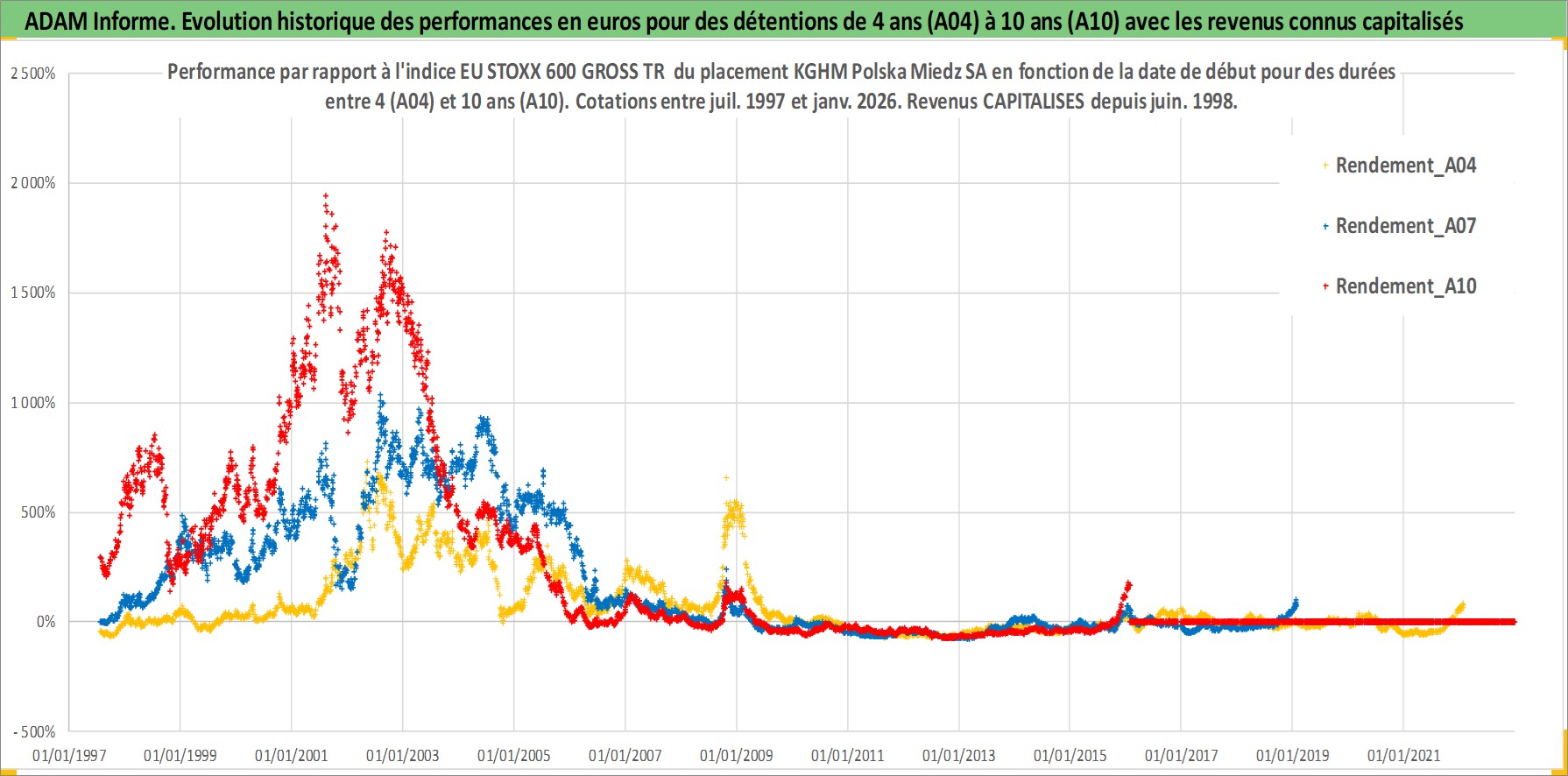 Site dédié aux investisseursPage dédiée sur site financeAnalyse des valorisations hebdomadaires de l'action KGHM Polska Miedz SA. Cet actif est cote en PLN. Les valorisations sont en contrevaleur EURO et couvrent les semaines 1997W29 a 2026W05. Les revenus de cet actif financier sont pris en compte depuis la semaine 1998W26. La note globale ESG de cet actif est estimee a 3.0 (apres rebasage entre 0 et 20).