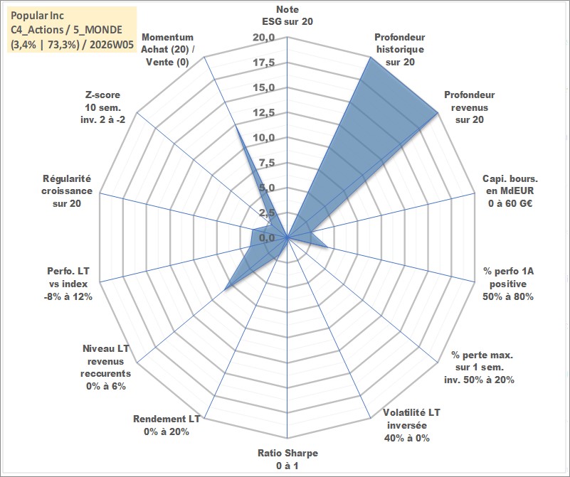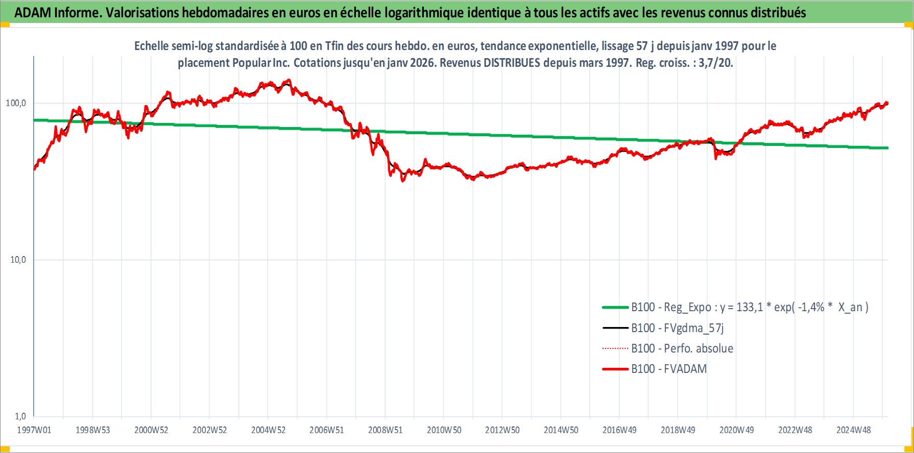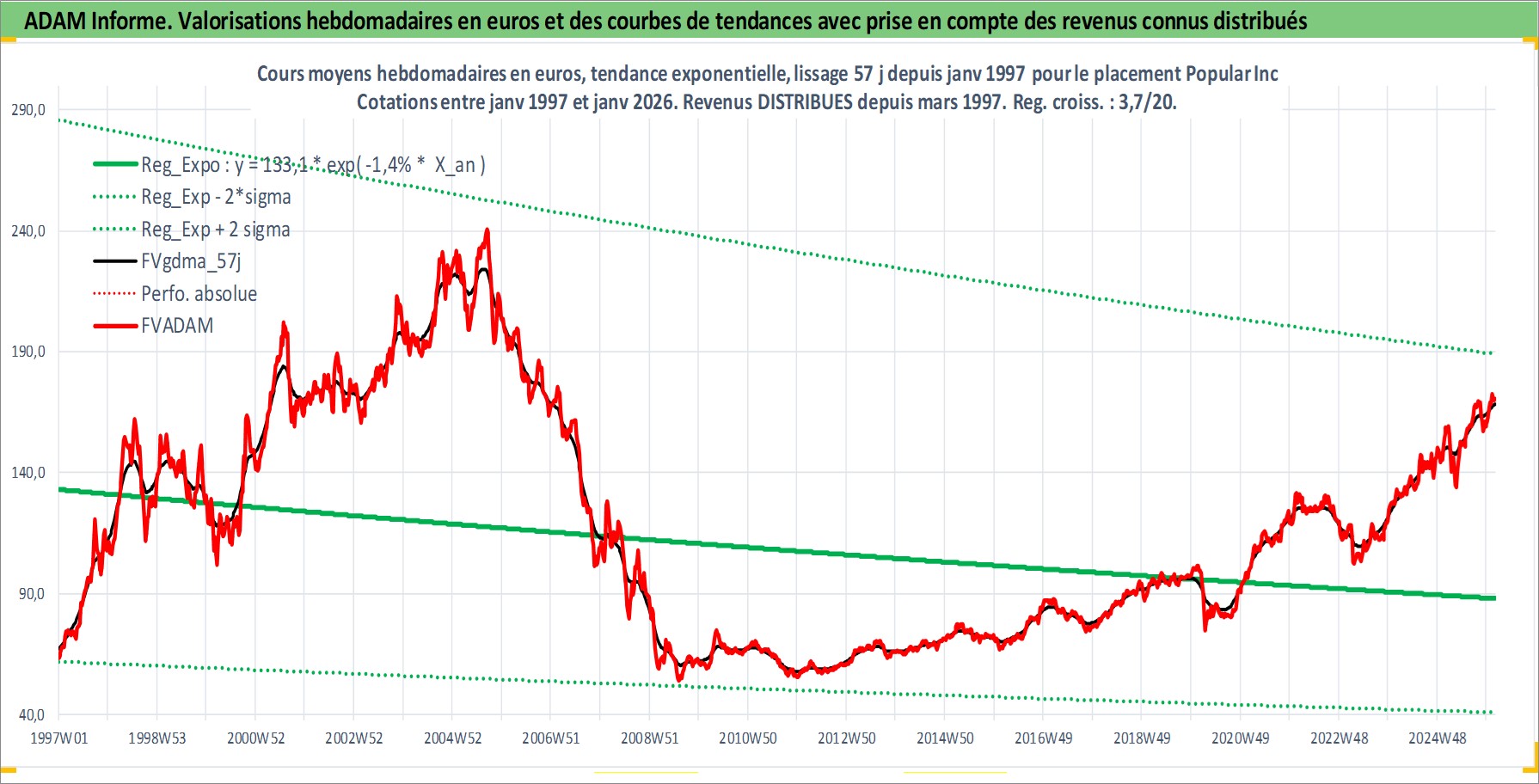 Site dédié aux investisseursPage dédiée sur site financeAnalyse des valorisations hebdomadaires de l'action Popular Inc. Cet actif est cote en USD. Les valorisations sont en contrevaleur EURO et couvrent les semaines 1997W01 a 2026W05. Les revenus de cet actif financier sont pris en compte depuis la semaine 1997W11. La note ESG de cet actif n'est pas connue.