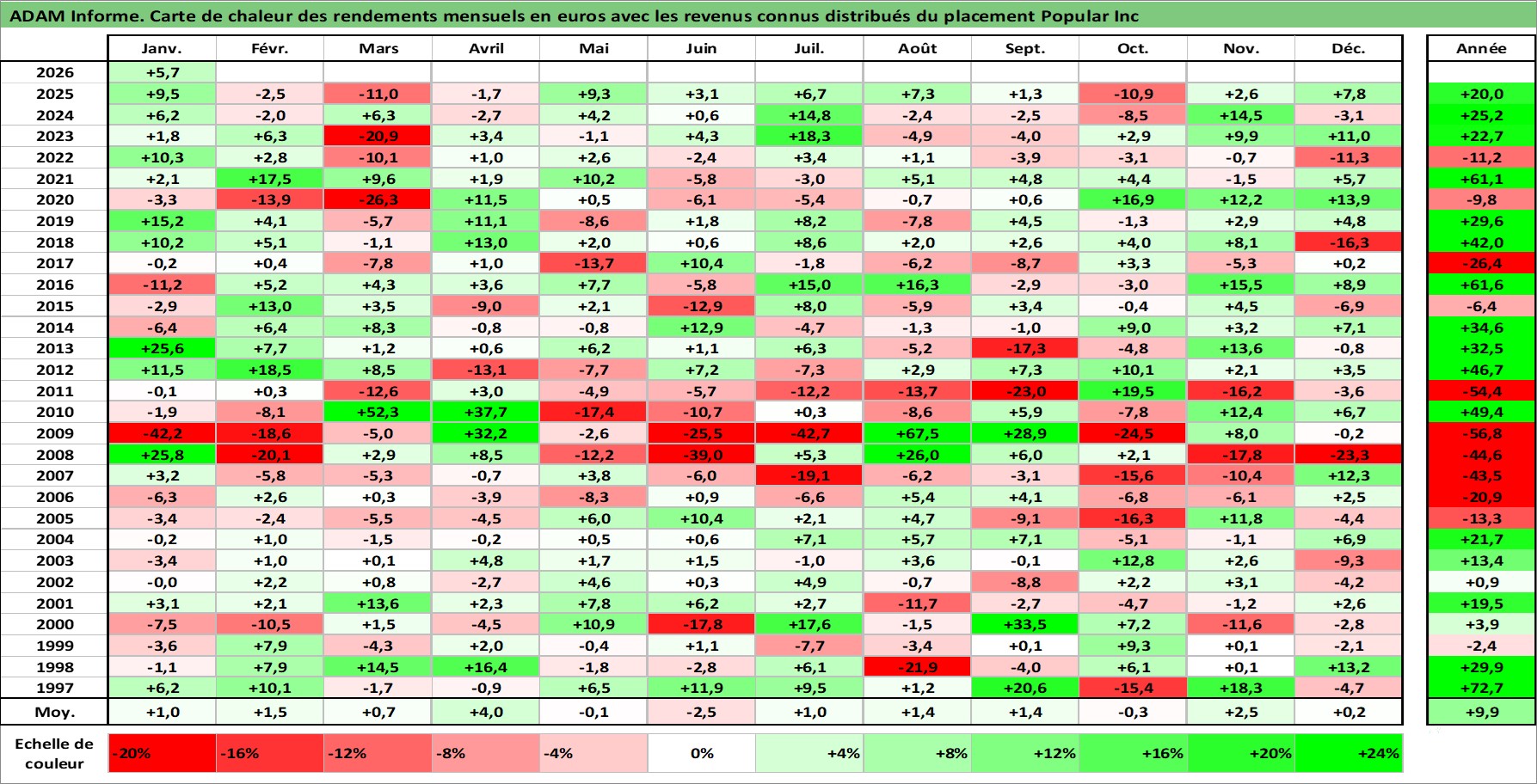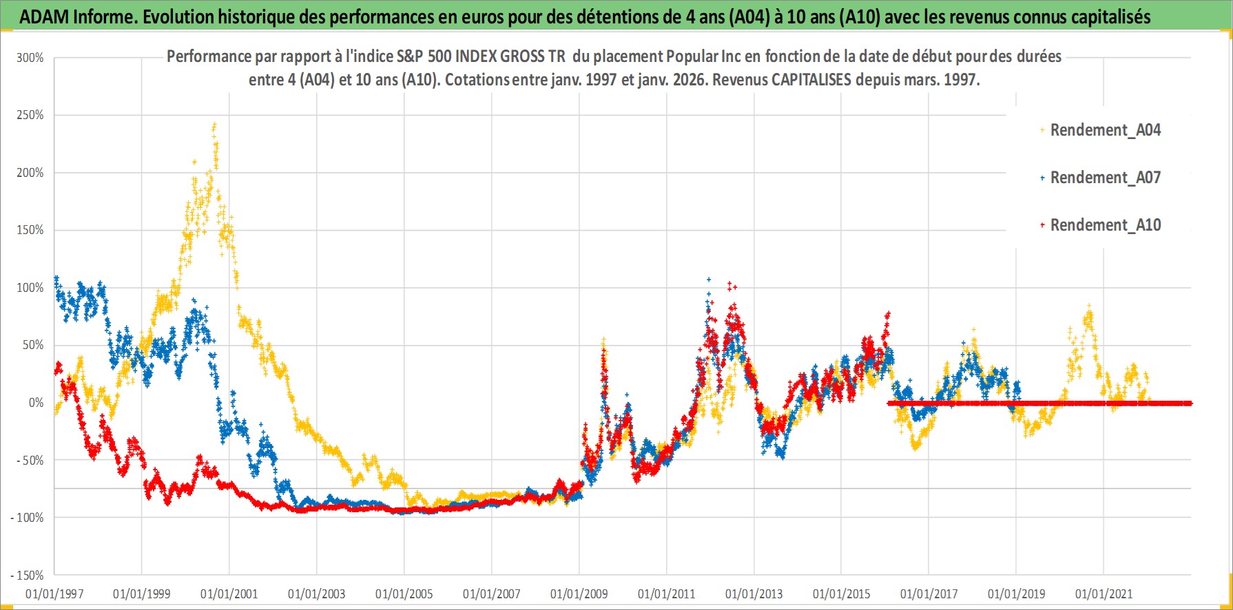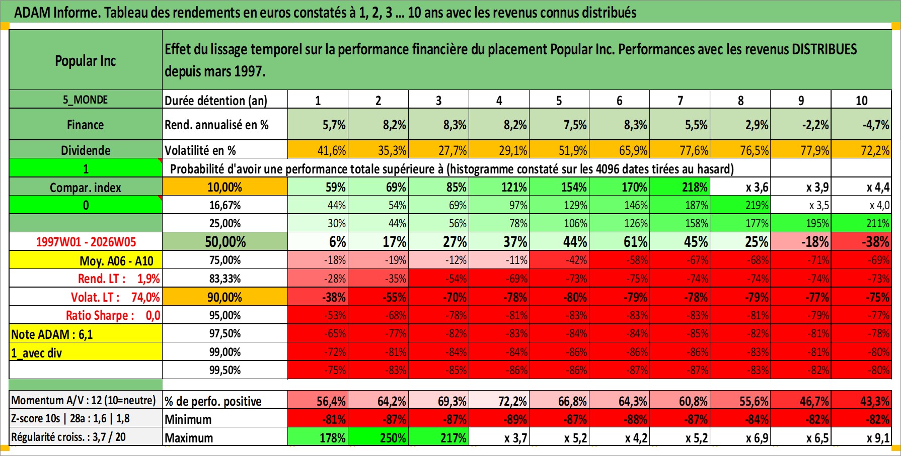 Site dédié aux investisseursPage dédiée sur site financeAnalyse des valorisations hebdomadaires de l'action Popular Inc. Cet actif est cote en USD. Les valorisations sont en contrevaleur EURO et couvrent les semaines 1997W01 a 2026W05. Les revenus de cet actif financier sont pris en compte depuis la semaine 1997W11. La note ESG de cet actif n'est pas connue.