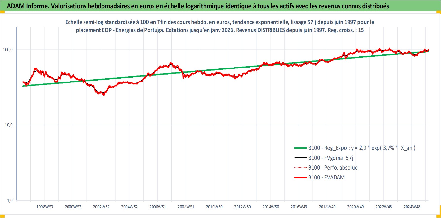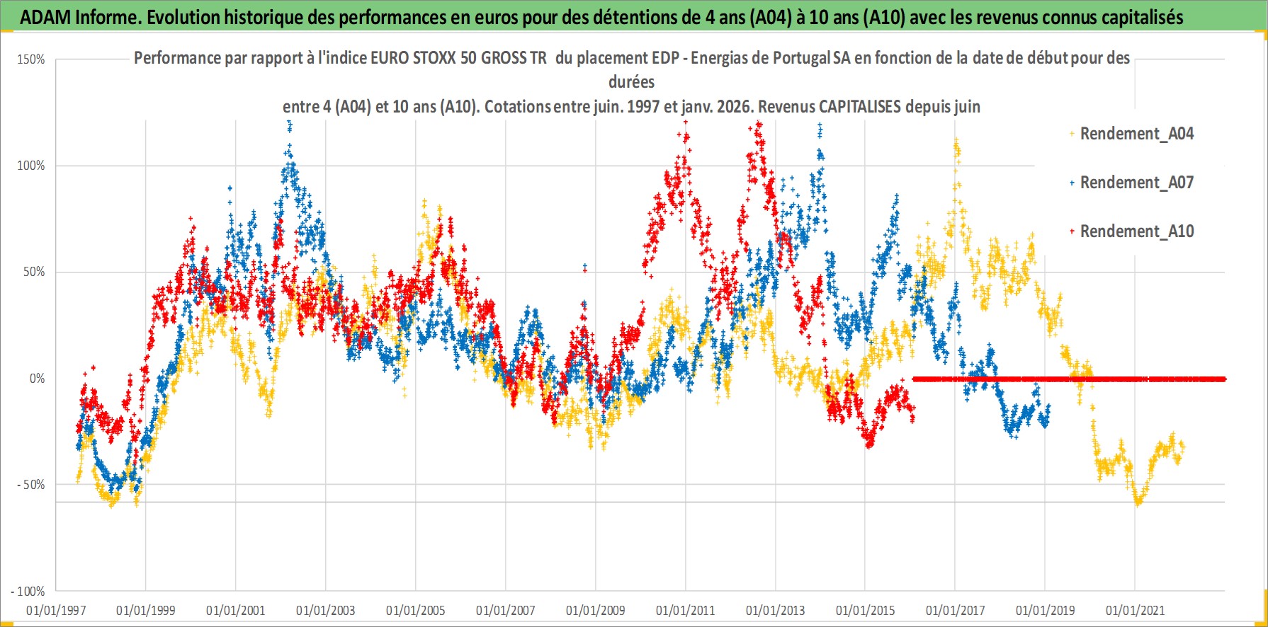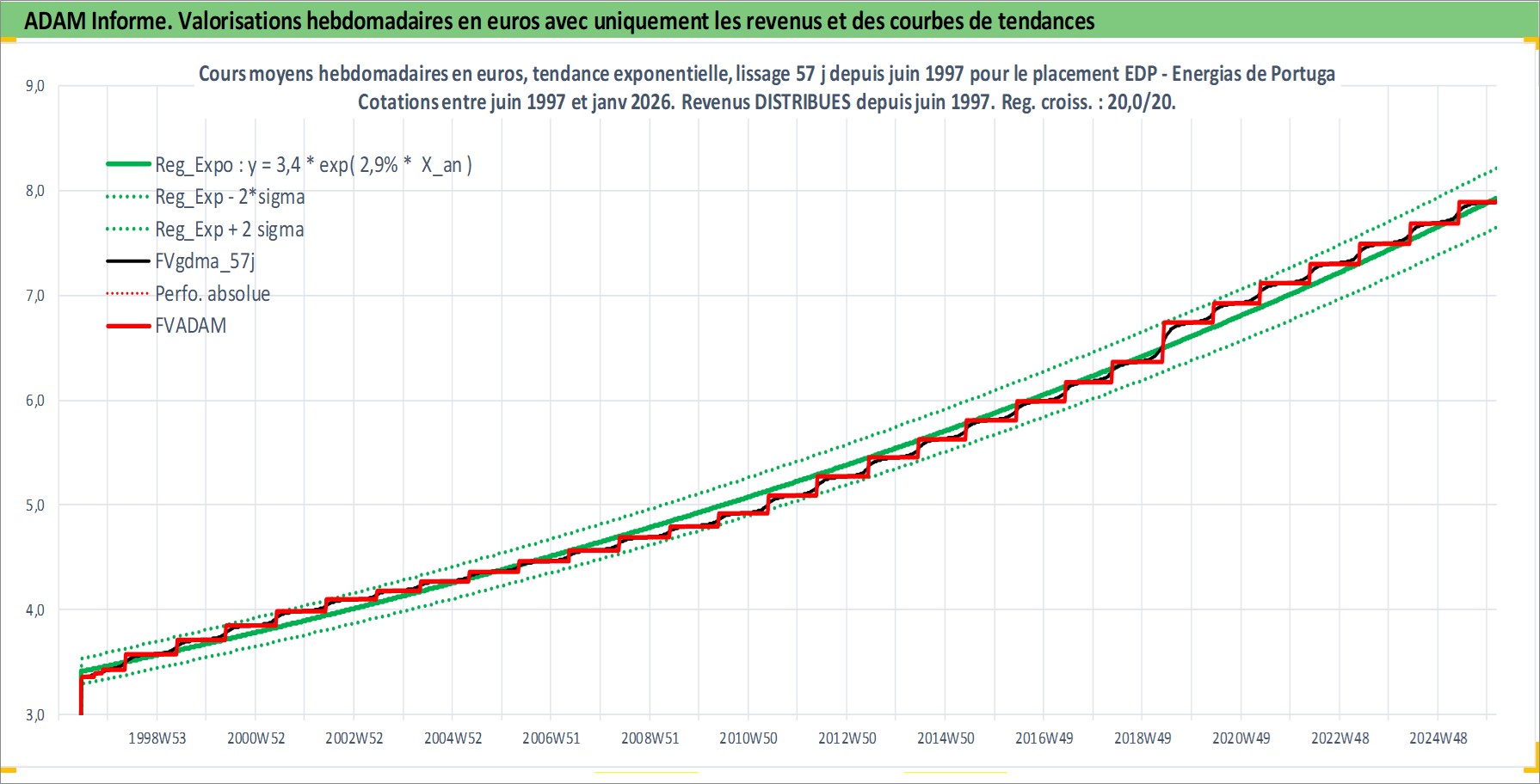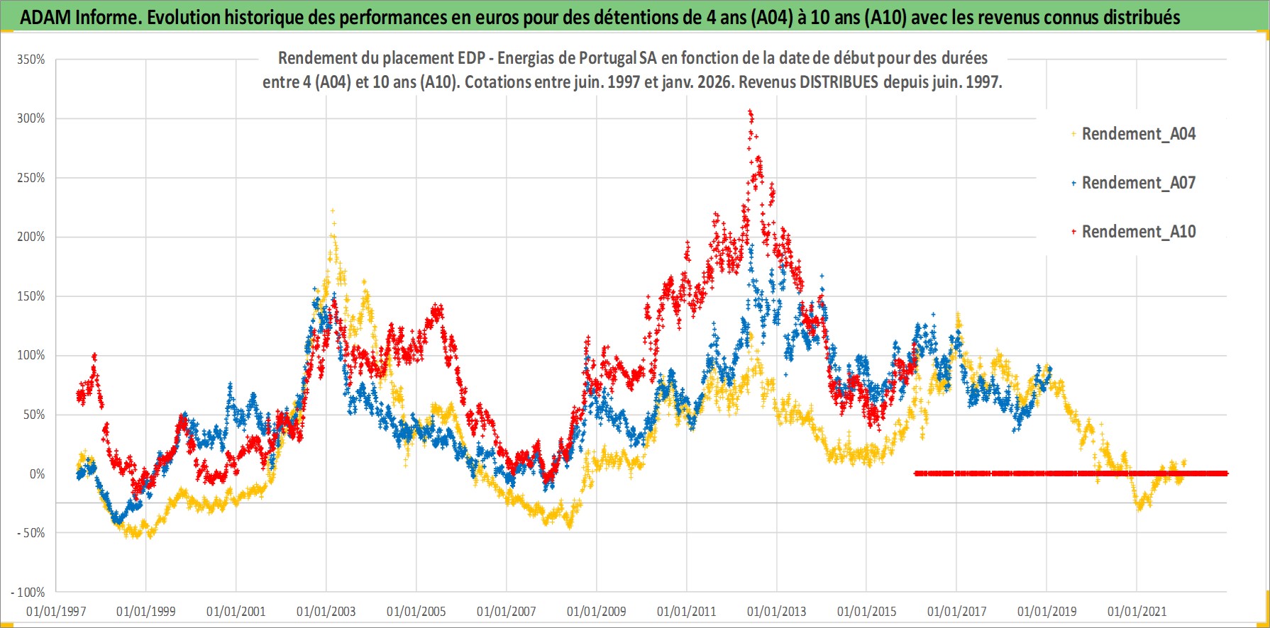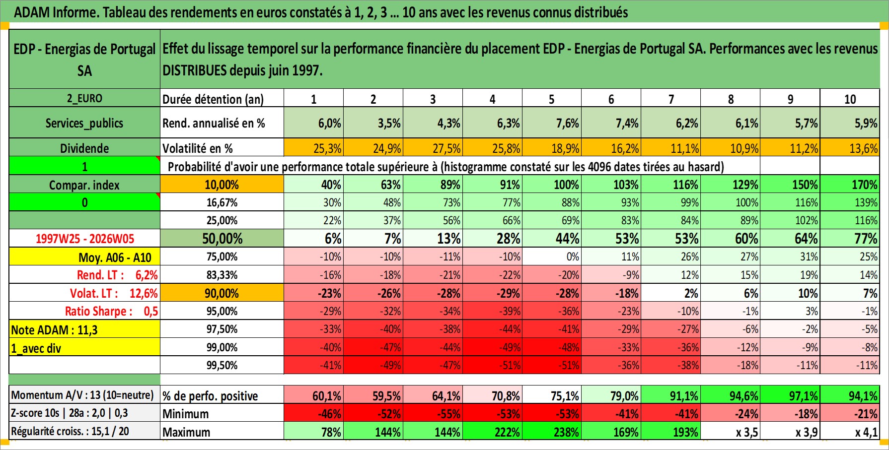 Site dédié aux investisseursPage dédiée sur site financeAnalyse des valorisations hebdomadaires de l'action EDP - Energias de Portugal SA. Cet actif est cote en EUR. Les valorisations couvrent les semaines 1997W25 a 2026W05. Les revenus de cet actif financier sont pris en compte depuis la semaine 1997W26. La note globale ESG de cet actif est estimee a 10.0 (apres rebasage entre 0 et 20).