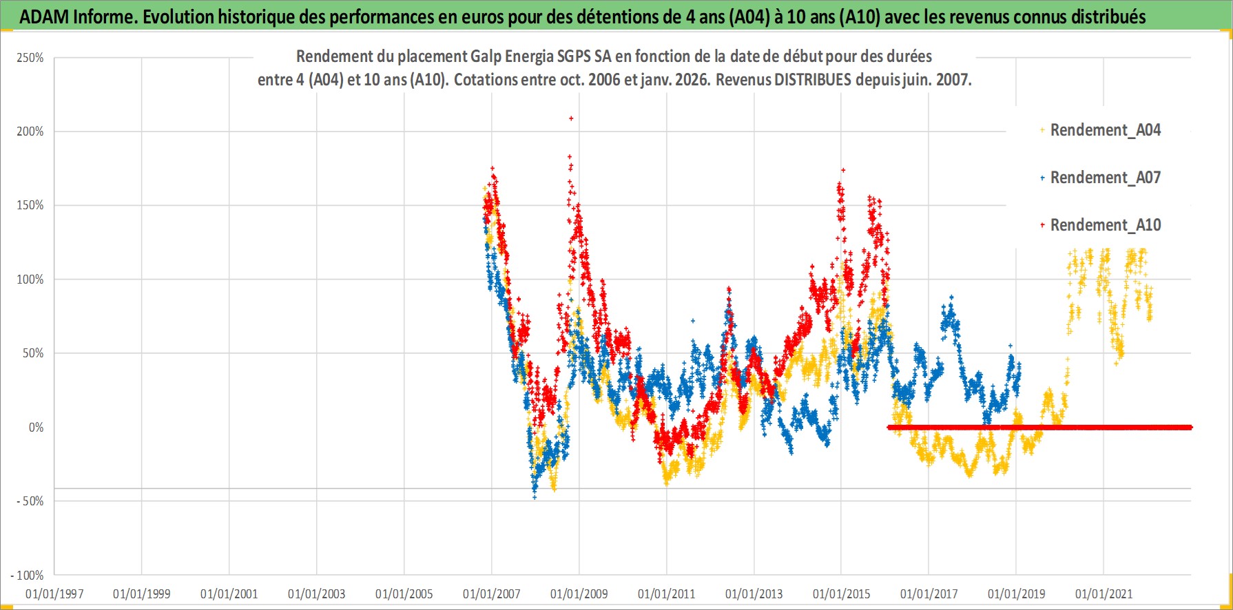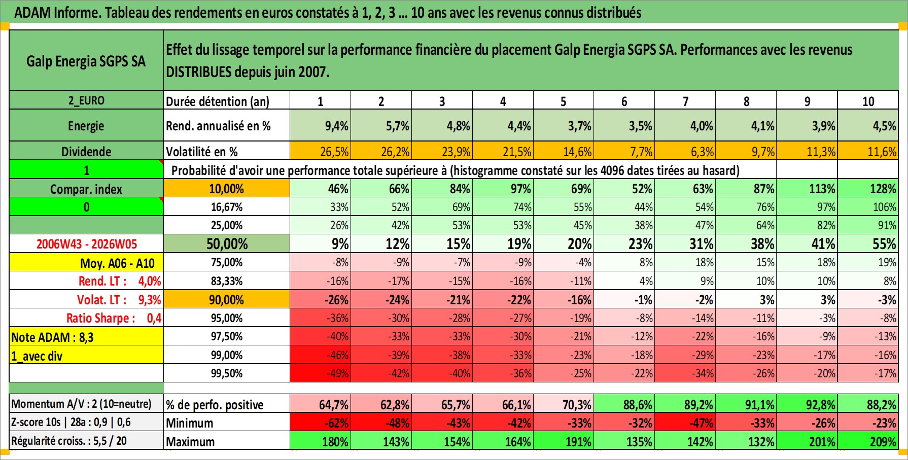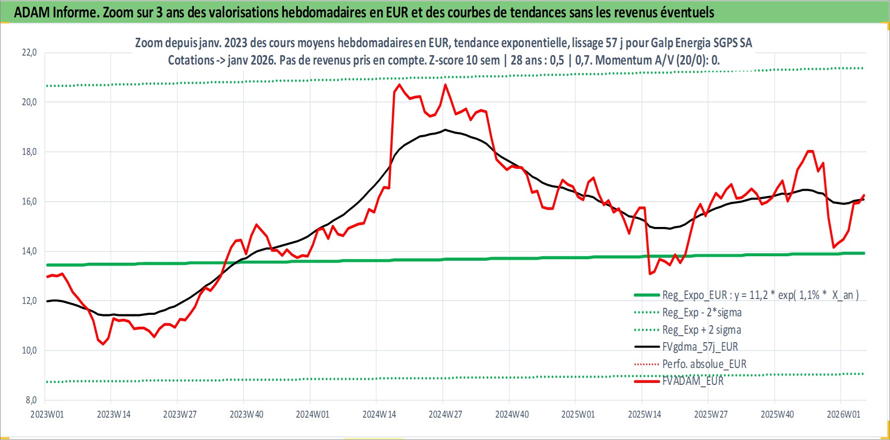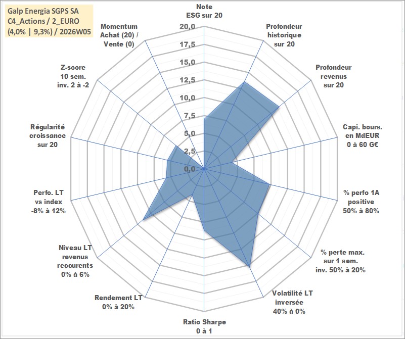 Site dédié aux investisseursPage dédiée sur site financeAnalyse des valorisations hebdomadaires de l'action Galp Energia SGPS SA. Cet actif est cote en EUR. Les valorisations couvrent les semaines 2006W43 a 2026W05. Les revenus de cet actif financier sont pris en compte depuis la semaine 2007W24. La note globale ESG de cet actif est estimee a 7.0 (apres rebasage entre 0 et 20).