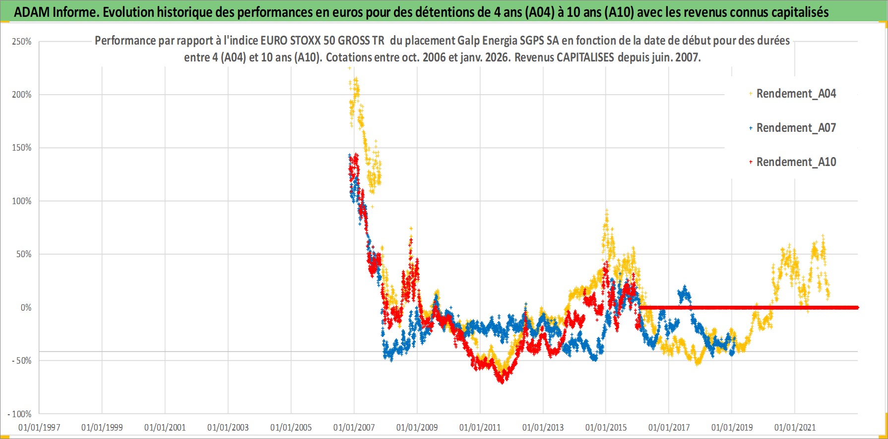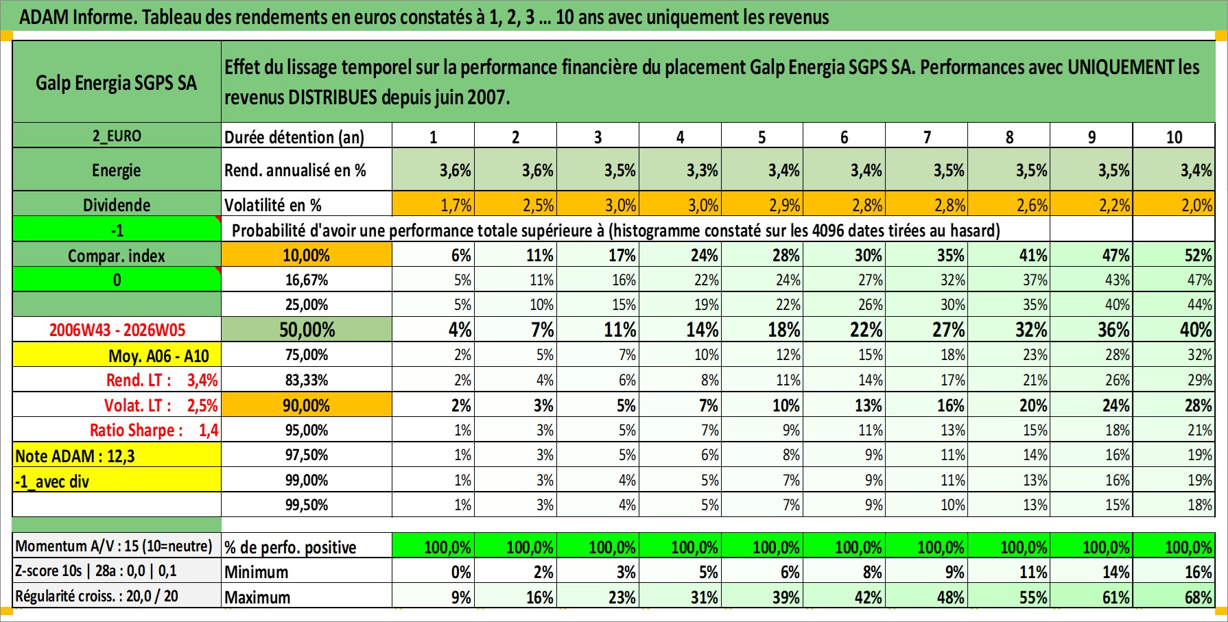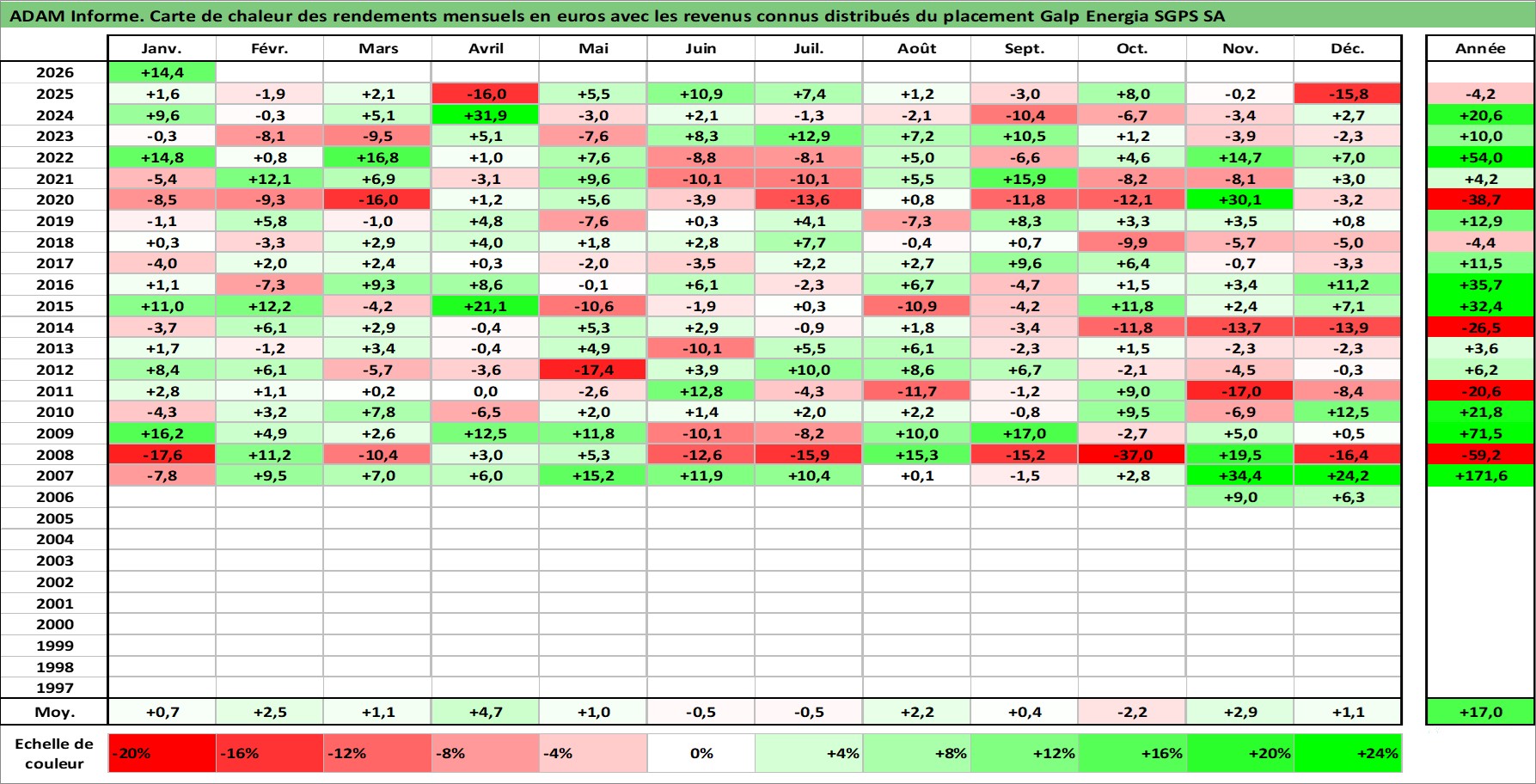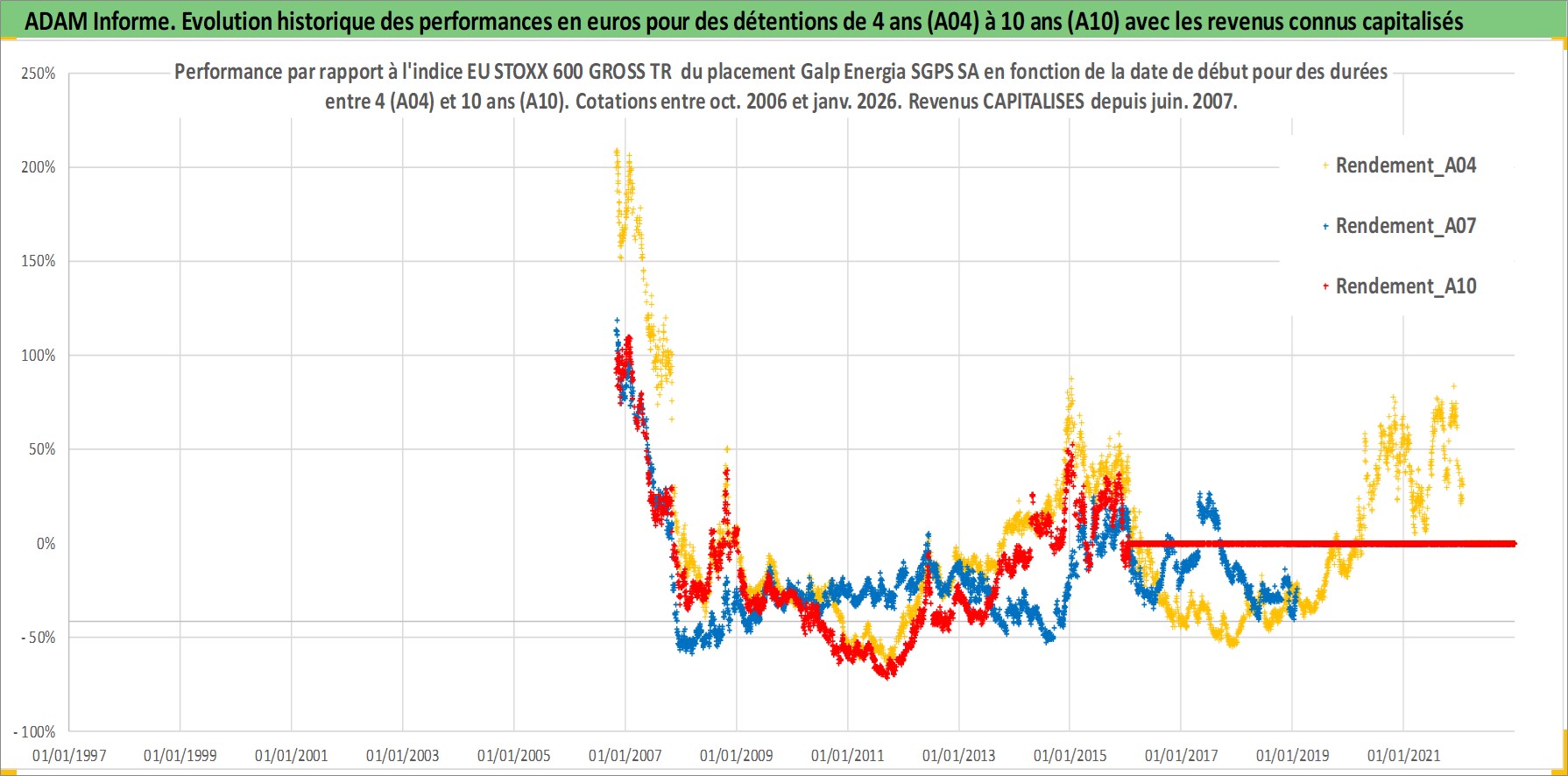 Site dédié aux investisseursPage dédiée sur site financeAnalyse des valorisations hebdomadaires de l'action Galp Energia SGPS SA. Cet actif est cote en EUR. Les valorisations couvrent les semaines 2006W43 a 2026W05. Les revenus de cet actif financier sont pris en compte depuis la semaine 2007W24. La note globale ESG de cet actif est estimee a 7.0 (apres rebasage entre 0 et 20).