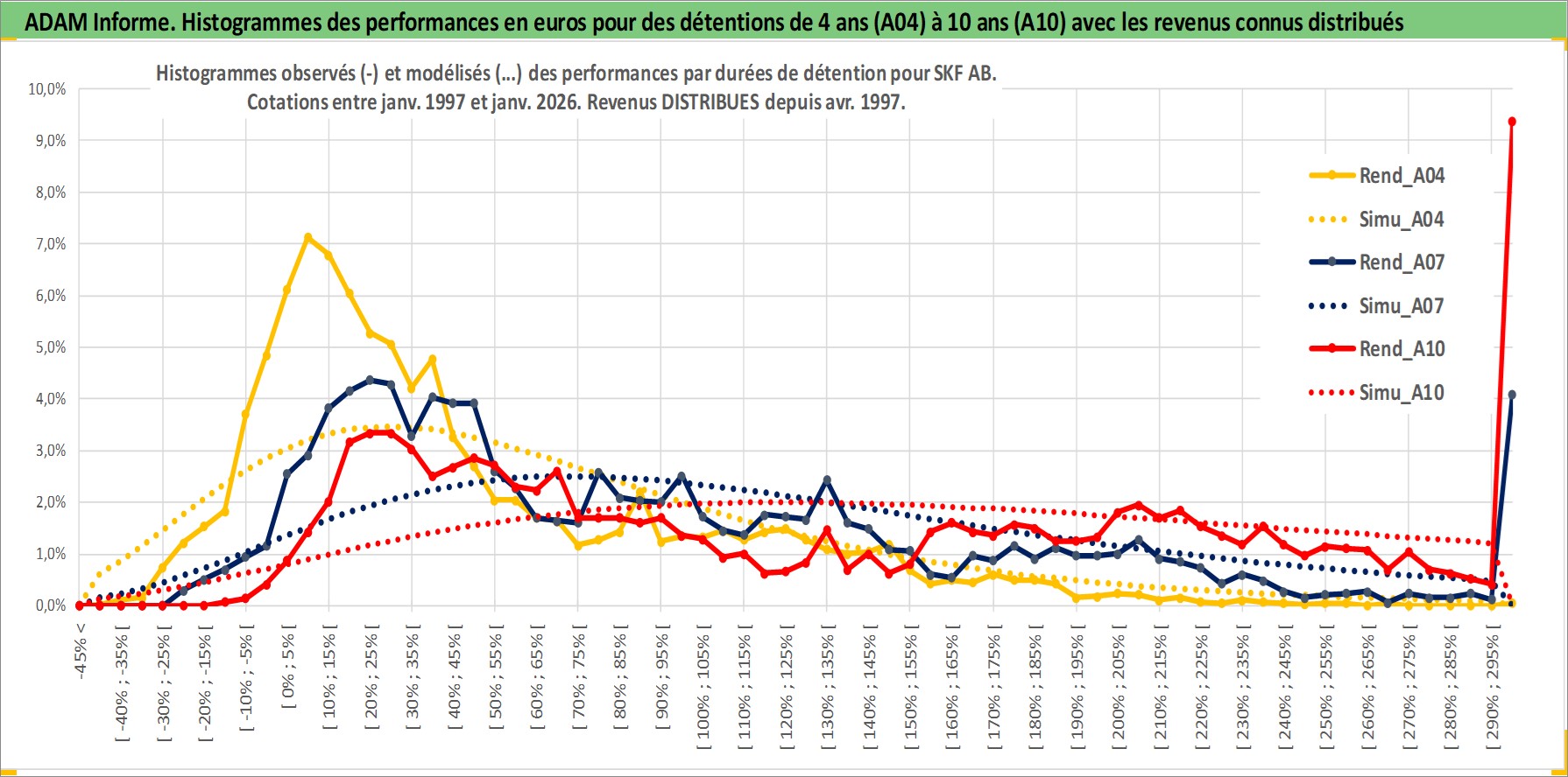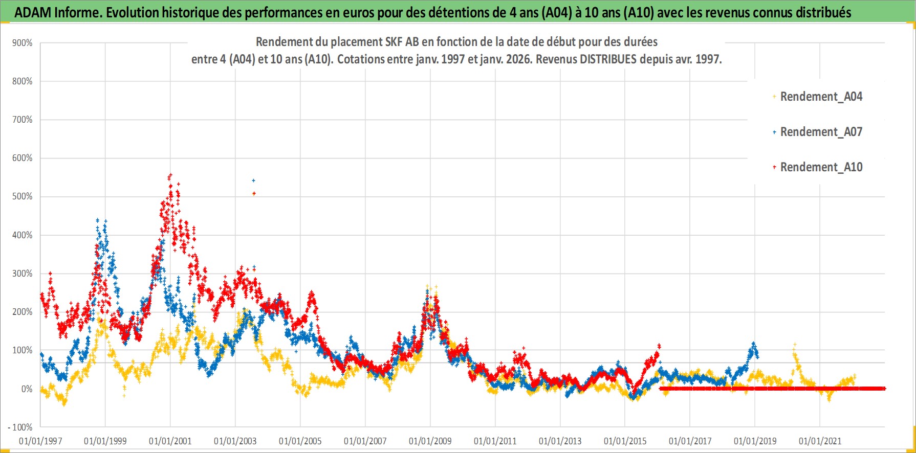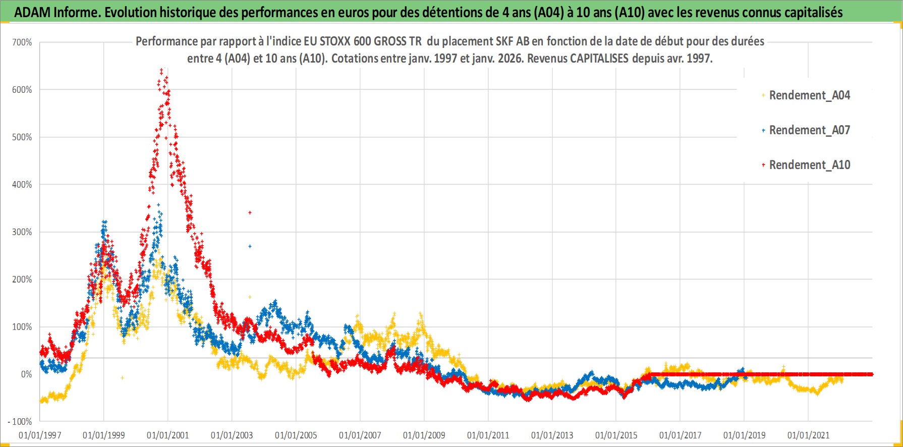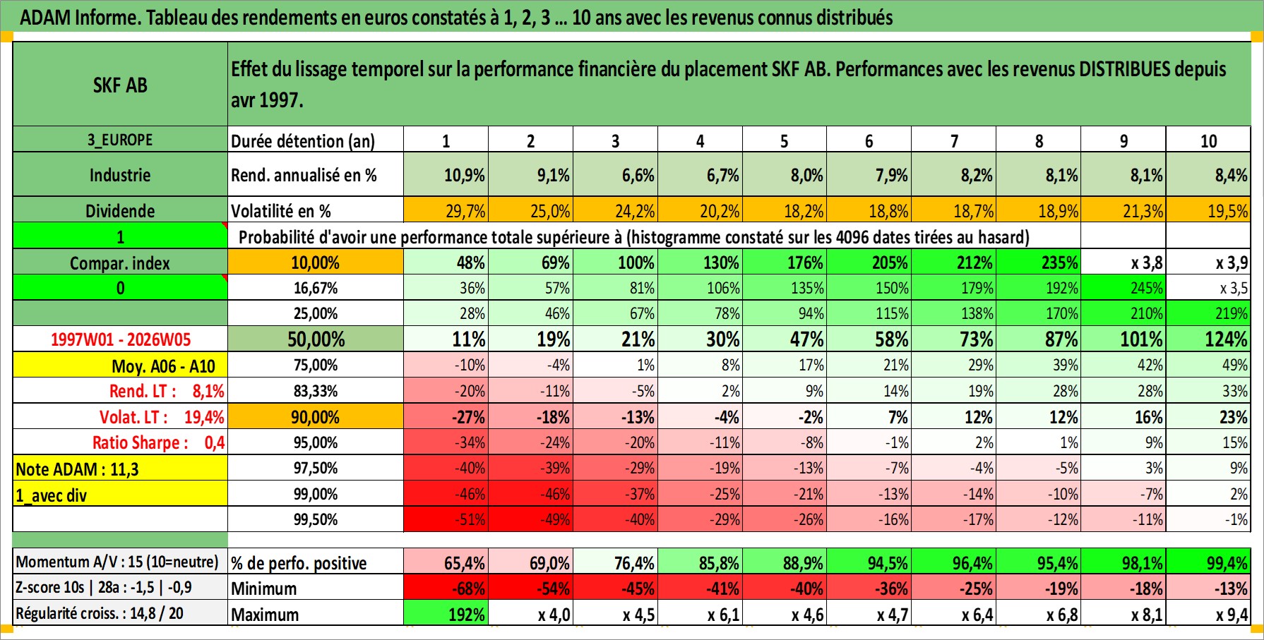 Site dédié aux investisseursPage dédiée sur site financeAnalyse des valorisations hebdomadaires de l'action SKF AB. Cet actif est cote en SEK. Les valorisations sont en contrevaleur EURO et couvrent les semaines 1997W01 a 2026W05. Les revenus de cet actif financier sont pris en compte depuis la semaine 1997W16. La note globale ESG de cet actif est estimee a 8.0 (apres rebasage entre 0 et 20).