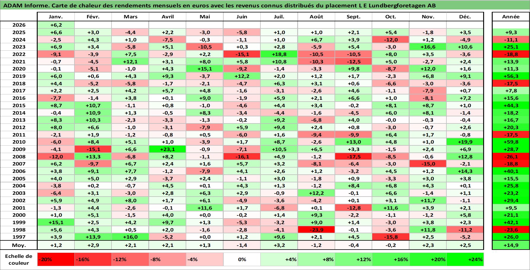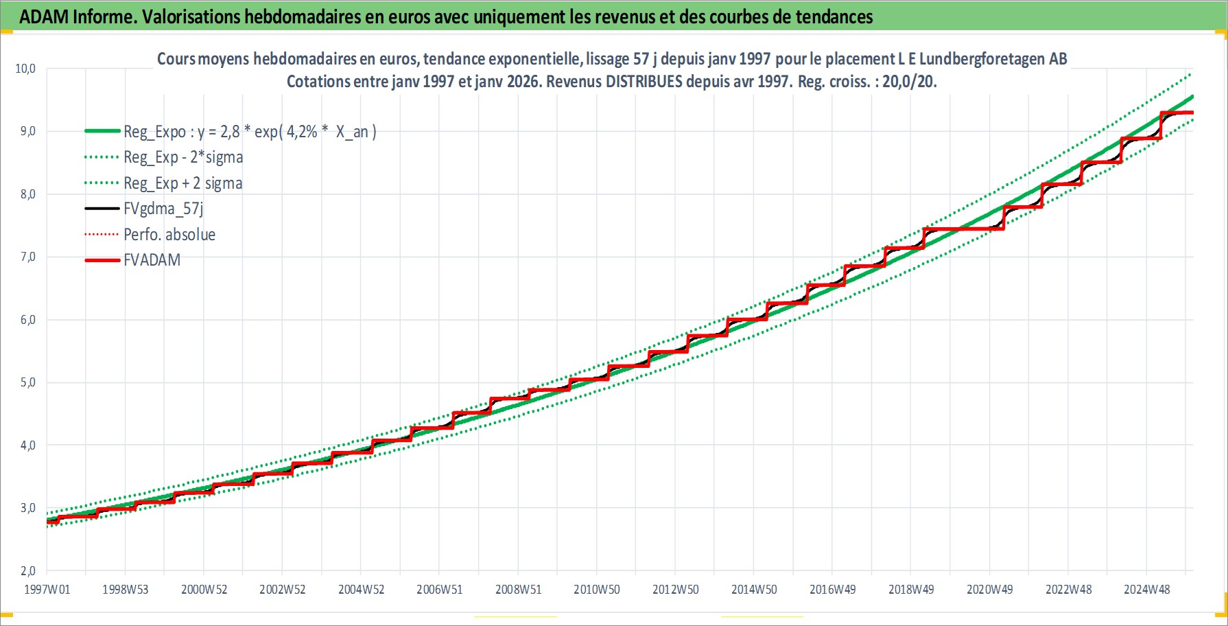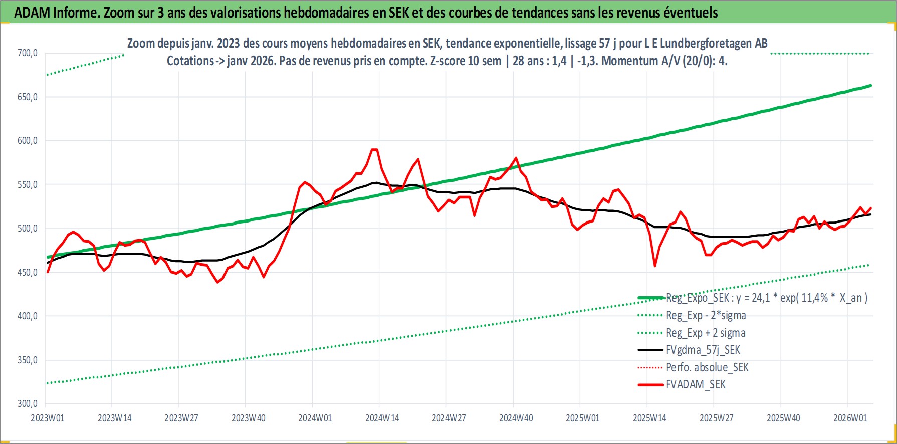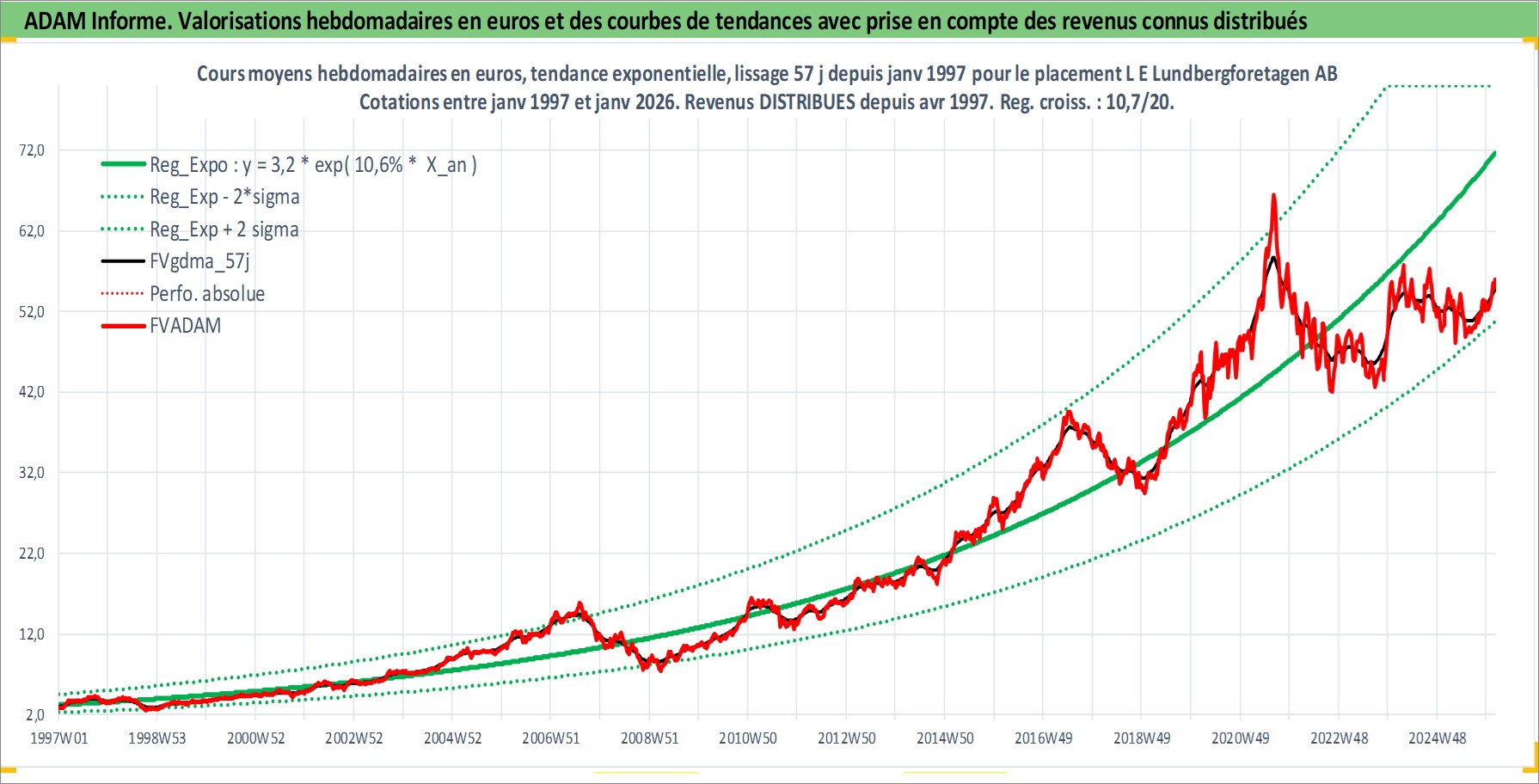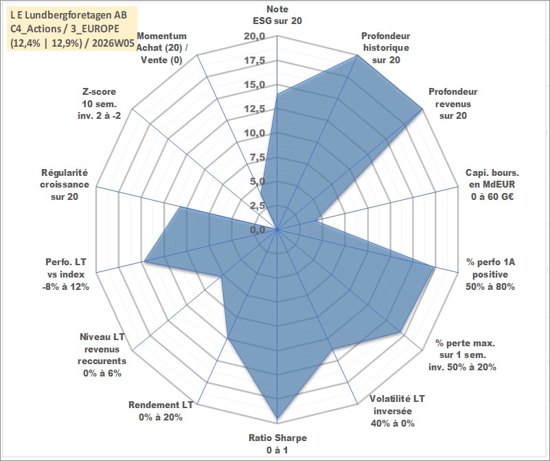 Site dédié aux investisseursPage dédiée sur site financeAnalyse des valorisations hebdomadaires de l'action L E Lundbergforetagen AB. Cet actif est cote en SEK. Les valorisations sont en contrevaleur EURO et couvrent les semaines 1997W01 a 2026W05. Les revenus de cet actif financier sont pris en compte depuis la semaine 1997W17. La note globale ESG de cet actif est estimee a 14.0 (apres rebasage entre 0 et 20).