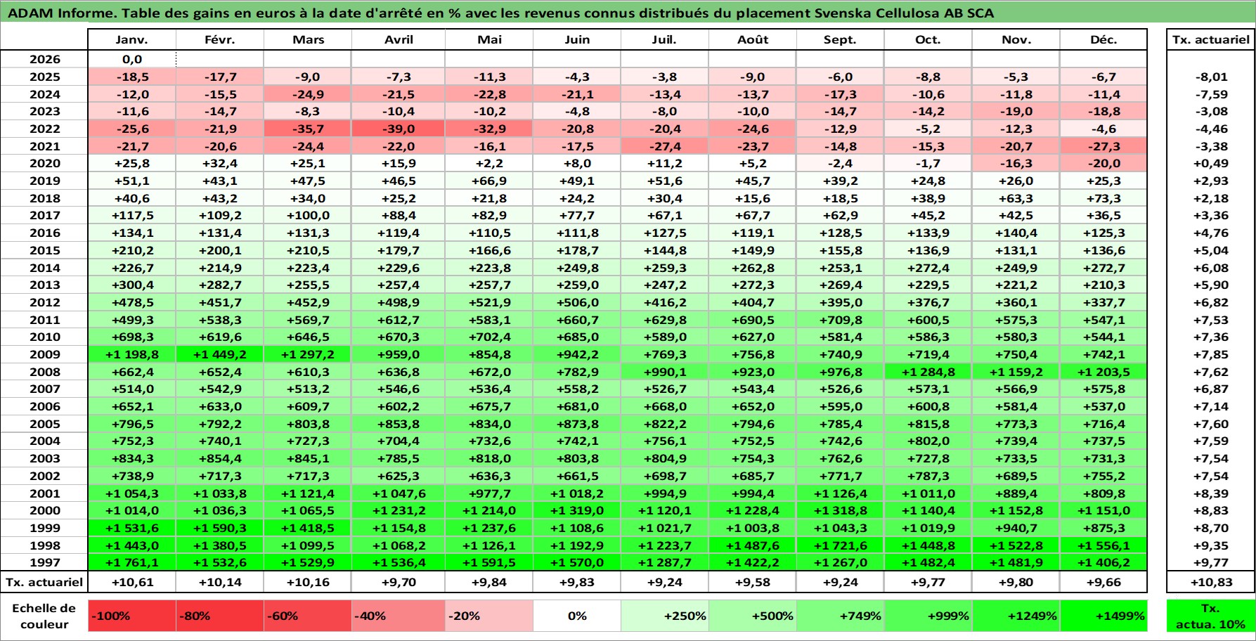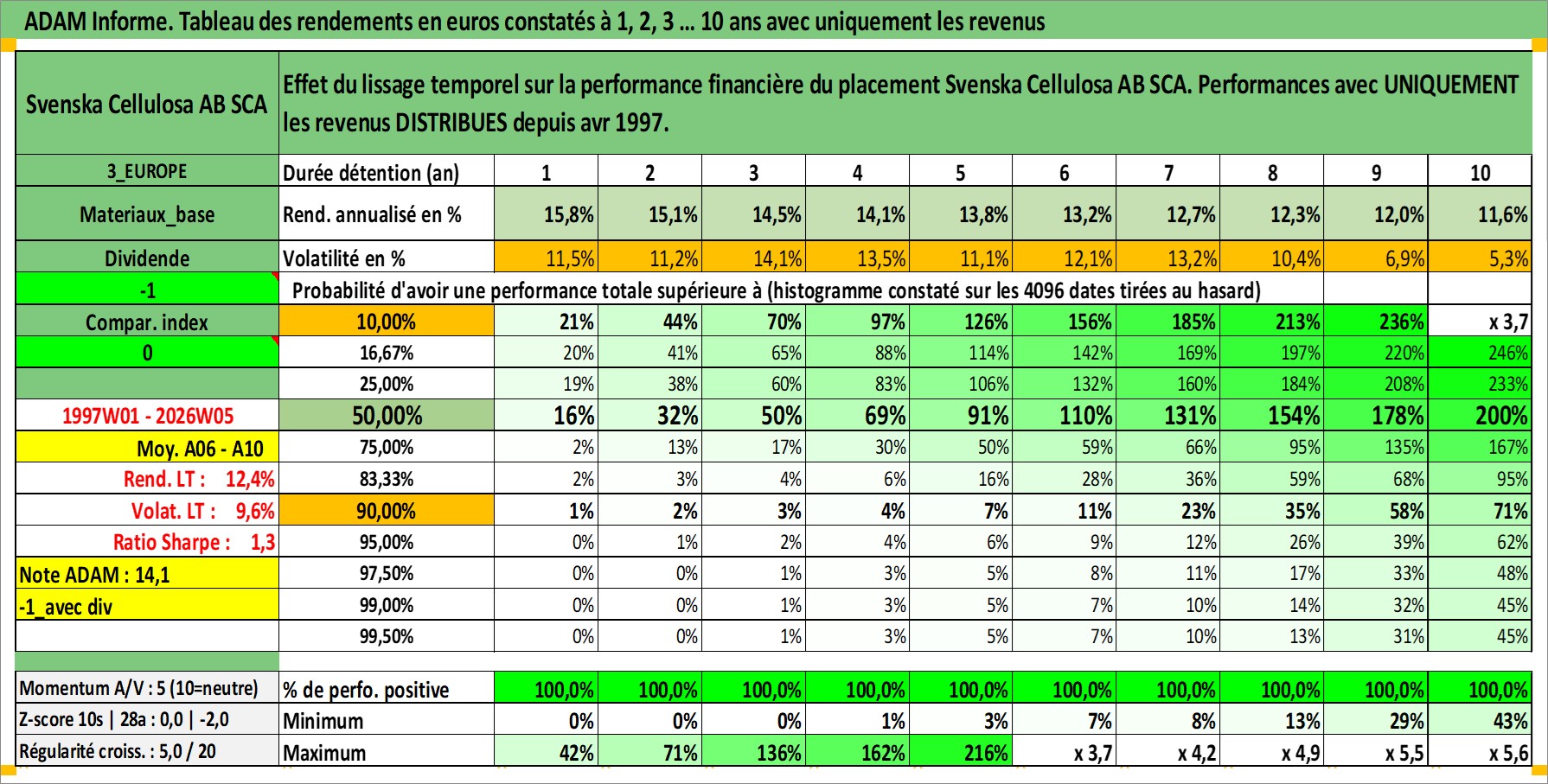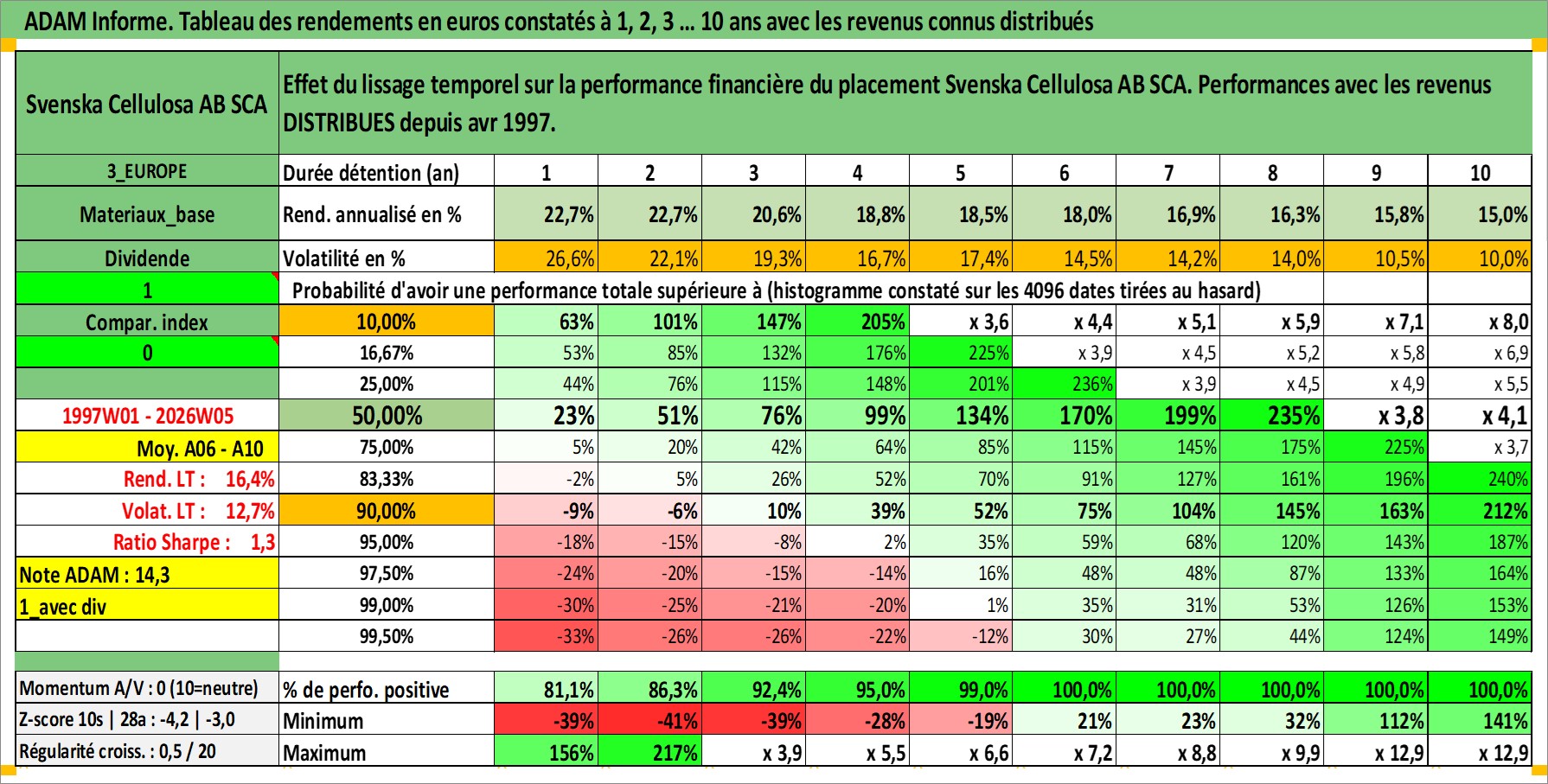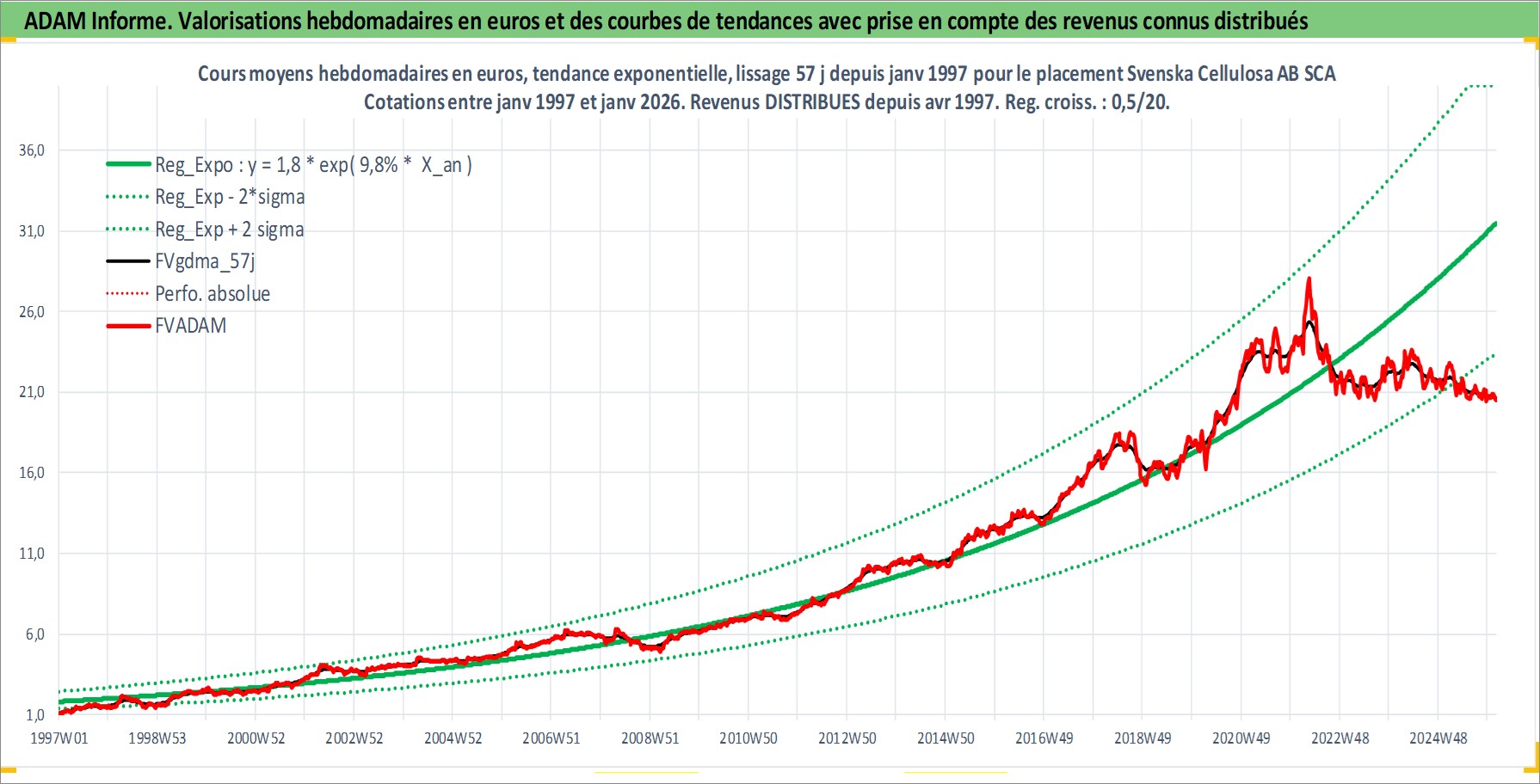 Site dédié aux investisseursPage dédiée sur site financeAnalyse des valorisations hebdomadaires de l'action Svenska Cellulosa AB SCA. Cet actif est cote en SEK. Les valorisations sont en contrevaleur EURO et couvrent les semaines 1997W01 a 2026W05. Les revenus de cet actif financier sont pris en compte depuis la semaine 1997W18. La note globale ESG de cet actif est estimee a 11.0 (apres rebasage entre 0 et 20).