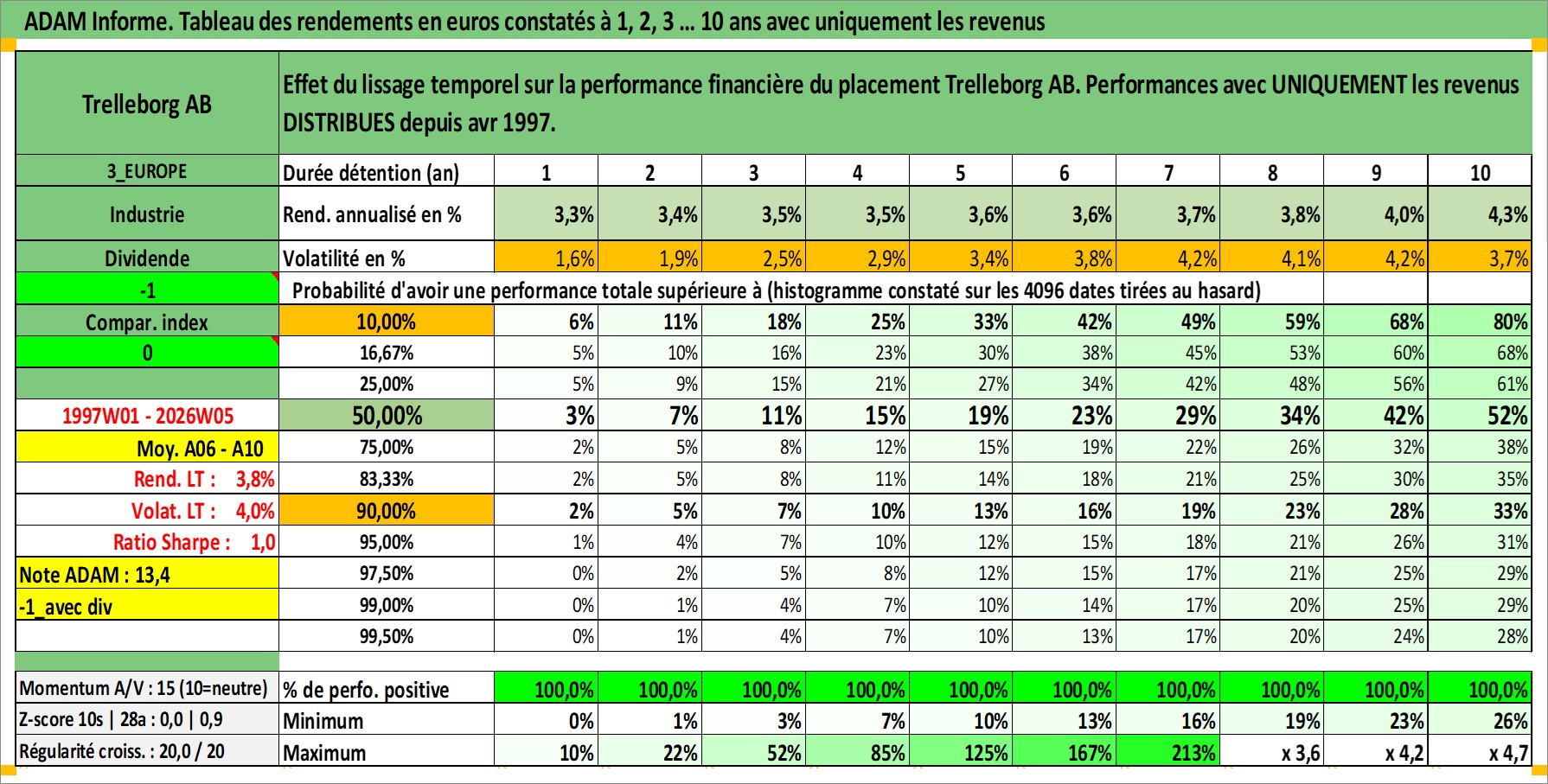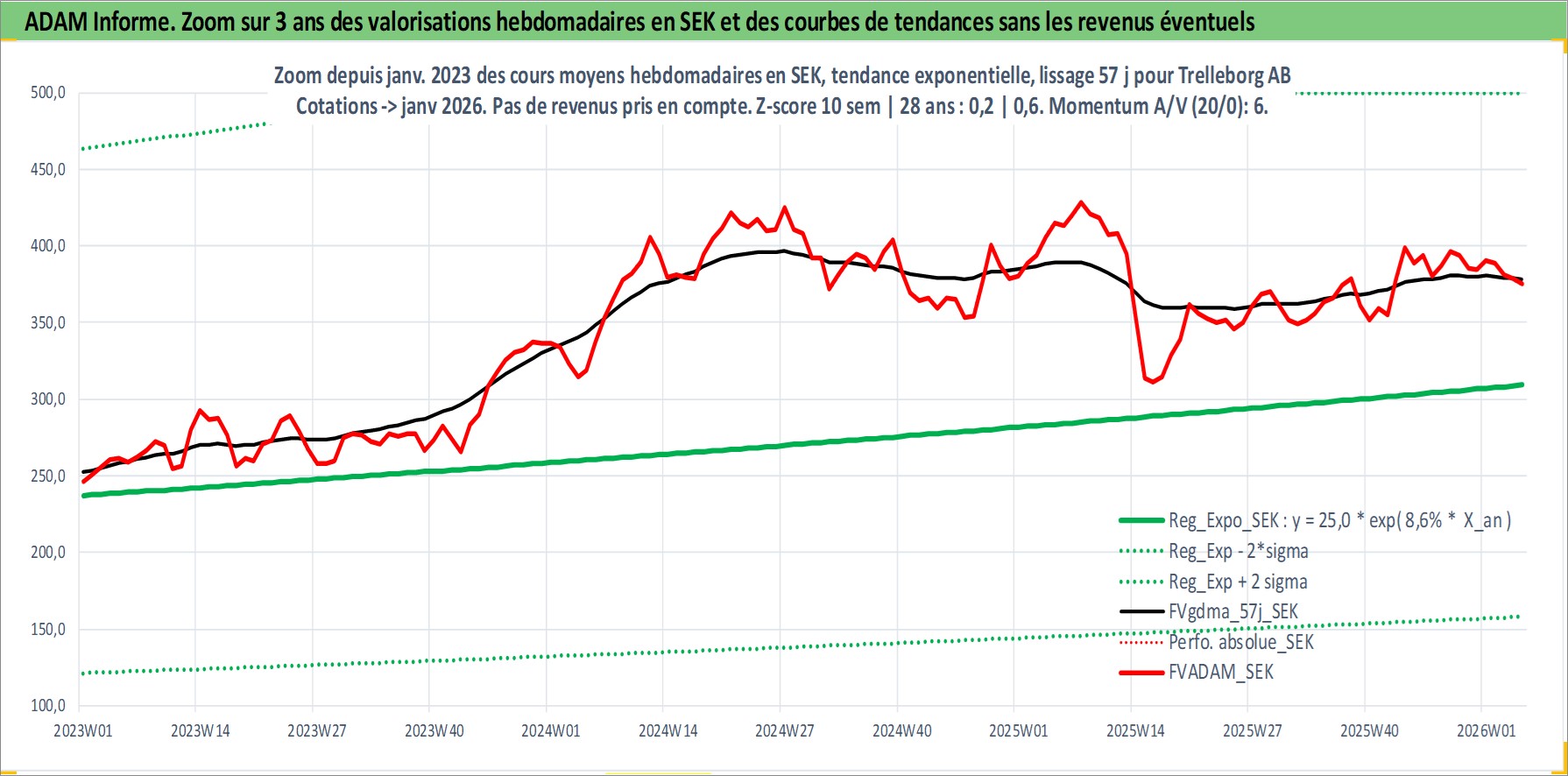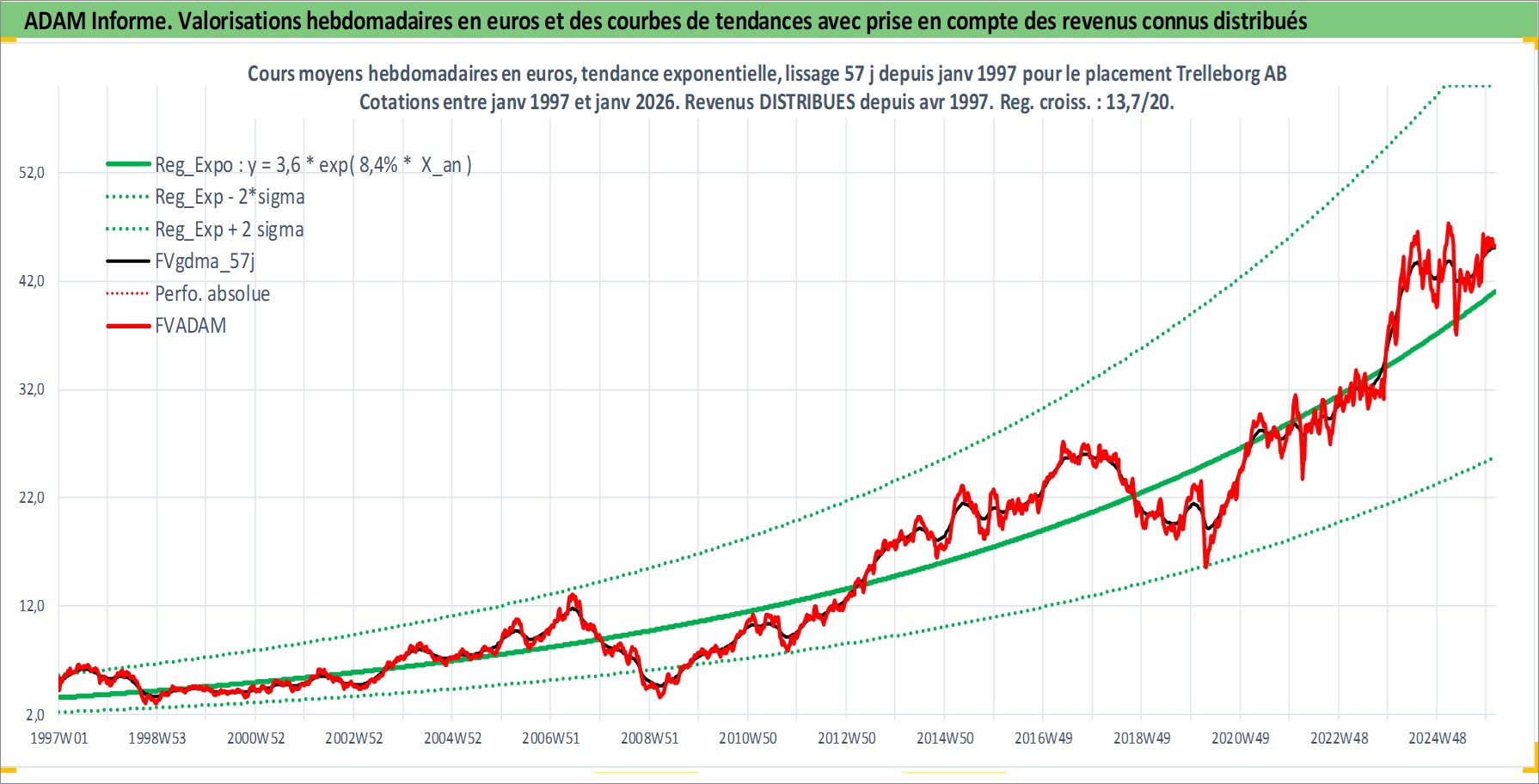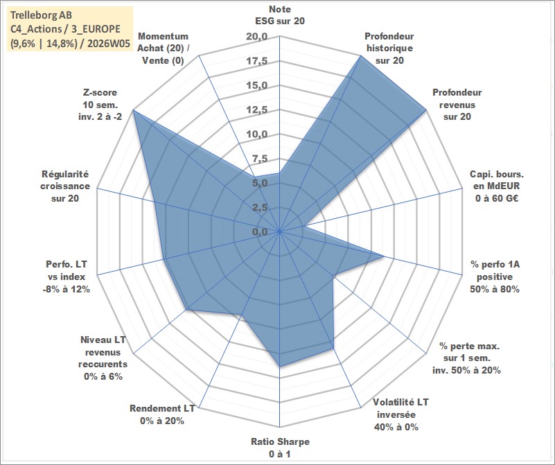 Site dédié aux investisseursPage dédiée sur site financeAnalyse des valorisations hebdomadaires de l'action Trelleborg AB. Cet actif est cote en SEK. Les valorisations sont en contrevaleur EURO et couvrent les semaines 1997W01 a 2026W05. Les revenus de cet actif financier sont pris en compte depuis la semaine 1997W18. La note globale ESG de cet actif est estimee a 6.0 (apres rebasage entre 0 et 20).