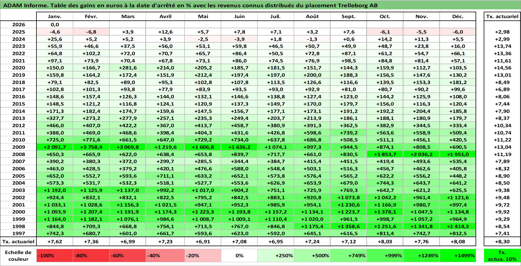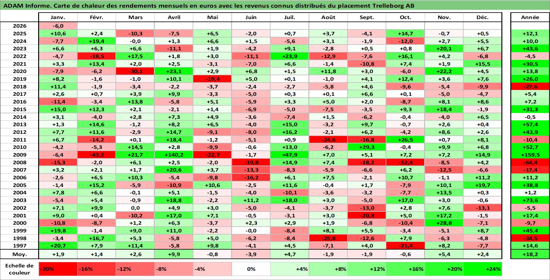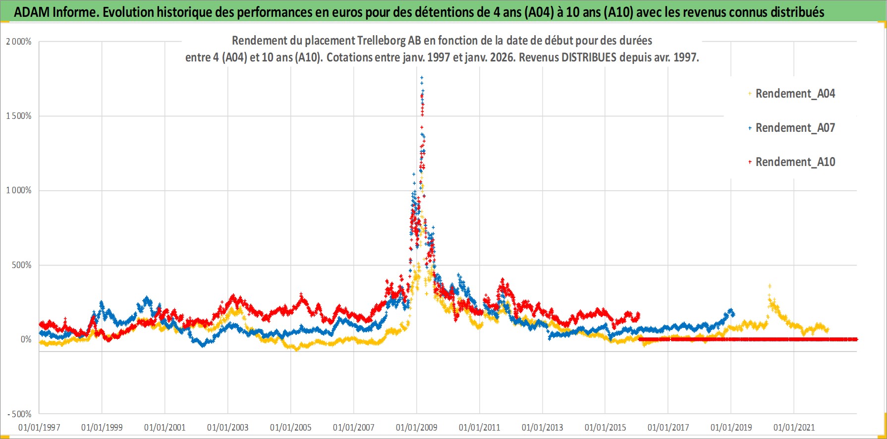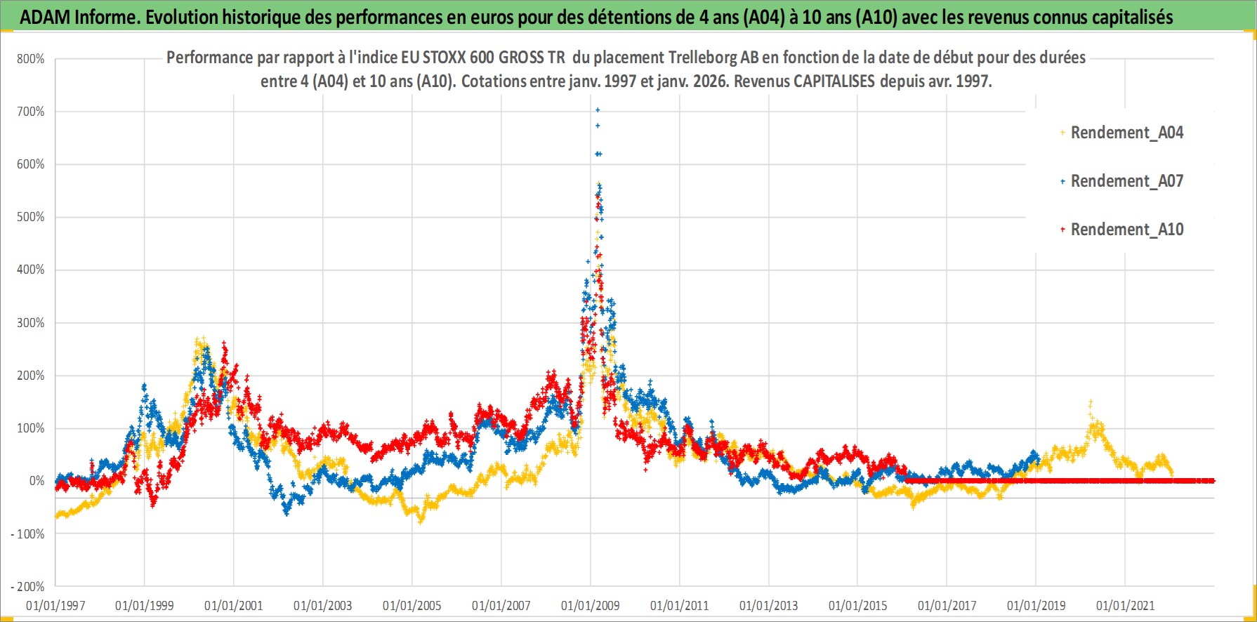 Site dédié aux investisseursPage dédiée sur site financeAnalyse des valorisations hebdomadaires de l'action Trelleborg AB. Cet actif est cote en SEK. Les valorisations sont en contrevaleur EURO et couvrent les semaines 1997W01 a 2026W05. Les revenus de cet actif financier sont pris en compte depuis la semaine 1997W18. La note globale ESG de cet actif est estimee a 6.0 (apres rebasage entre 0 et 20).