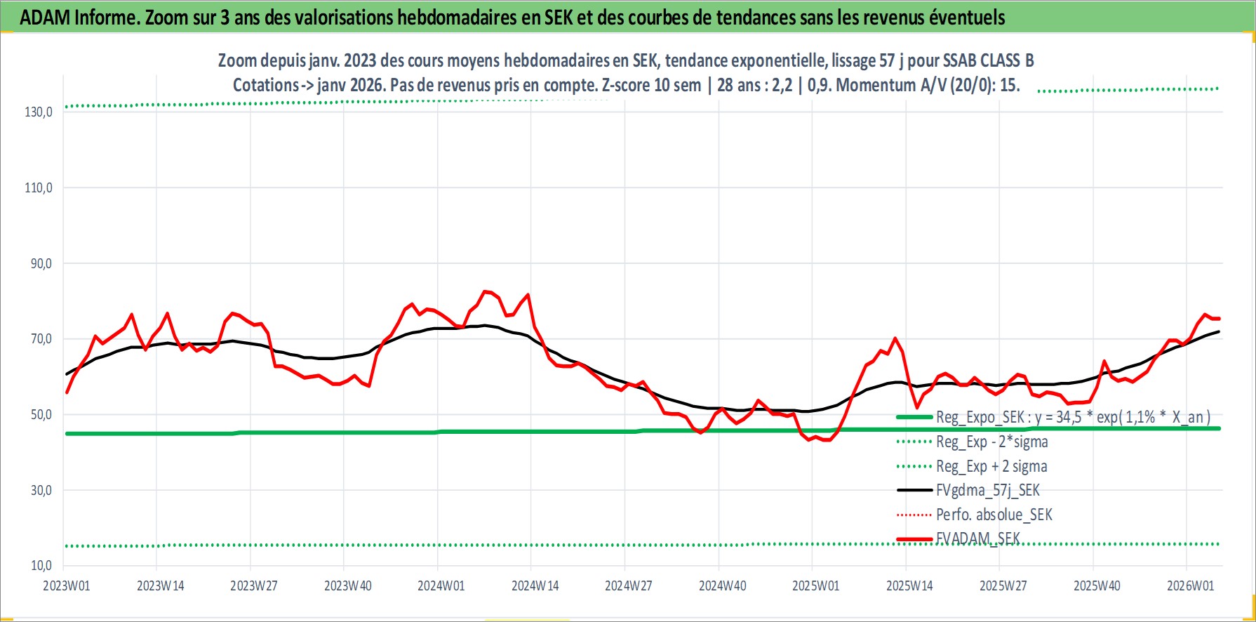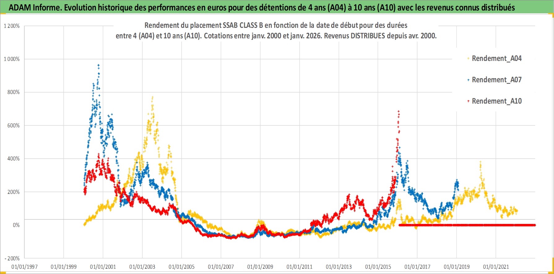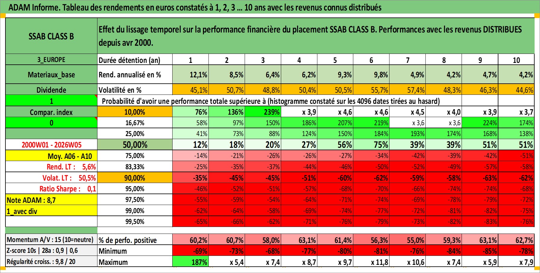 Site dédié aux investisseursPage dédiée sur site financeAnalyse des valorisations hebdomadaires de l'action SSAB CLASS B. Cet actif est cote en SEK. Les valorisations sont en contrevaleur EURO et couvrent les semaines 2000W01 a 2026W05. Les revenus de cet actif financier sont pris en compte depuis la semaine 2000W17. La note ESG de cet actif n'est pas connue.