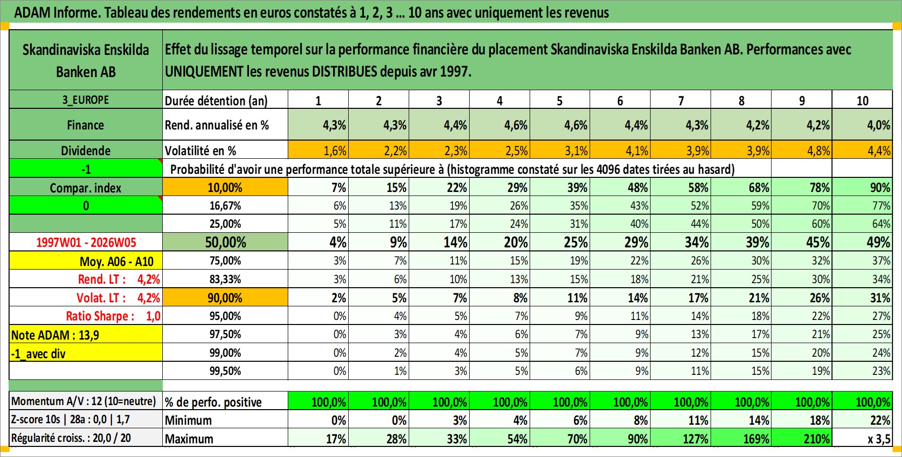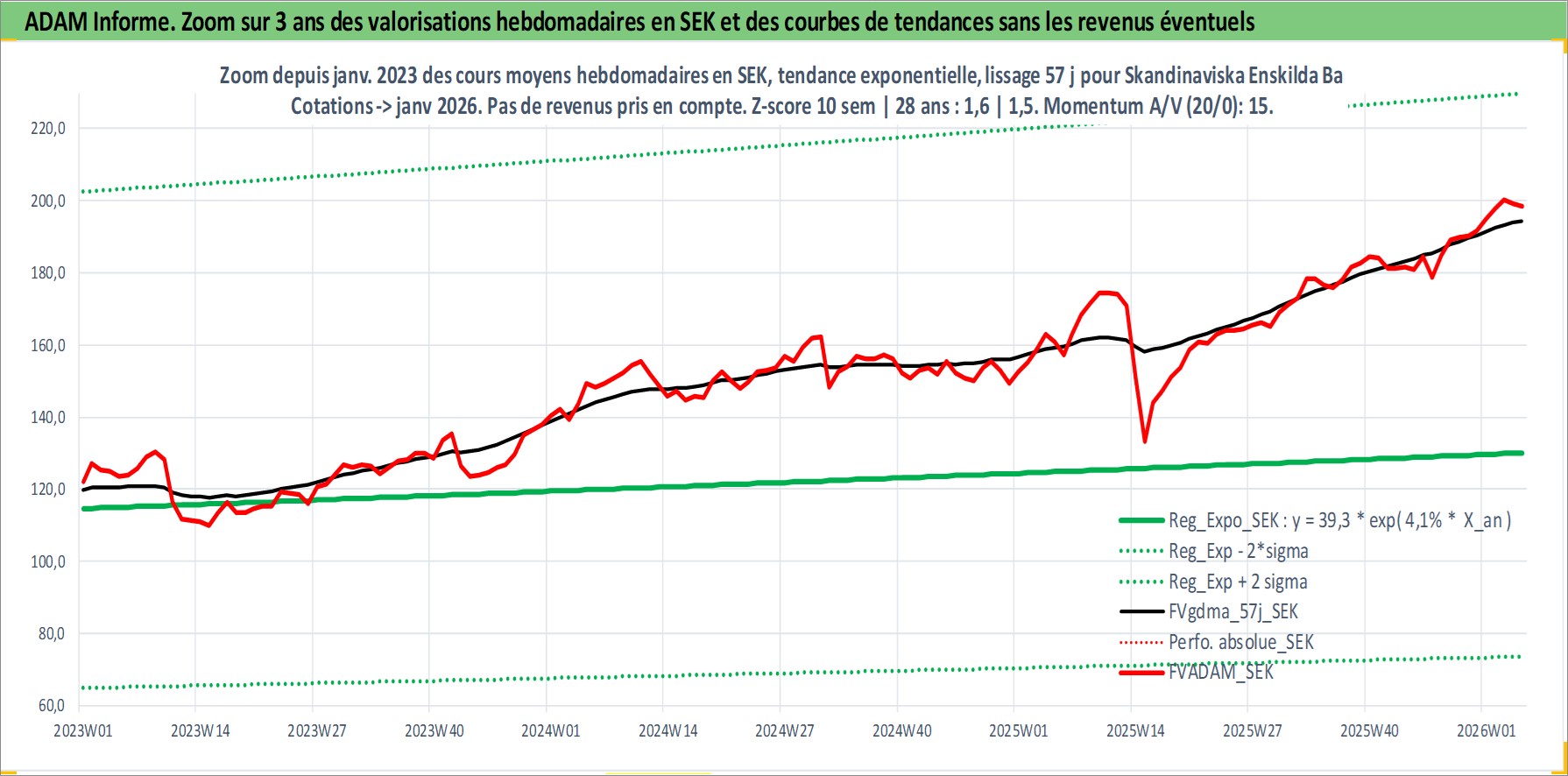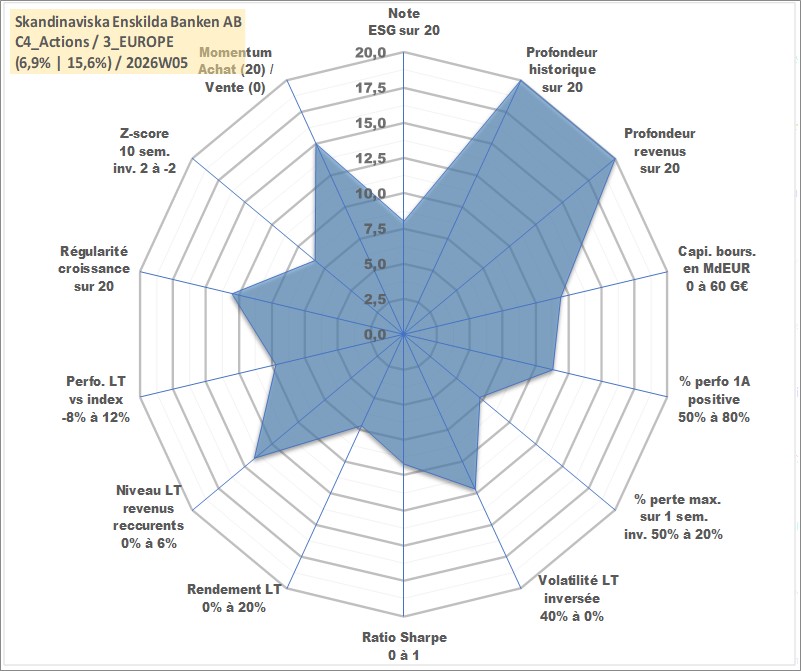 Site dédié aux investisseursPage dédiée sur site financeAnalyse des valorisations hebdomadaires de l'action Skandinaviska Enskilda Banken AB. Cet actif est cote en SEK. Les valorisations sont en contrevaleur EURO et couvrent les semaines 1997W01 a 2026W05. Les revenus de cet actif financier sont pris en compte depuis la semaine 1997W18. La note globale ESG de cet actif est estimee a 8.0 (apres rebasage entre 0 et 20).