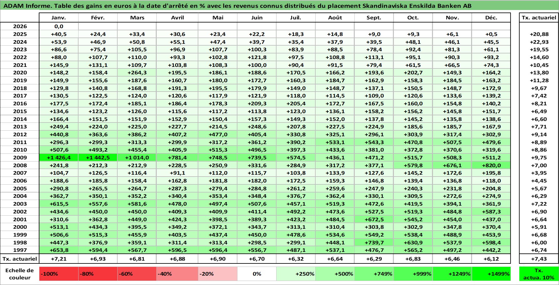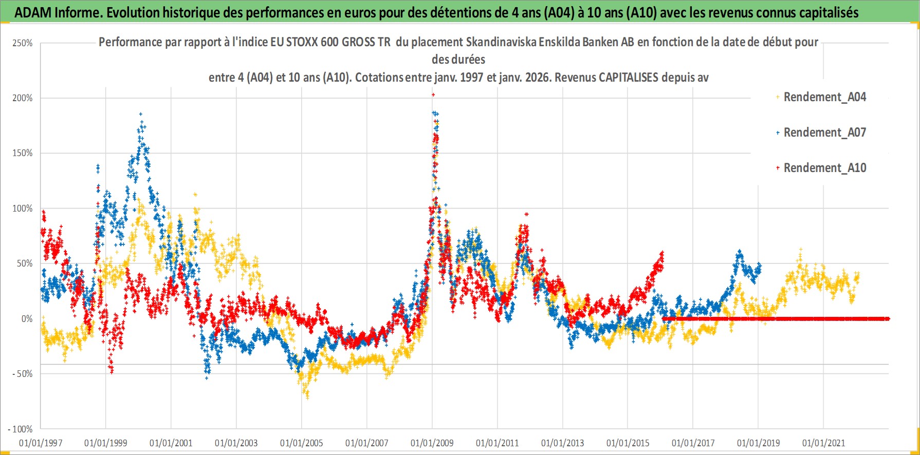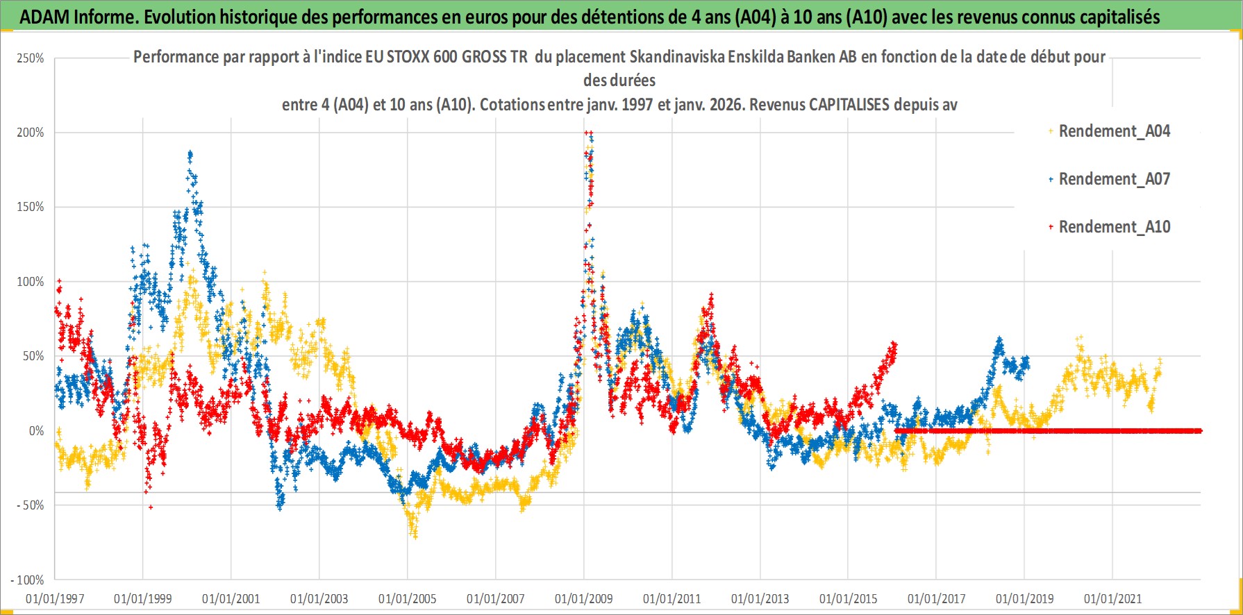 Site dédié aux investisseursPage dédiée sur site financeAnalyse des valorisations hebdomadaires de l'action Skandinaviska Enskilda Banken AB. Cet actif est cote en SEK. Les valorisations sont en contrevaleur EURO et couvrent les semaines 1997W01 a 2026W05. Les revenus de cet actif financier sont pris en compte depuis la semaine 1997W18. La note globale ESG de cet actif est estimee a 8.0 (apres rebasage entre 0 et 20).